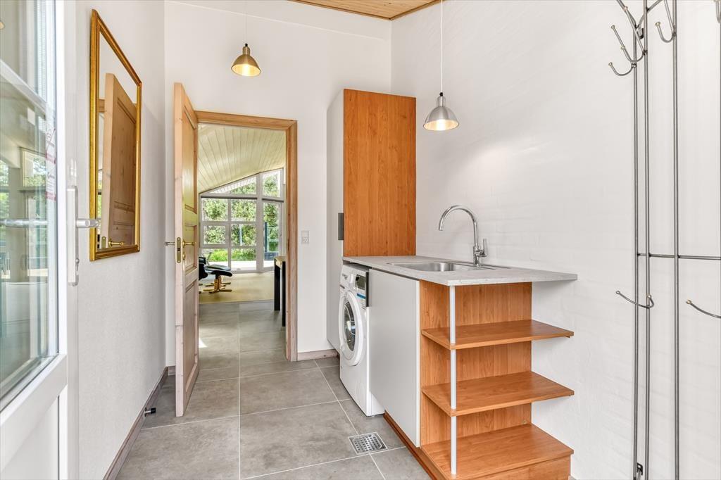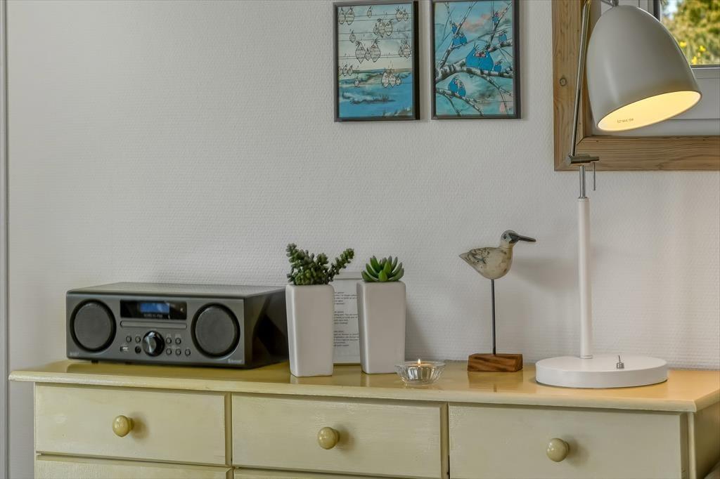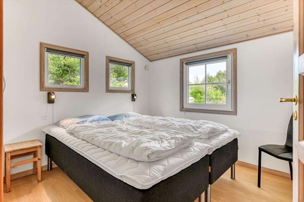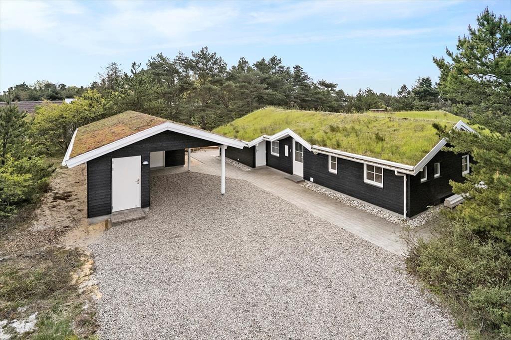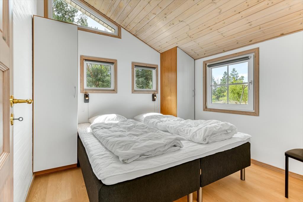Med tørv på taget og træfacade passer sommerhuset smukt ind i naturomgivelserne – og takket være husets store vinduespartier og ovenlysvinduer får I glæde af både sollyset og den grønne udsigt, når I hygger jer inden døre. Den gode planløsning gør det muligt at samles otte personer i huset, for der er nemlig fire gode soveværelser og to badeværelser til rådighed foruden en stor stue med åben køkkenafdeling. Soveværelserne er alle indrettet med komfortable dobbeltsenge, og på det største af de to badeværelser kan I forkæle jer selv med en saunatur såvel som et tilbagelænet badekar. Stuen indbyder til sofahygge for hele familien – eventuelt med ild i brændeovnen, hvis vejret lægger op til det, og som en praktisk detalje er der både vaskemaskine og tørretumbler i bryggerset.