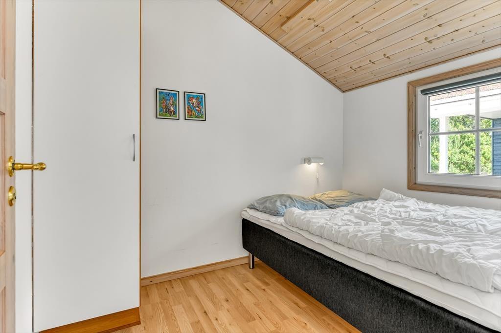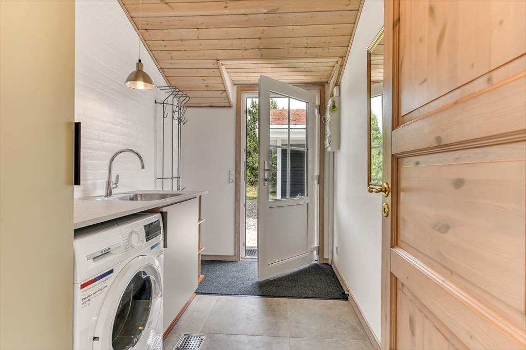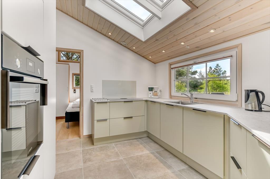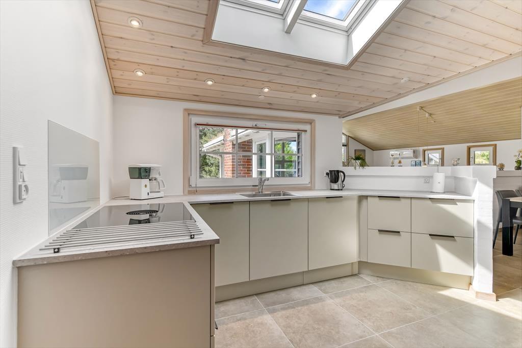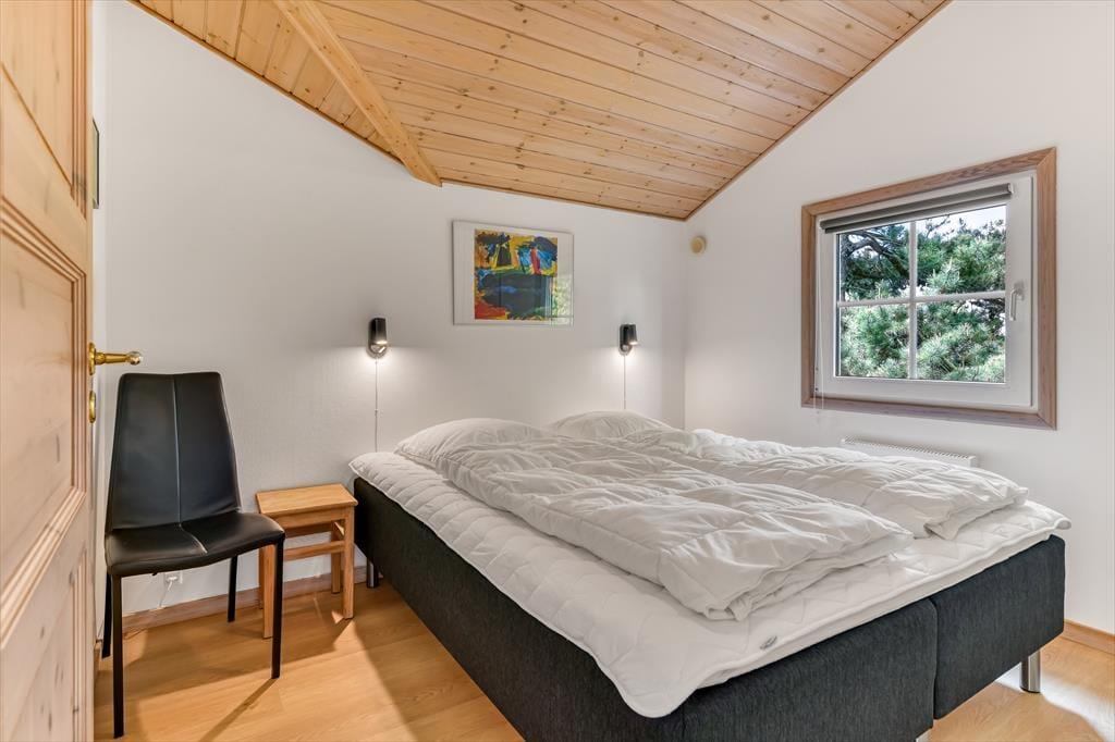 Med tørv på taget og træfacade passer sommerhuset smukt ind i naturomgivelserne – og takket være husets store vinduespartier og ovenlysvinduer får I glæde af både sollyset og den grønne udsigt, når I hygger jer inden døre. Den gode planløsning gør det muligt at samles otte personer i huset, for der er nemlig fire gode soveværelser og to badeværelser til rådighed foruden en stor stue med åben køkkenafdeling. Soveværelserne er alle indrettet med komfortable dobbeltsenge, og på det største af de to badeværelser kan I forkæle jer selv med en saunatur såvel som et tilbagelænet badekar. Stuen indbyder til sofahygge for hele familien – eventuelt med ild i brændeovnen, hvis vejret lægger op til det, og som en praktisk detalje er der både vaskemaskine og tørretumbler i bryggerset.