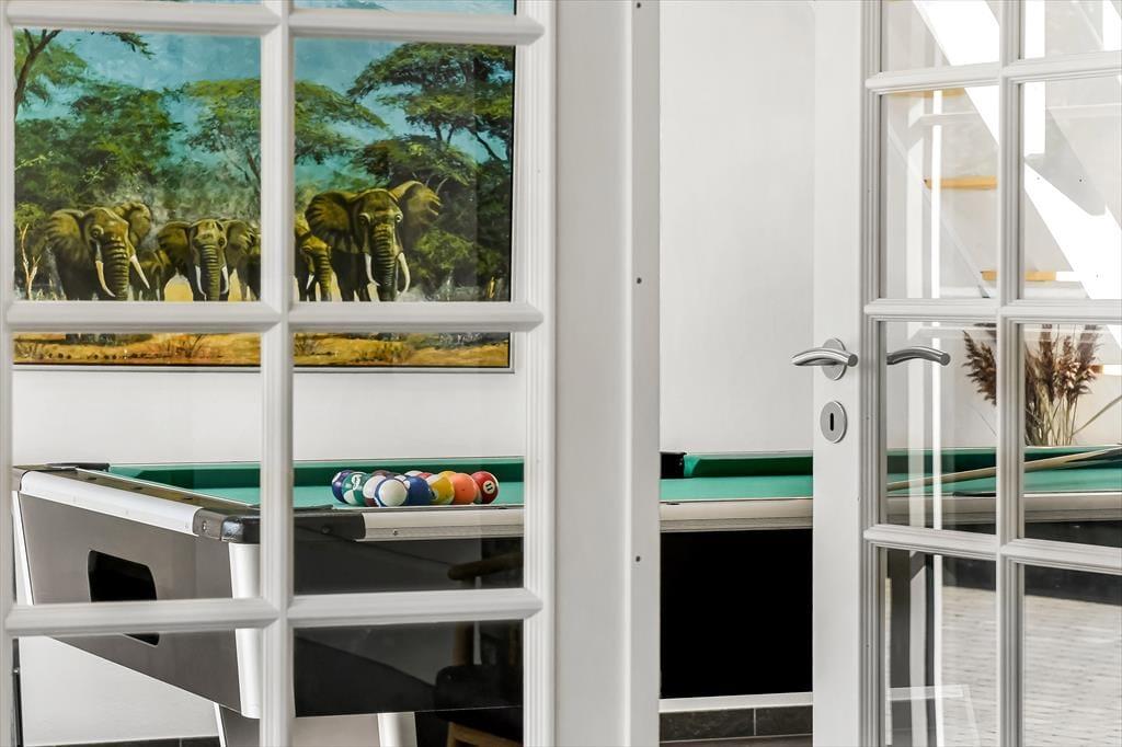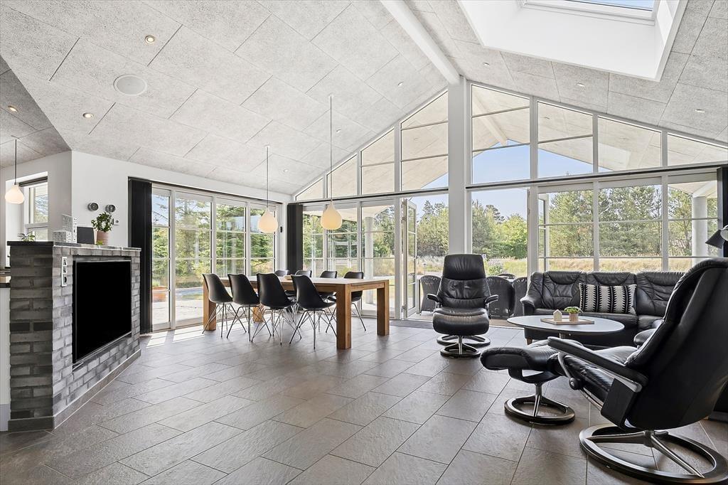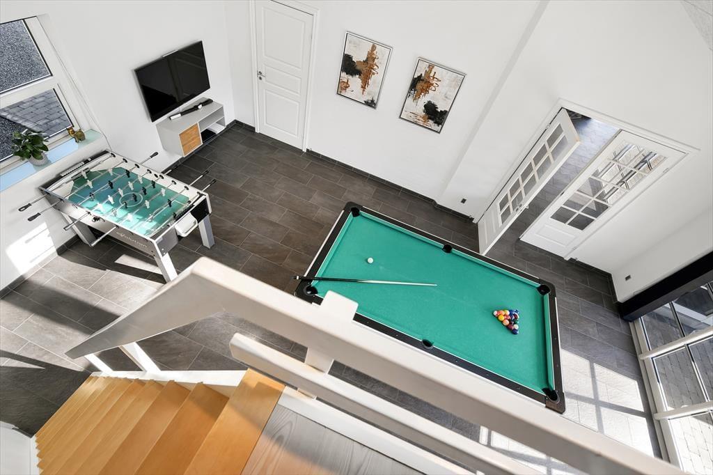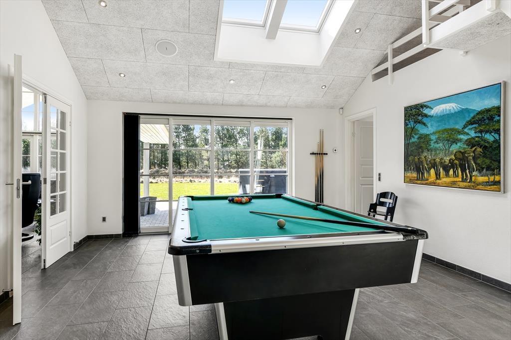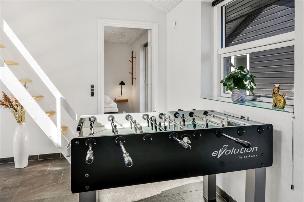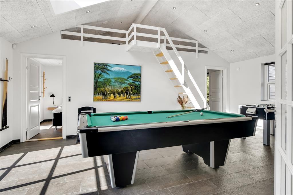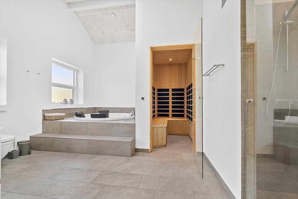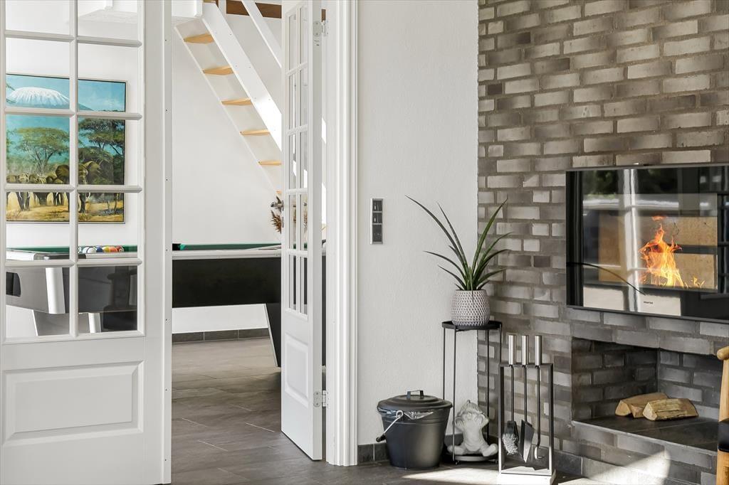 Det 196 m2 store sommerhus har en super planløsning med fire soveværelser, to badeværelser og en opholdsafdeling med aktivitetsrum, stue og åbent køkken. På praktisk vis ligger værelser og baderum godt fordelt, så huset kan oplagt bruges af to familier, der gerne vil holde ferie sammen – og der er ovenikøbet en hems i huset, som nemt kan blive en favorit for de lidt større børn eller teenagere. Aktivitetsrummet med poolbord og bordfodbold kan sikkert vække lykke hos en stor del af ferieselskabet, og når I ikke hygger jer her i spillebulen, kan I samles i den hyggelige stue, der er indrettet med indbygningspejs og har direkte udgang til terrassen. På det største badeværelse er der både sauna og spabad. Sidstnævnte fyldes med vand fra jordvarmeanlægget, der også er tilkobet gulvvarmen, som findes overalt i huset – hvilket ikke bare er smart, men også er et energivenligt træk ved sommerhuset.