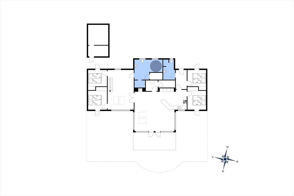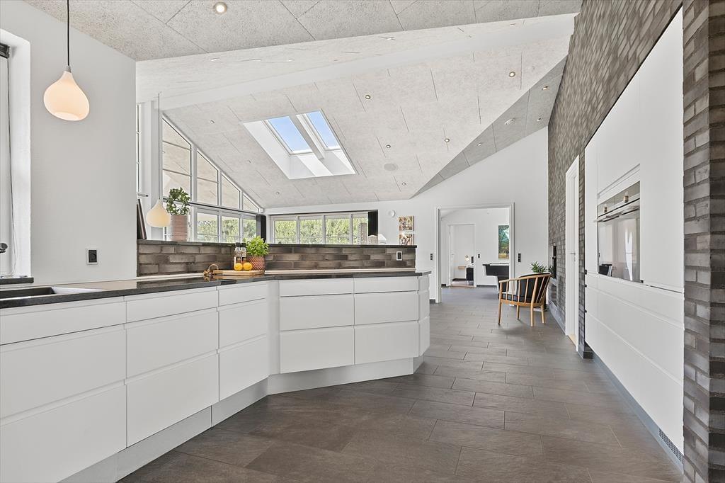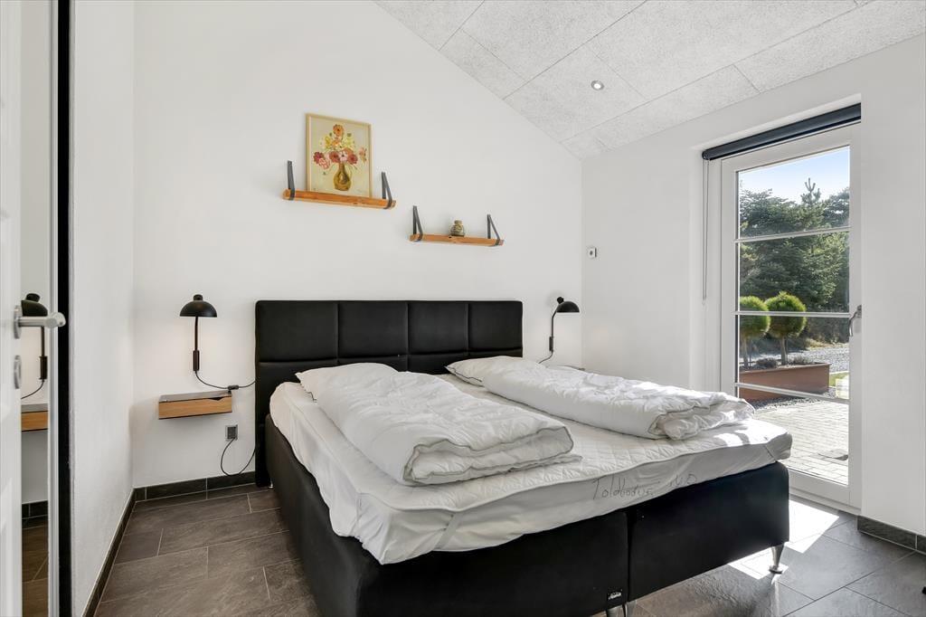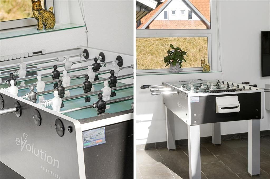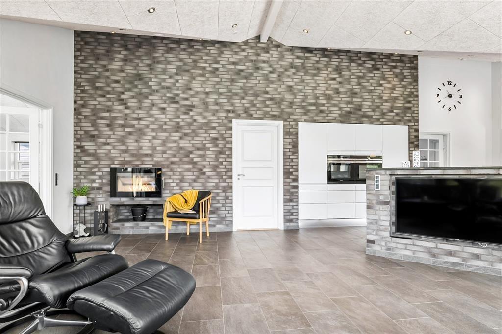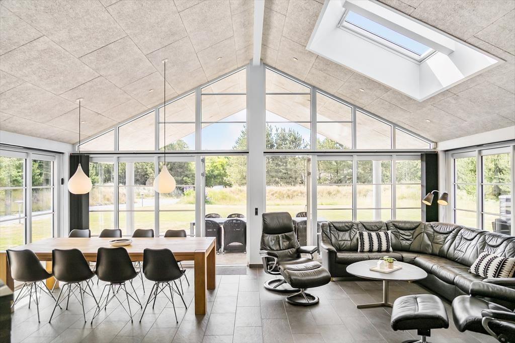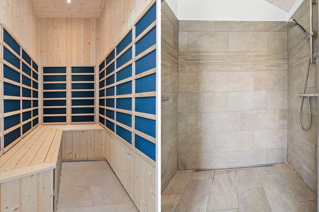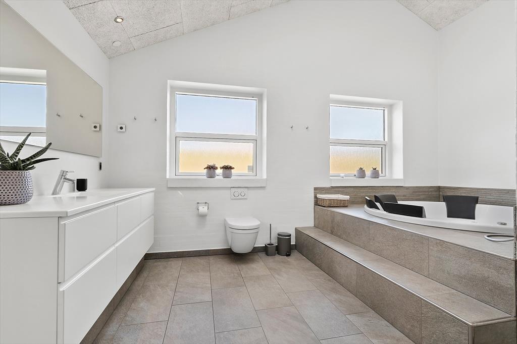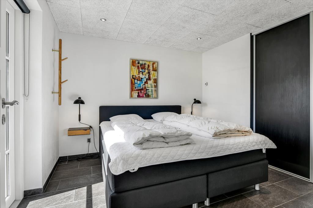 Det 196 m2 store sommerhus har en super planløsning med fire soveværelser, to badeværelser og en opholdsafdeling med aktivitetsrum, stue og åbent køkken. På praktisk vis ligger værelser og baderum godt fordelt, så huset kan oplagt bruges af to familier, der gerne vil holde ferie sammen – og der er ovenikøbet en hems i huset, som nemt kan blive en favorit for de lidt større børn eller teenagere. Aktivitetsrummet med poolbord og bordfodbold kan sikkert vække lykke hos en stor del af ferieselskabet, og når I ikke hygger jer her i spillebulen, kan I samles i den hyggelige stue, der er indrettet med indbygningspejs og har direkte udgang til terrassen. På det største badeværelse er der både sauna og spabad. Sidstnævnte fyldes med vand fra jordvarmeanlægget, der også er tilkobet gulvvarmen, som findes overalt i huset – hvilket ikke bare er smart, men også er et energivenligt træk ved sommerhuset.