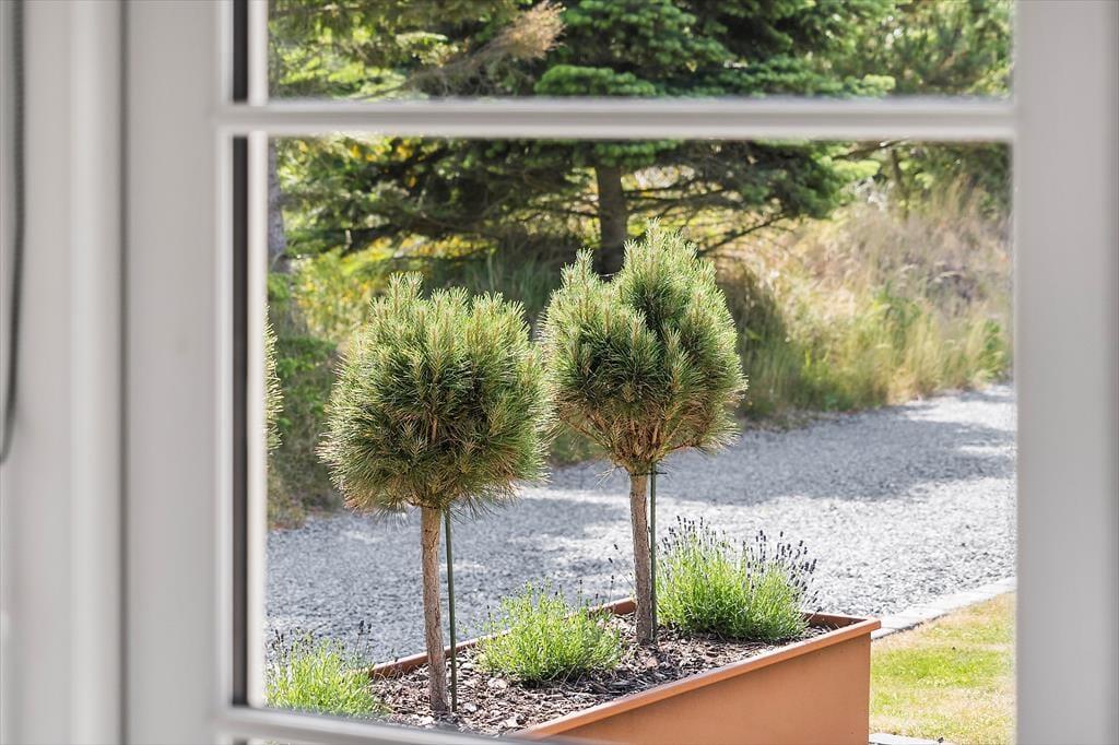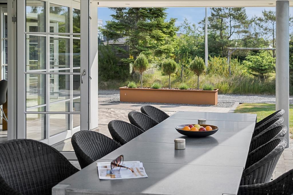 Den tjekkede stil fortsætter ude i det fri på den 2000 m2 store grund. Her er der masser af plads til at nyde livet på den delvist overdækkede terrasse, som ikke bare er udstyret med komfortable havemøbler og liggestole.