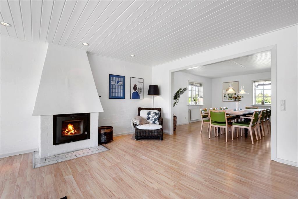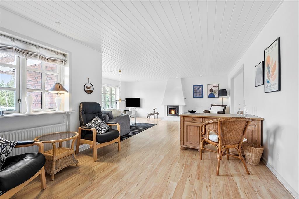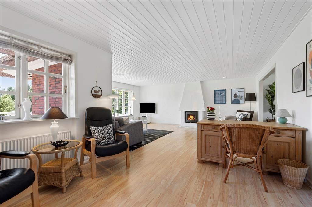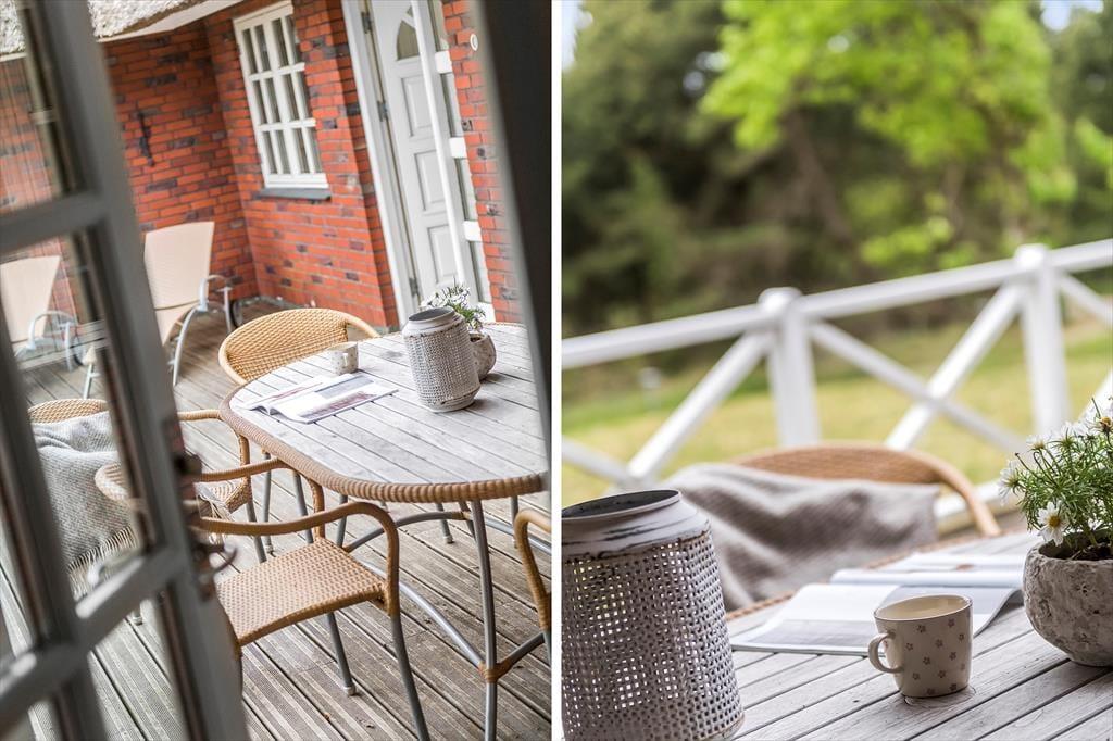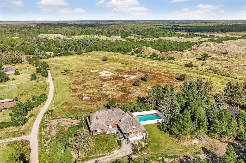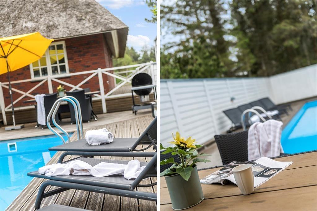 Det stråtækte sommerhus ligger på en kuperet grund, så en del af terrassemiljøet er hævet over jorden og har fin udsigt over jeres egen naturgrund og det omgivende landskab. Der er flere gode opholdspladser, men mon ikke I får lyst til at tilbringe en stor del af solskinstimerne i det afskærmede poolområde? Her kan I dase i liggestolene i timevis, kun afbrudt af et dyp i poolen eller en tur ind for at hente forfriskninger.
