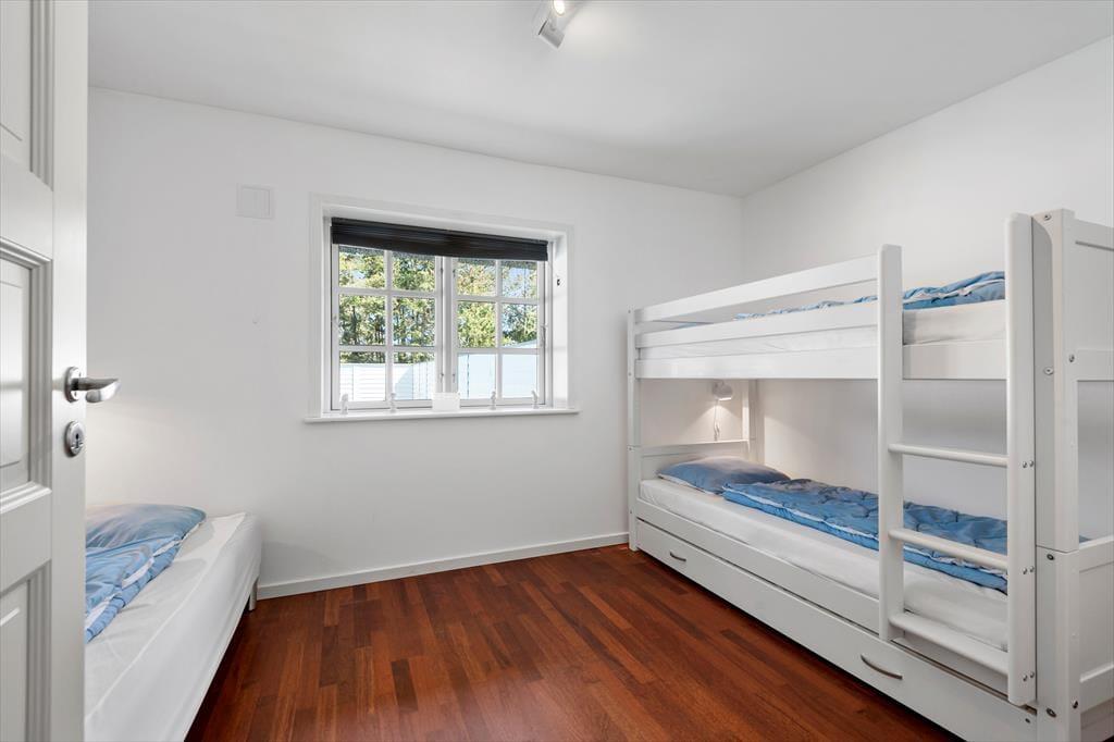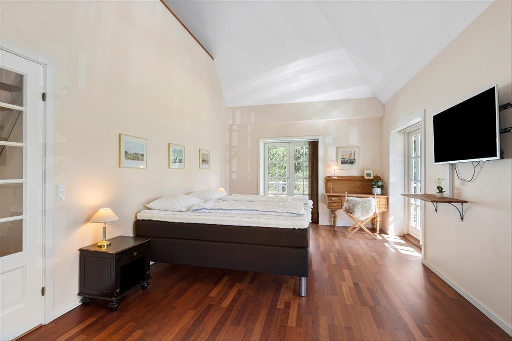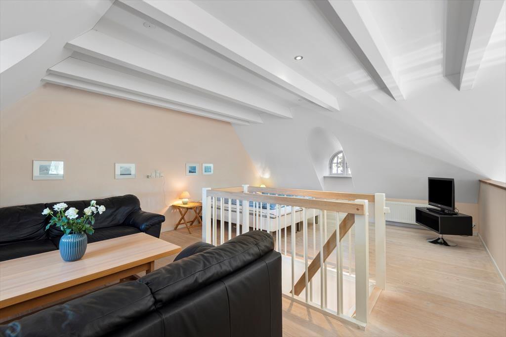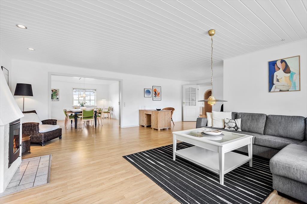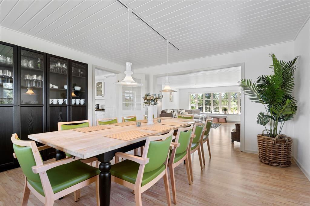 Det er bestemt ingen overdrivelse at kalde sommerhuset for stort, for inden døre kan I folde ferielivet ud på hele 300 m2. Det betyder, at I sagtens kan være 12 personer, så spørgsmålet er bare, om det er venner eller familie, I vil invitere med på ferie? Planløsningen er opdelt i flere niveauer, og stueplan er klart det største. Her er der to badeværelser, to gæstetoiletter og fire soveværelser, hvoraf det ene har åben forbindelse til en hems med dobbeltseng. Opholdsafdelingen består af et spisekøkken og en spisestue med direkte adgang til en stor opholdsstue med indbygningspejs, fladskærms-tv og komfortable siddemøbler.