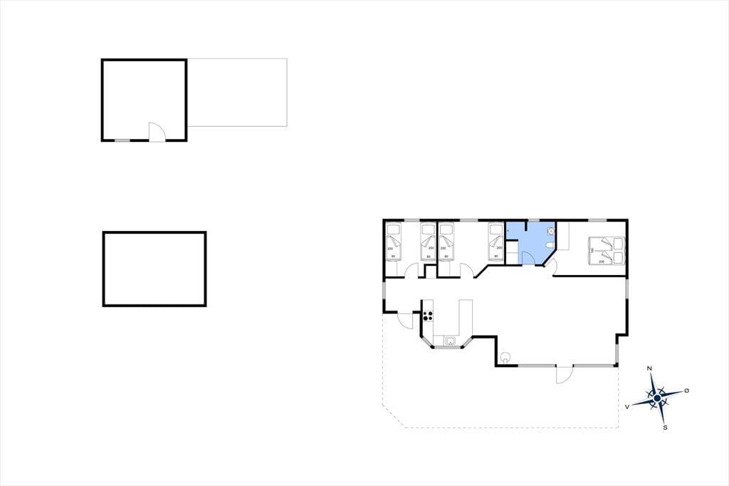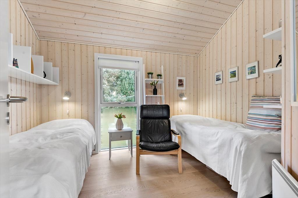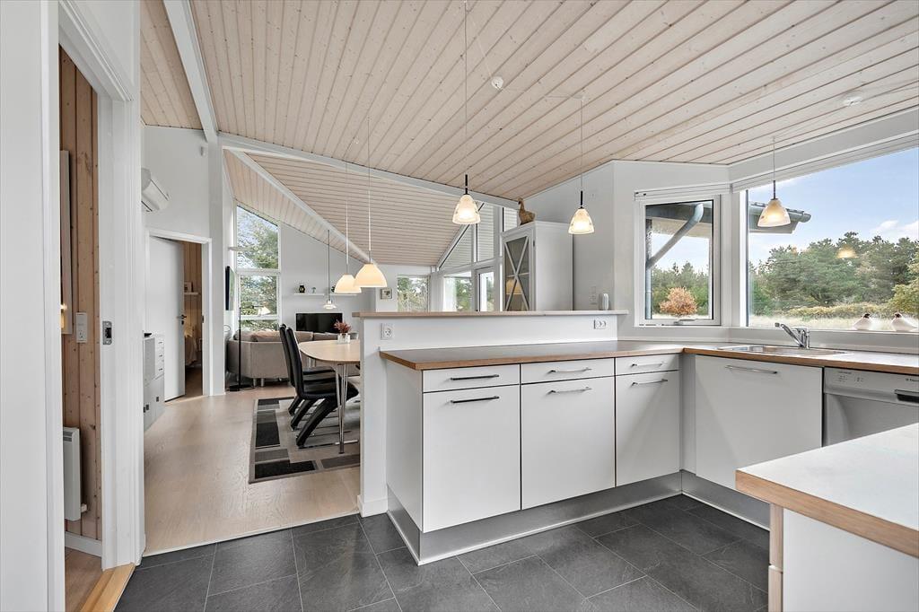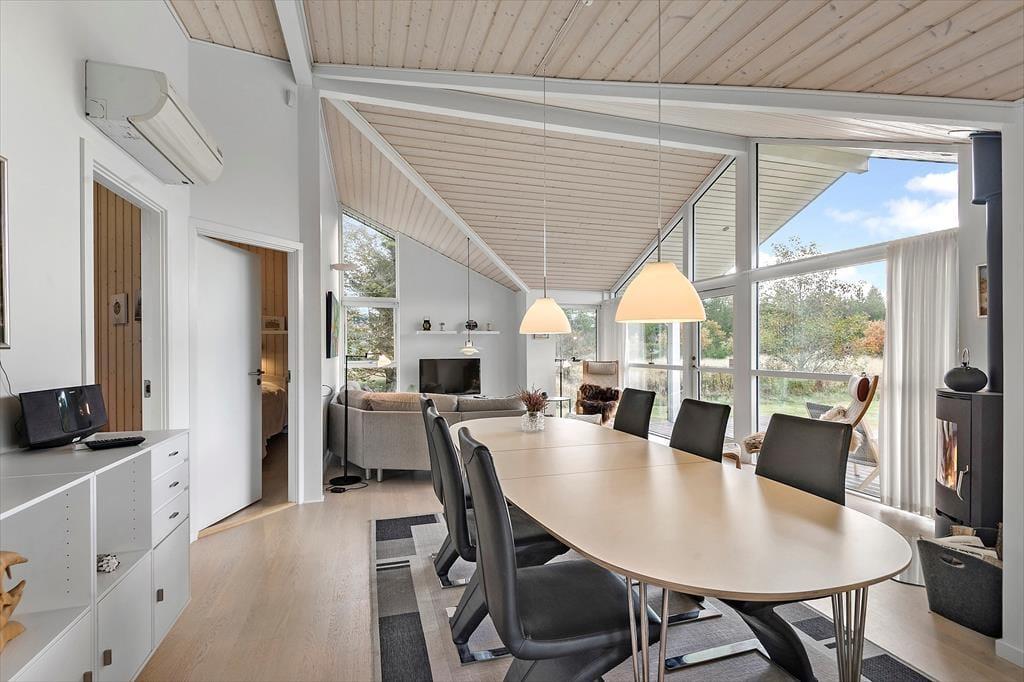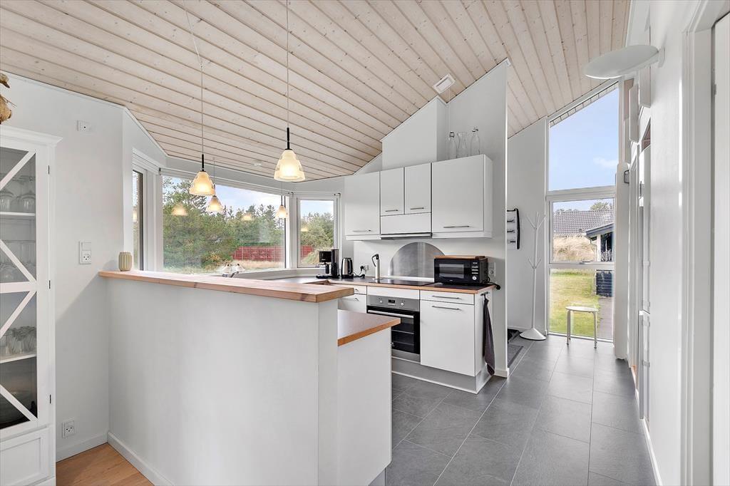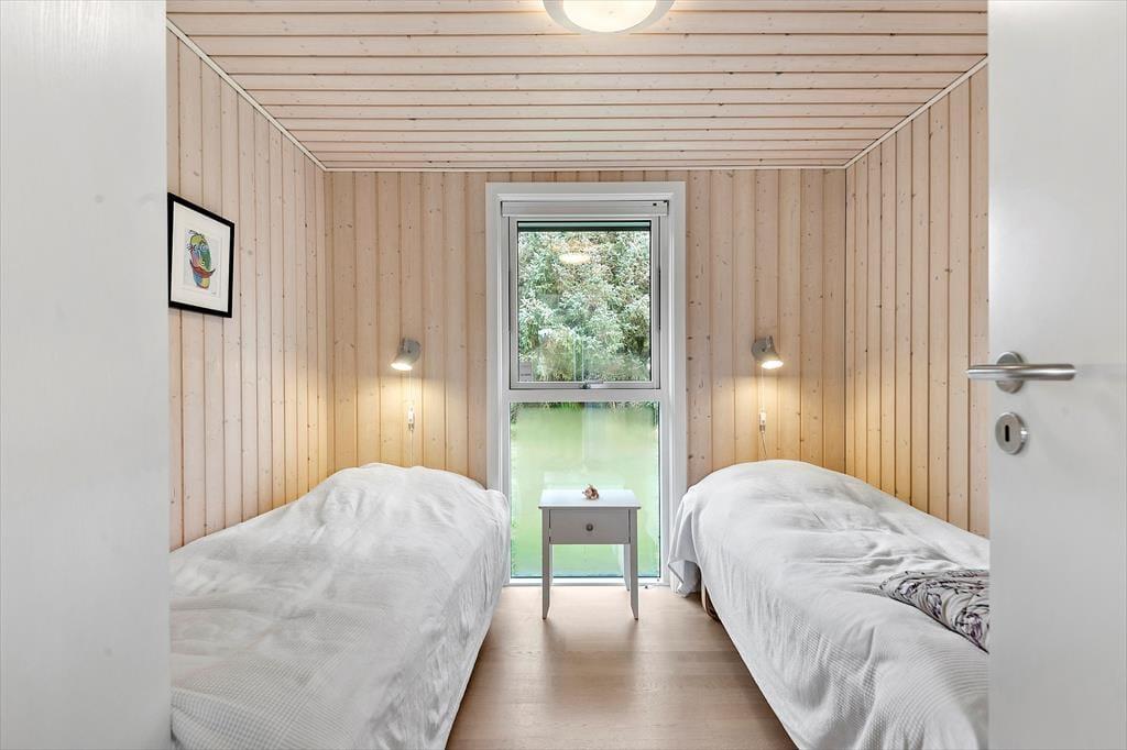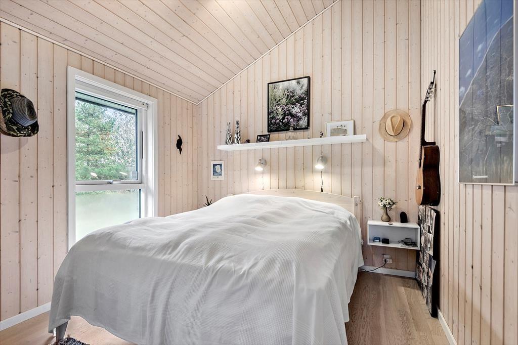Sommerhuset er et velbygget eksemplar fra 2012, og det måler 85 m2. Planløsningen består helt enkelt af tre soveværelser, et badeværelse og en stor stue med integreret køkken, og de er alle gode og reelle rum med en rar atmosfære. To af soveværelserne er hver især indrettet med to enkeltsenge, og på det tredje står en dobbeltseng. Badeværelset er med bruseniche, vaskemaskine og gulvvarme, og i det åbne køkken har I alt, hvad I skal bruge for at fremtrylle noget lækkert til feriens små og store måltider. Når det er spisetid, kan I samles om spisebordet nær stuens brændeovn, og bagefter kan I blive siddende længe for at hyggesnakke og spille kort – med mindre I foretrækker at rykke over i sofaen for at flade ud, læse eller se film på fladskærms-tv’et.