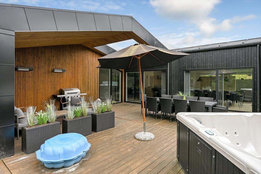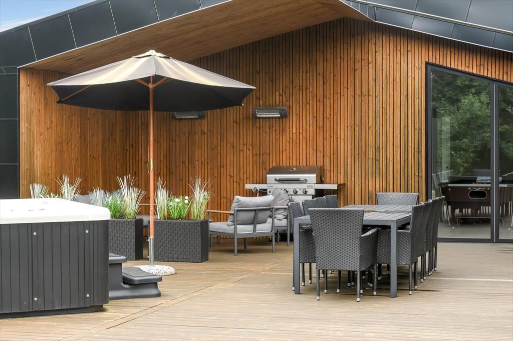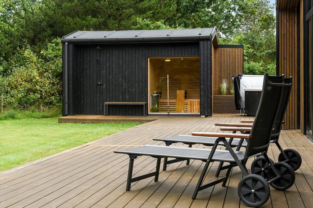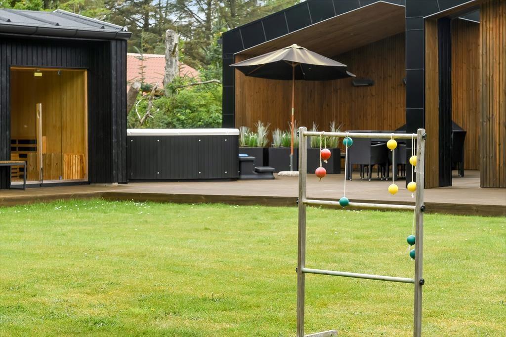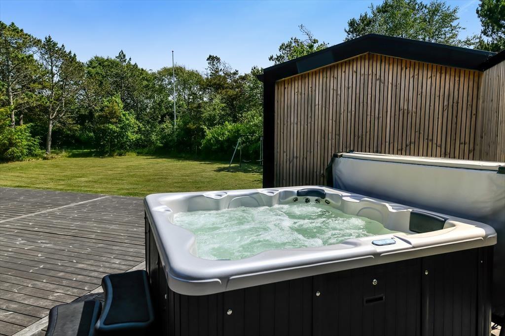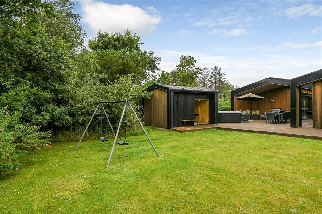 De luksuriøse forhold fortsætter ude i det fri på den 1639 m2 store naturgrund. Her kan I se frem til at nyde livet på det lækre terrassemiljø, der byder på både åbne og overdækkede opholdspladser såvel som et wellnessområde med spa, sauna og udebruser. I kan også hygge jer med et spil petanque på grunden, inden I går I gang med at tilberede aftensmaden på grillen. Har I børn med på ferie, kan de hygge sig med at gynge og lege i sandkassen – og når de yngste er blevet puttet om aftenen, kan de voksne forkæle sig selv med saunature og et varmt spabad under stjernehimlen.