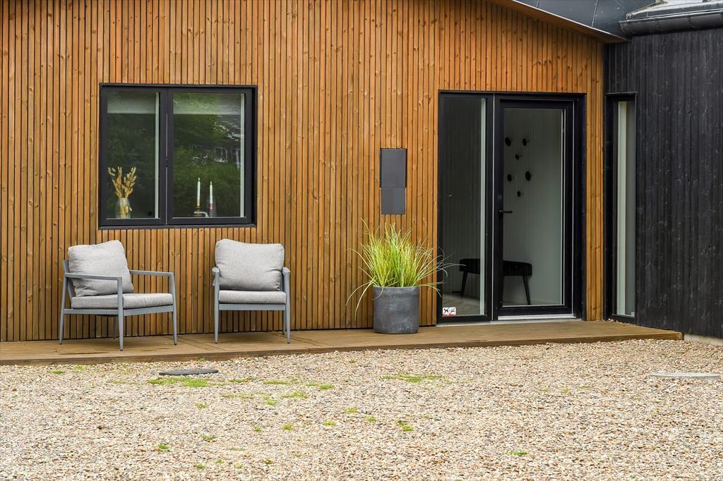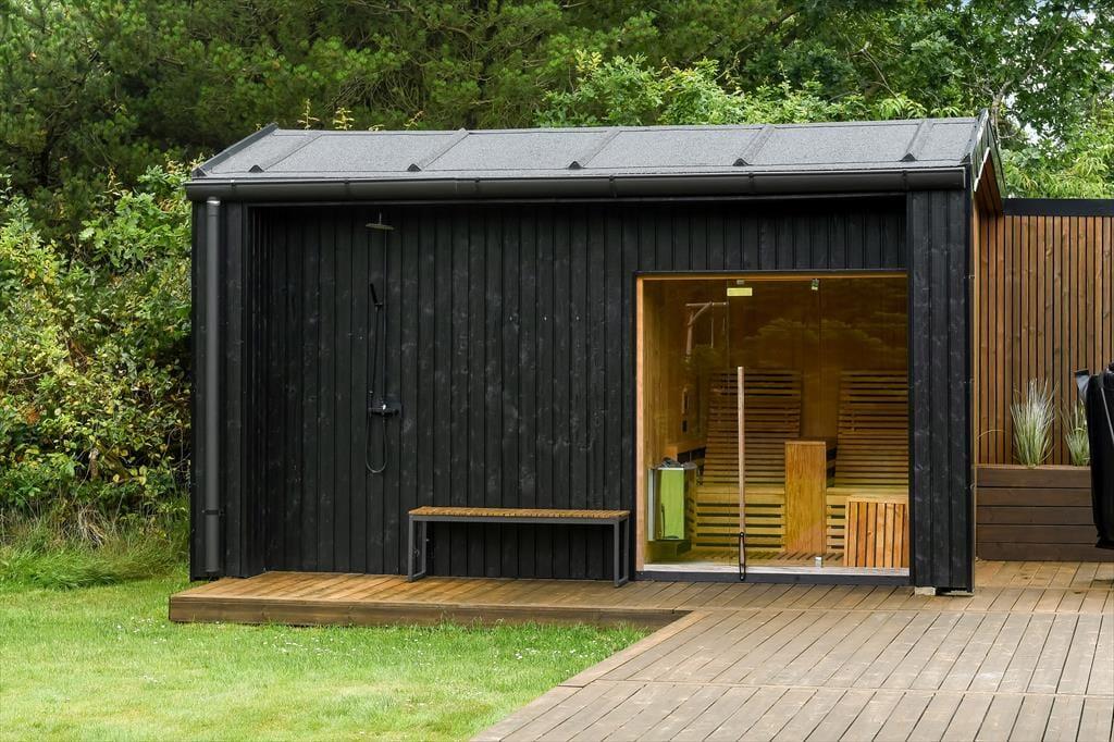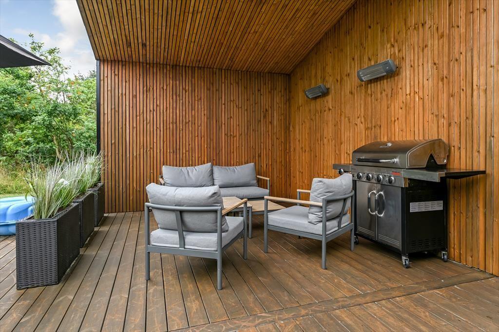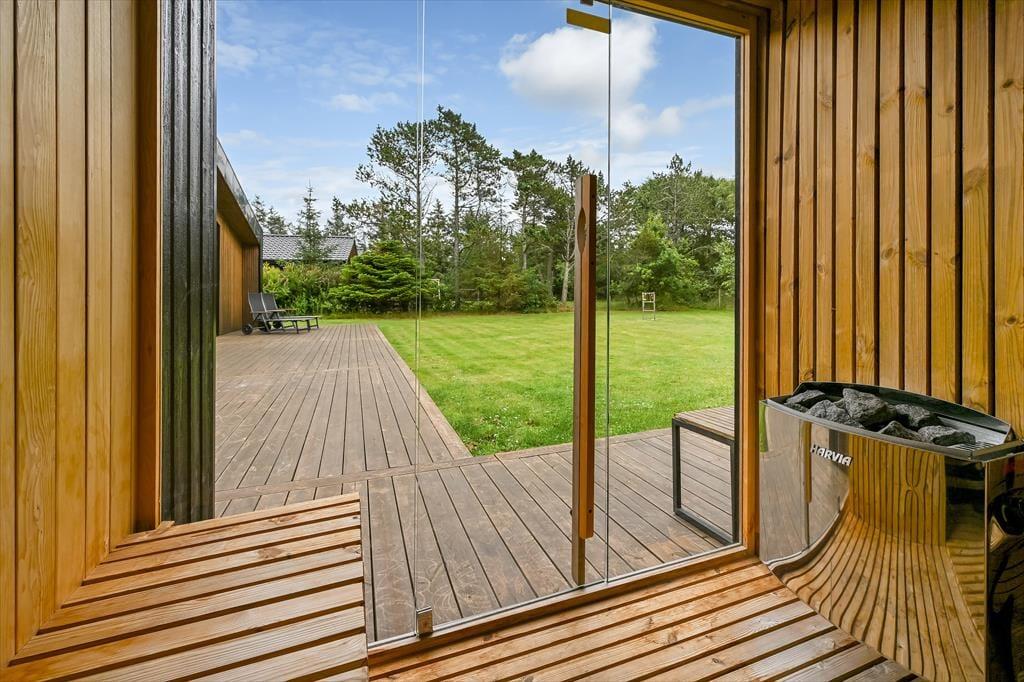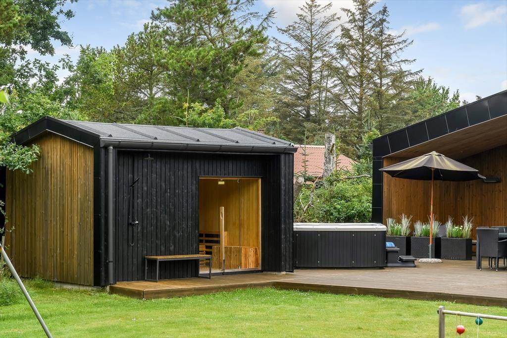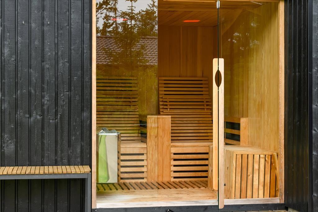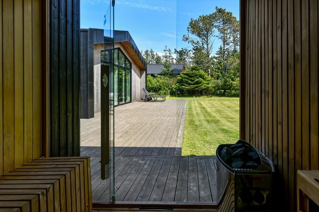 De luksuriøse forhold fortsætter ude i det fri på den 1639 m2 store naturgrund. Her kan I se frem til at nyde livet på det lækre terrassemiljø, der byder på både åbne og overdækkede opholdspladser såvel som et wellnessområde med spa, sauna og udebruser. I kan også hygge jer med et spil petanque på grunden, inden I går I gang med at tilberede aftensmaden på grillen. Har I børn med på ferie, kan de hygge sig med at gynge og lege i sandkassen – og når de yngste er blevet puttet om aftenen, kan de voksne forkæle sig selv med saunature og et varmt spabad under stjernehimlen.
