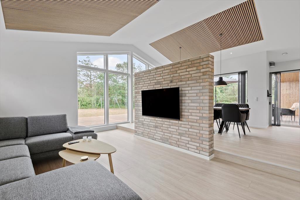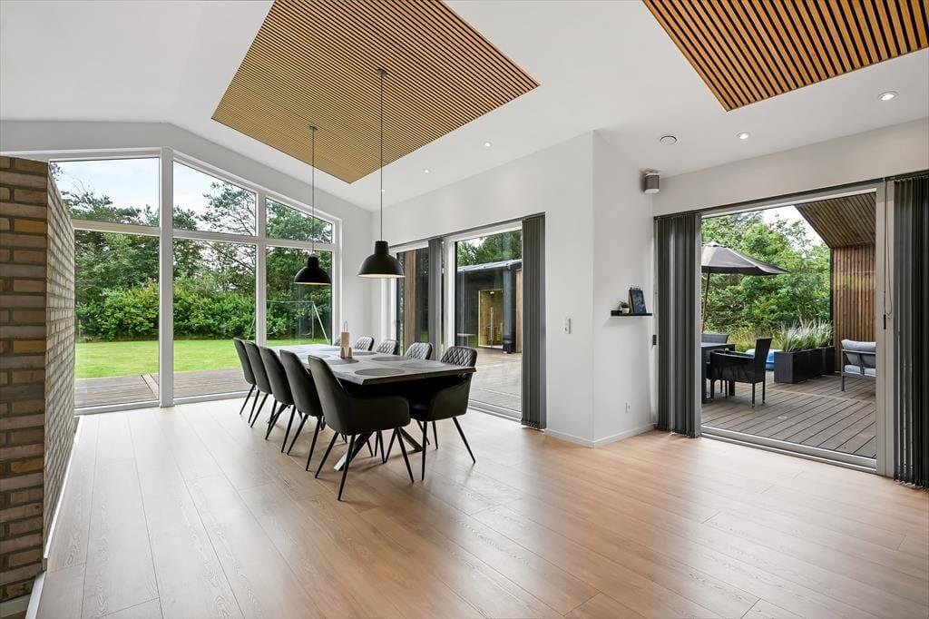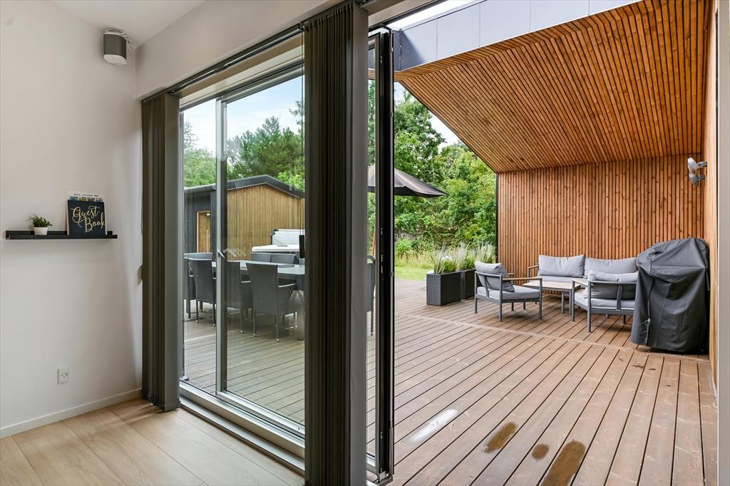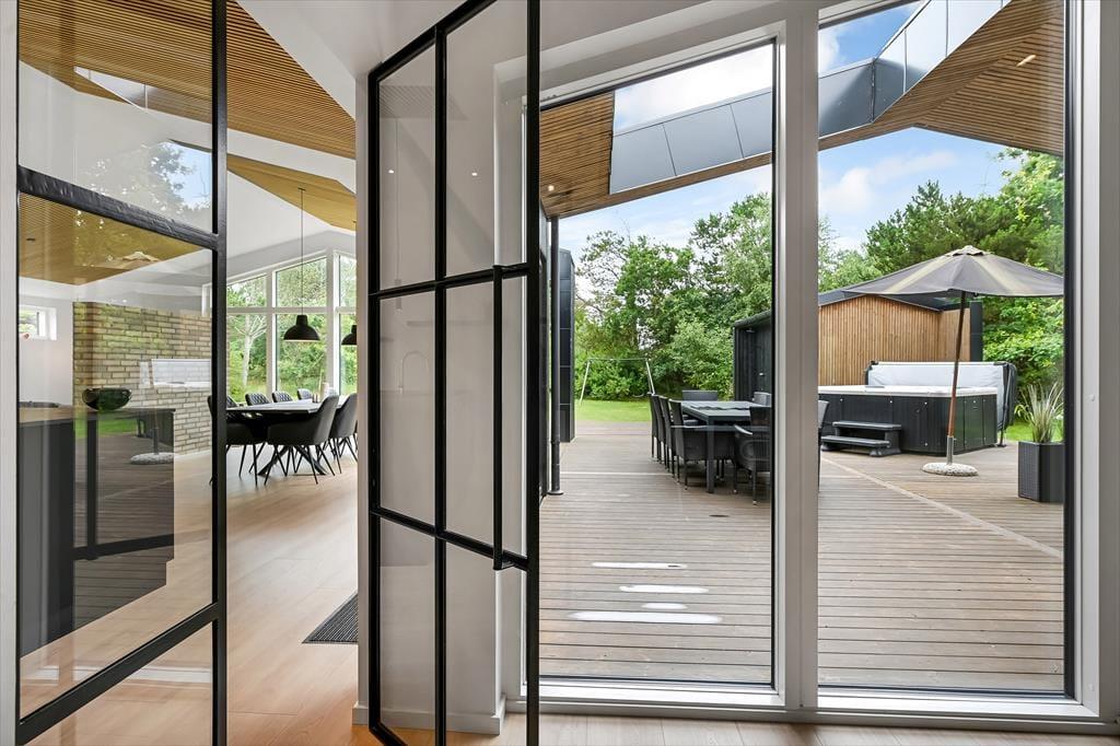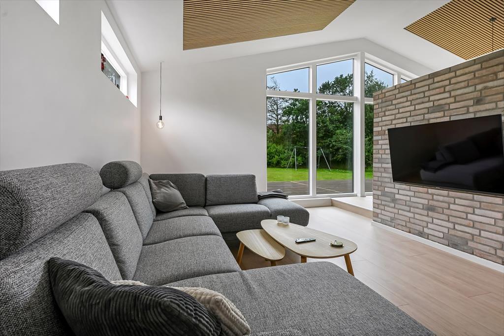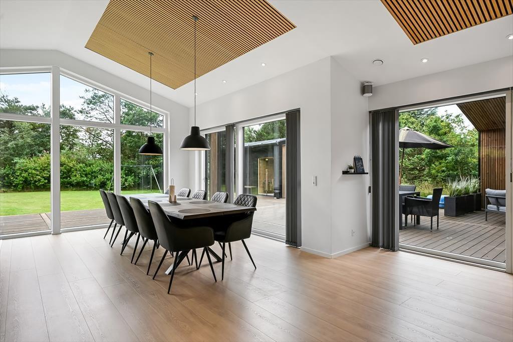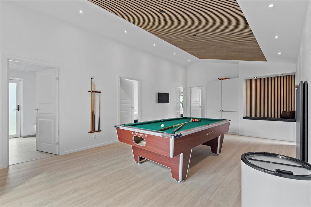 Det er ingen overdrivelse at skrive, at sommerhuset er stort, for I kan brede jer på hele 190 m2 inden døre. Husets fem værelser og to badeværelser ligger smart distribueret i to soveafsnit, mens den rummelige entré er indrettet som et bryggers med vaskemaskine, tørretumbler og godt med skabsplads. Centralt i sommerhuset ligger et flot køkken-alrum, og herfra har I åben forbindelse til en komfortabel tv-stue såvel som et aktivitetsrum, hvor I kan spille bordtennis og pool. Alle rum er stilfuldt indrettede, og især i opholdsafdelingen sørger de store vinduespartier for et skønt lysindfald.