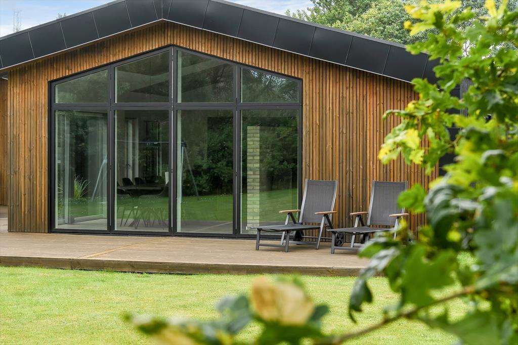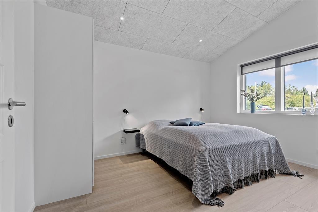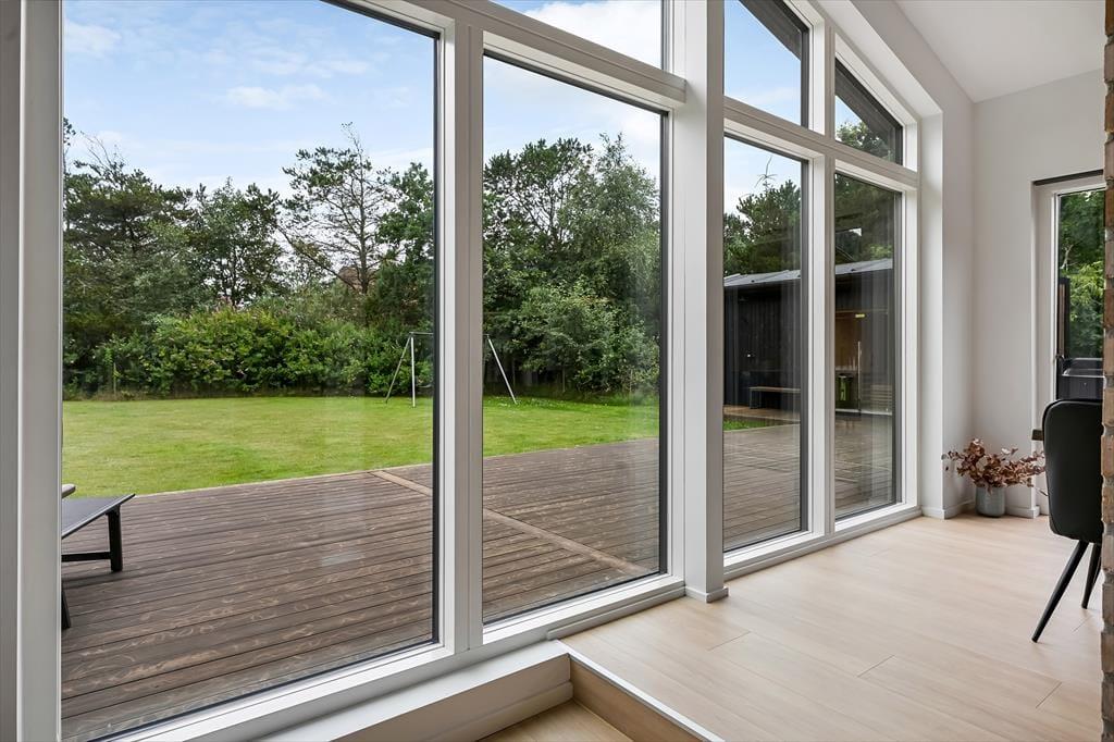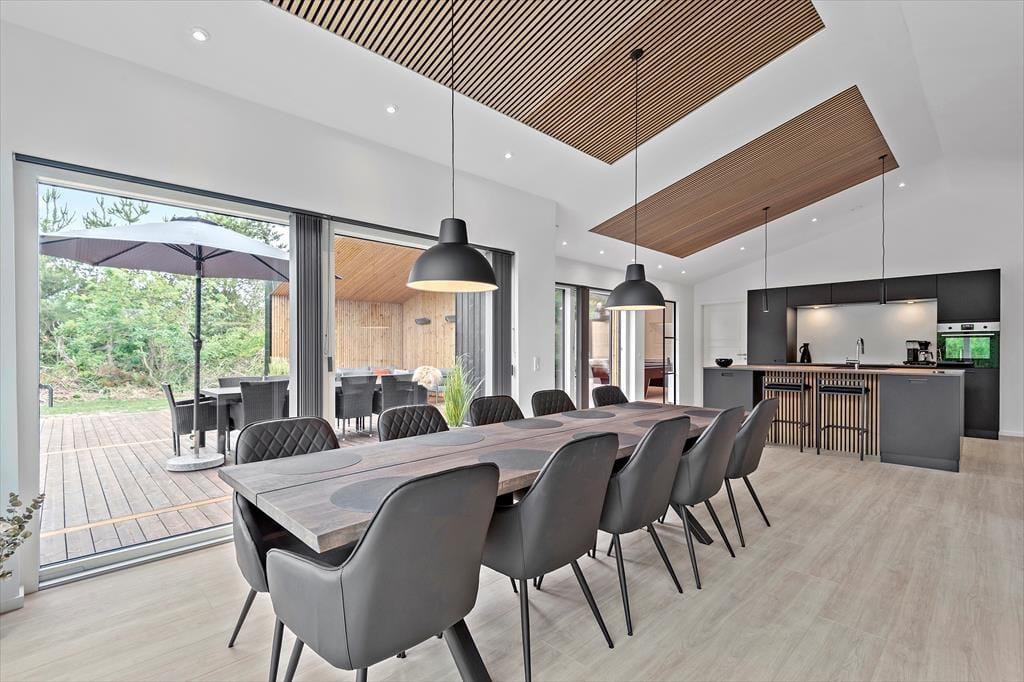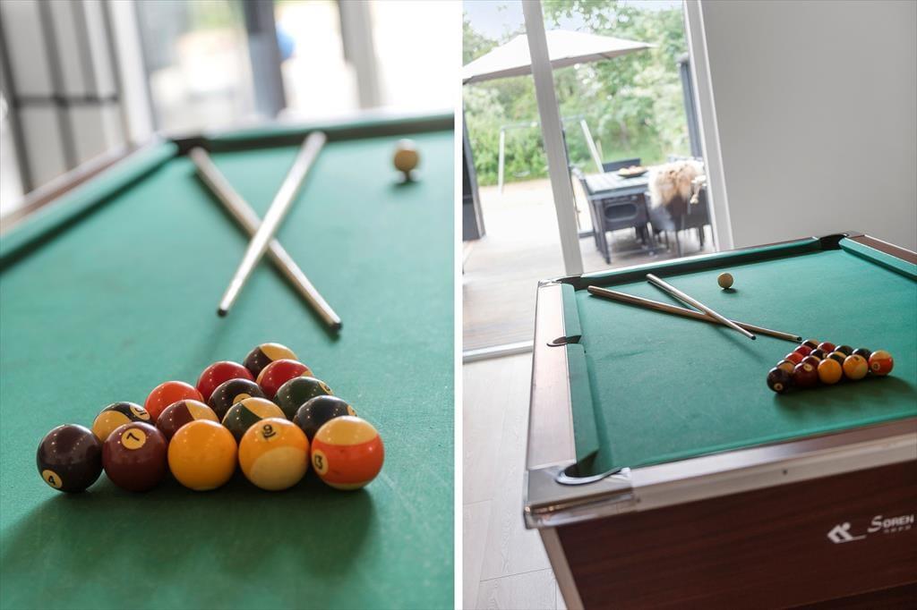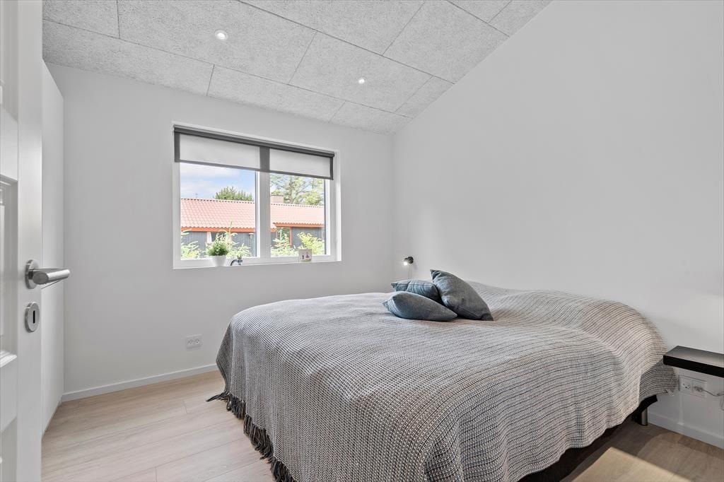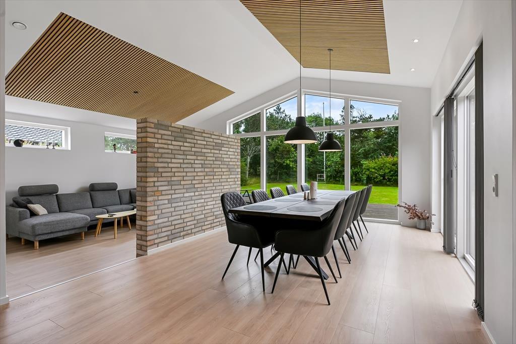 Det er ingen overdrivelse at skrive, at sommerhuset er stort, for I kan brede jer på hele 190 m2 inden døre. Husets fem værelser og to badeværelser ligger smart distribueret i to soveafsnit, mens den rummelige entré er indrettet som et bryggers med vaskemaskine, tørretumbler og godt med skabsplads. Centralt i sommerhuset ligger et flot køkken-alrum, og herfra har I åben forbindelse til en komfortabel tv-stue såvel som et aktivitetsrum, hvor I kan spille bordtennis og pool. Alle rum er stilfuldt indrettede, og især i opholdsafdelingen sørger de store vinduespartier for et skønt lysindfald.