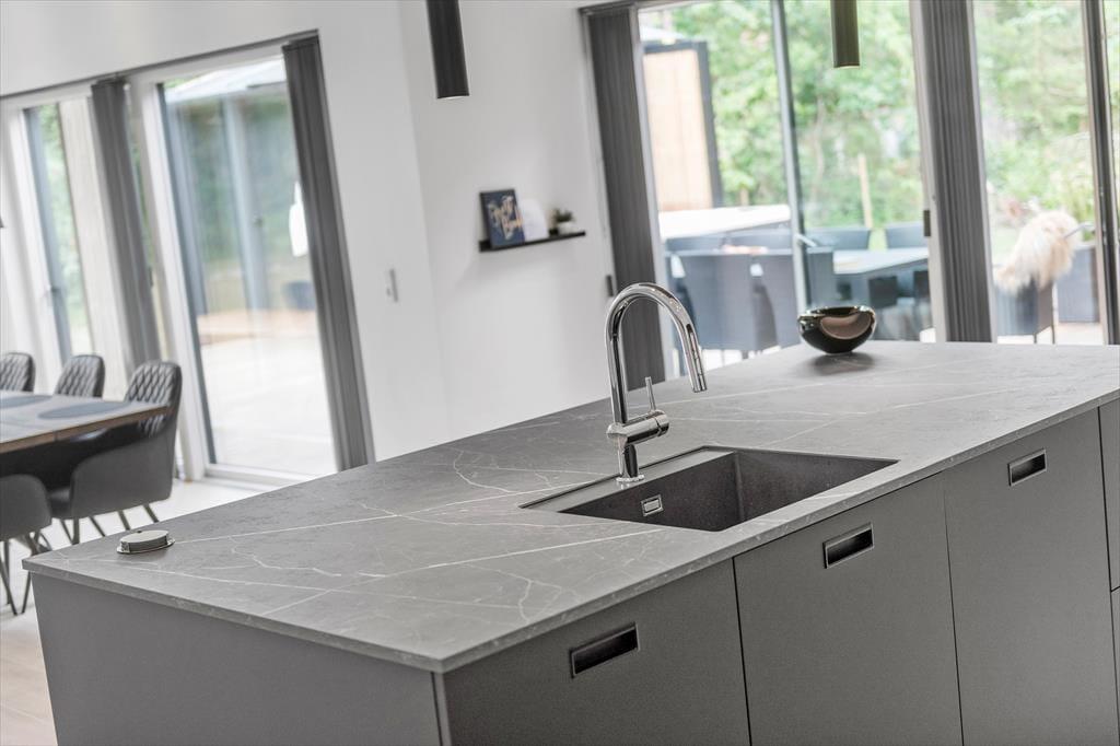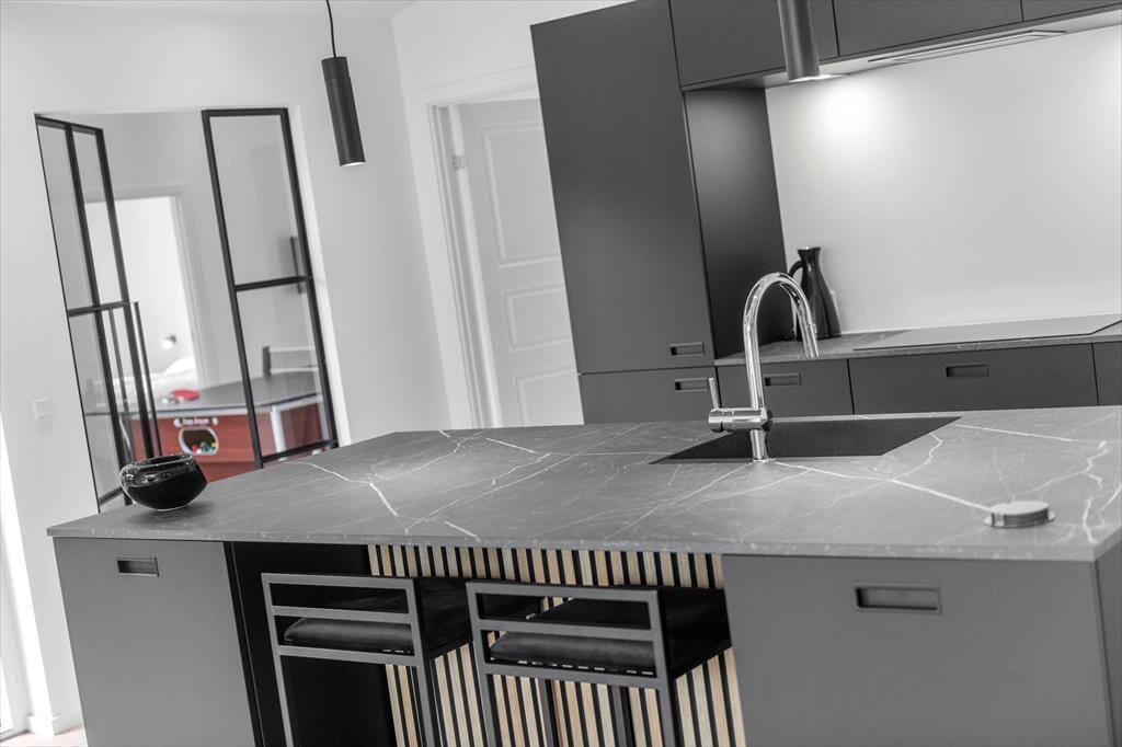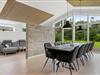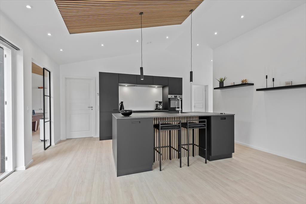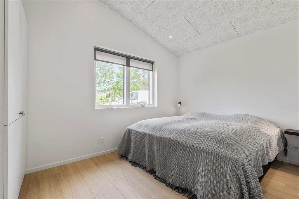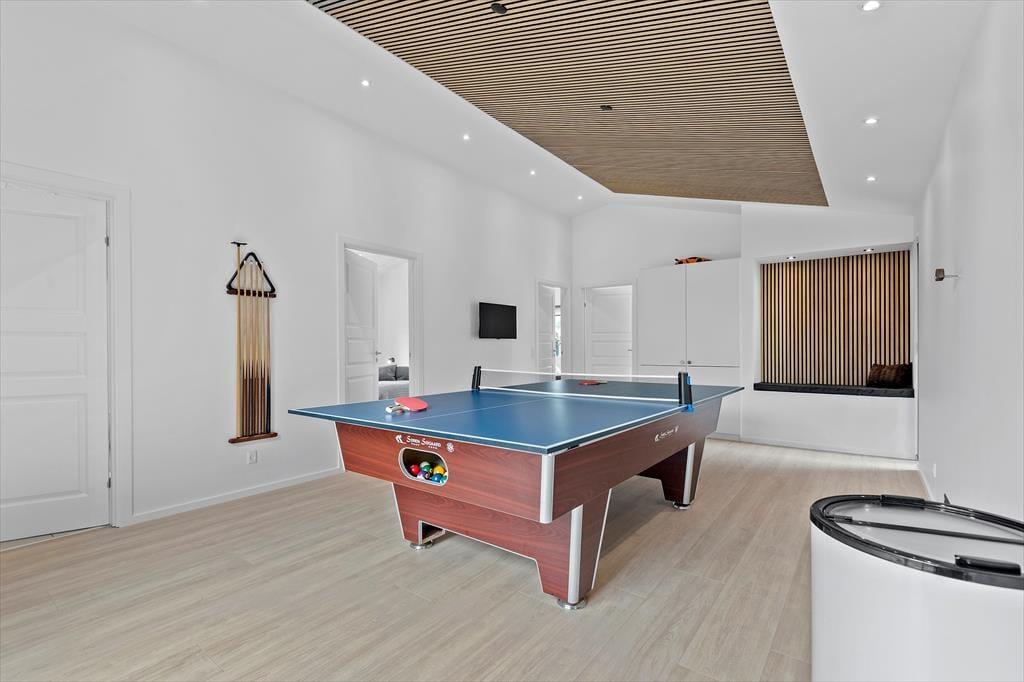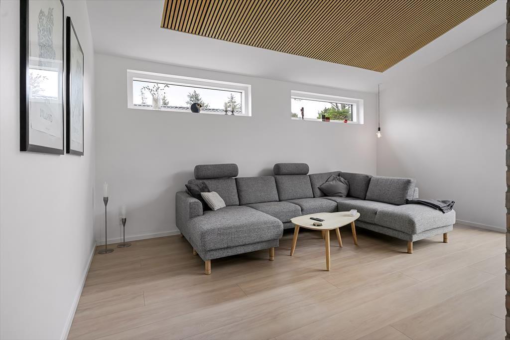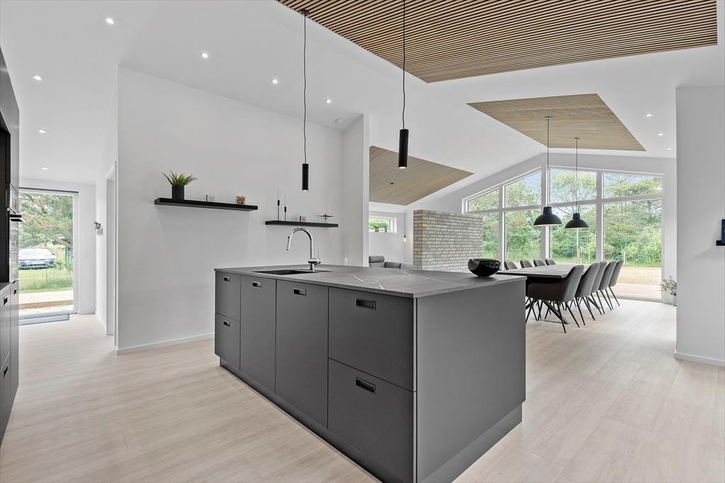 Det er ingen overdrivelse at skrive, at sommerhuset er stort, for I kan brede jer på hele 190 m2 inden døre. Husets fem værelser og to badeværelser ligger smart distribueret i to soveafsnit, mens den rummelige entré er indrettet som et bryggers med vaskemaskine, tørretumbler og godt med skabsplads. Centralt i sommerhuset ligger et flot køkken-alrum, og herfra har I åben forbindelse til en komfortabel tv-stue såvel som et aktivitetsrum, hvor I kan spille bordtennis og pool. Alle rum er stilfuldt indrettede, og især i opholdsafdelingen sørger de store vinduespartier for et skønt lysindfald.