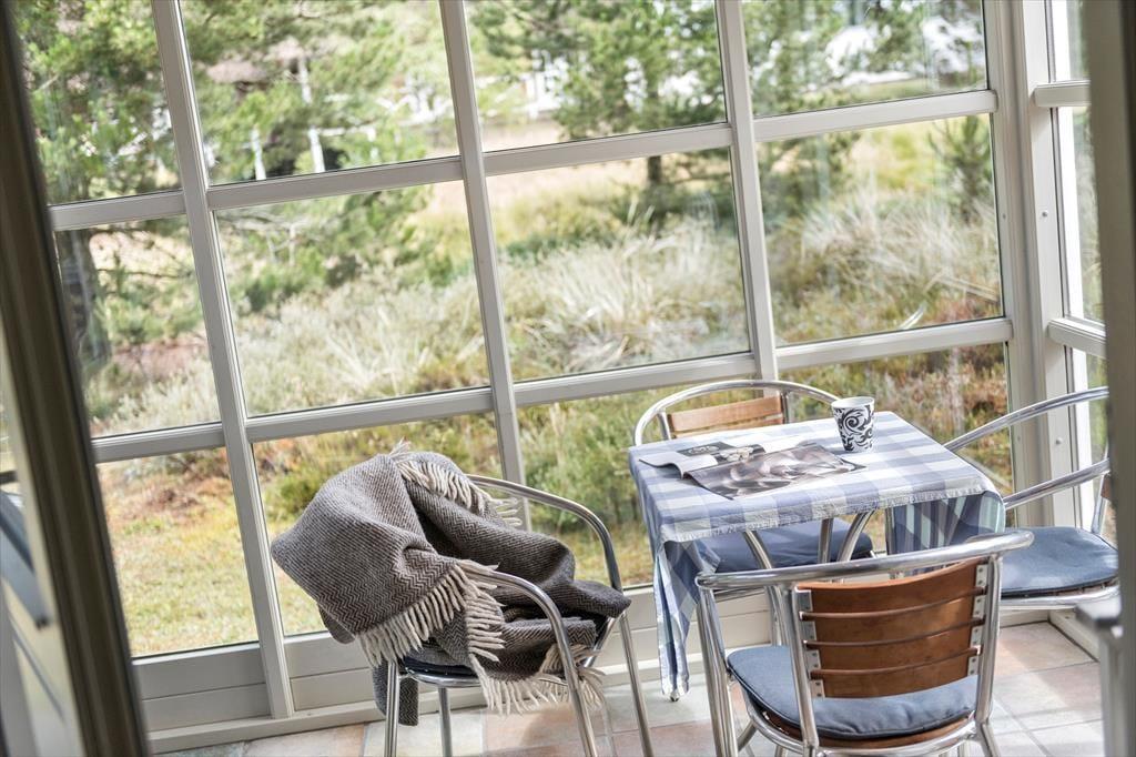 Udestuen er en fin siddeplads, hvis det er køligt eller blæsende udenfor, men når solen står højt på den blå himmel, vil I sikkert hellere slå jer ned på den sydvendte terrasse. Den har I direkte adgang til fra stuen, så det er nemt at tage frokosten med udenfor eller hente en ekstra iskaffe i køkkenet, og om aftenen er der mulighed for at grille. En god græsplæne ligger tæt på huset, mens resten af den store grund er holdt på mere naturlig vis.
