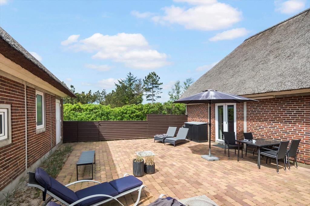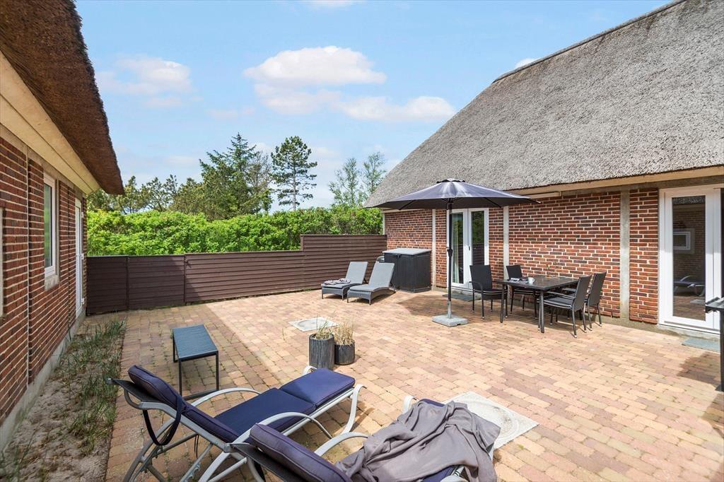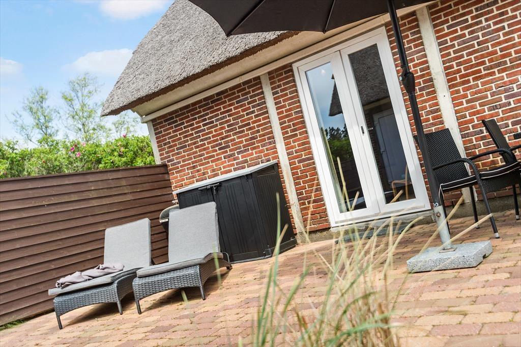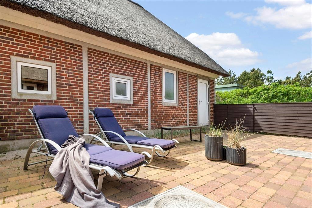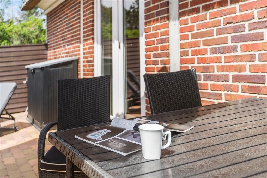 Fra stuen har I direkte adgang til solgården, der er helt aflukket og godt skærmet af hegn og hybenbuske. Hvis I mest af alt trænger til at koble af, kan I bruge det meste af ferien her, lige fra dagens første kop kaffe og indtil sengetid – blot med små afstikkere til stranden, ud i naturen og hen til supermarkedet for at købe ind til aftensmaden, som I kan tilberede på grillen.
