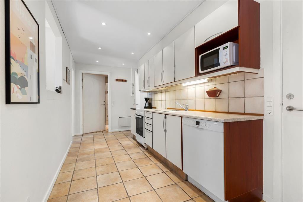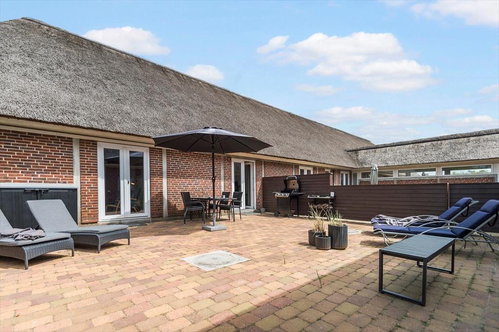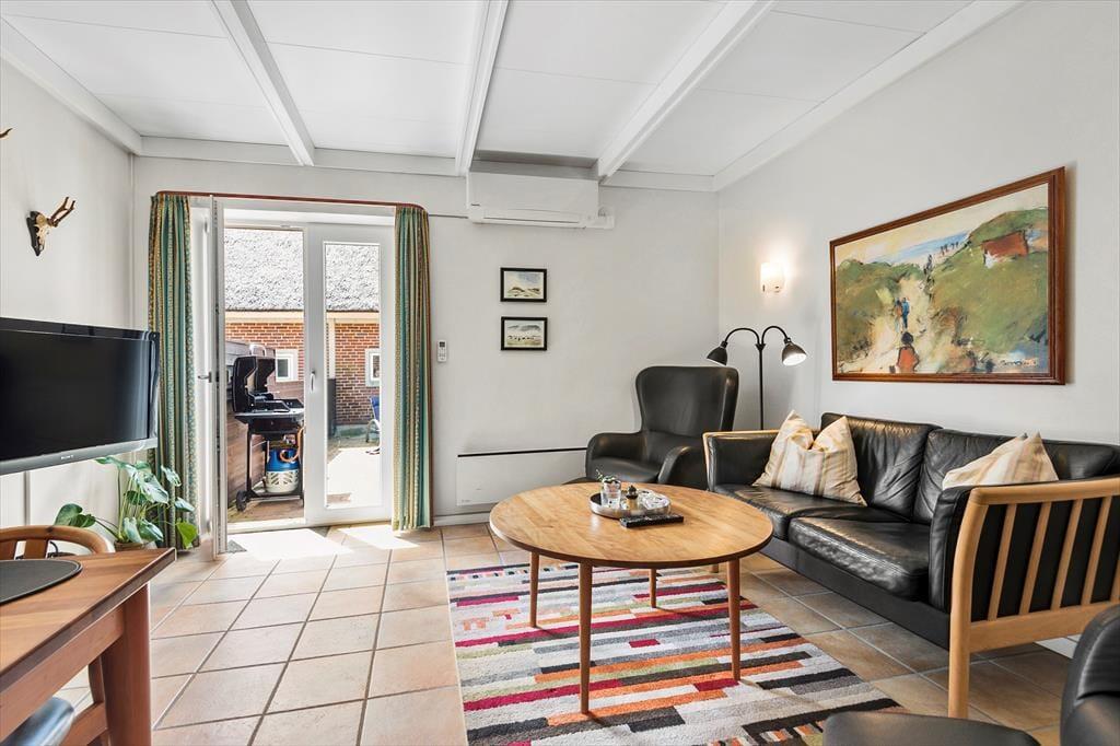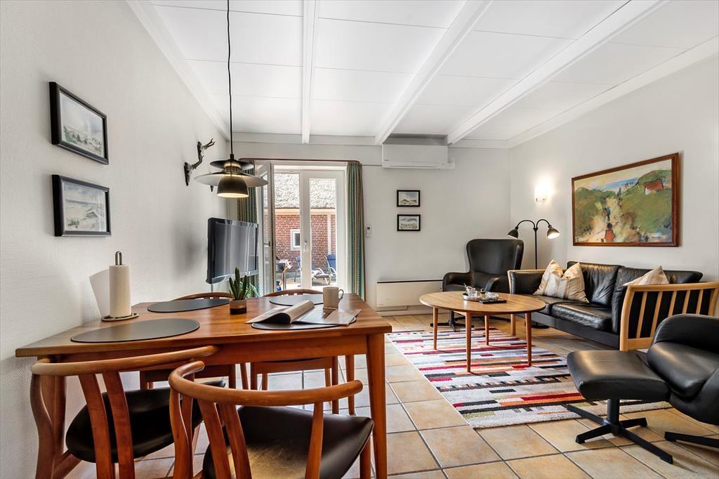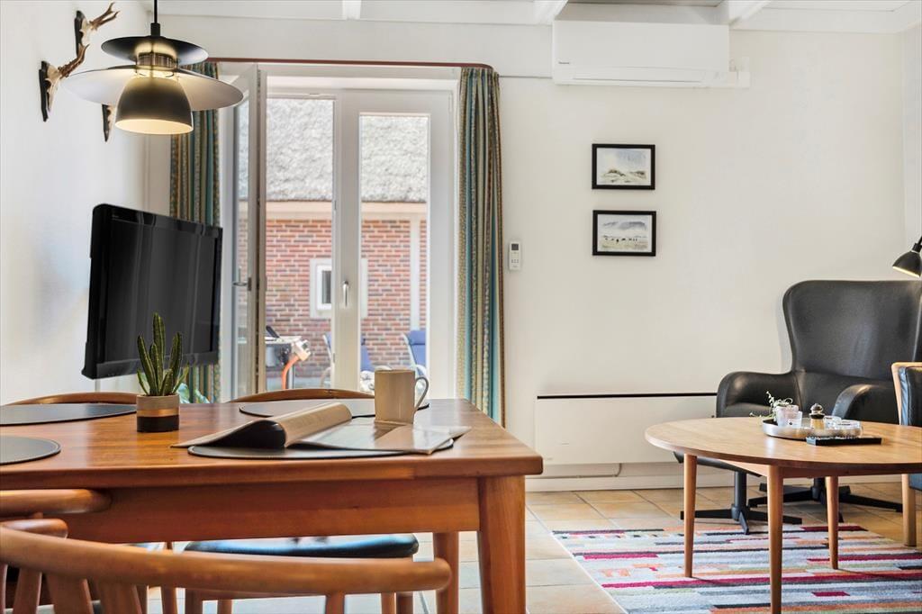 Mere præcist er der tale om en stuelejlighed på 66 m2, der ligger i en stråtækt rødstensejendom. Hver boligenhed har sin egen lukkede solgård, og inden døre hviler der en rar og indbydende atmosfære. Planløsningen passer fint til fire personer, for der er to soveværelser med dobbeltseng til rådighed foruden et badeværelse med bruser og gulvvarme. I køkkenet er der opvaskemaskine og alt det nødvendige for at trylle lækre feriemåltider frem, og gennem en åbning i væggen har I god kontakt til stuen, mens I står og kokkererer. Stuen er hyggeligt indrettet med spisebord, sofaarrangement og fladskærms-tv, så det er et rart opholdssted – når I altså ikke daser i solgården i stedet.