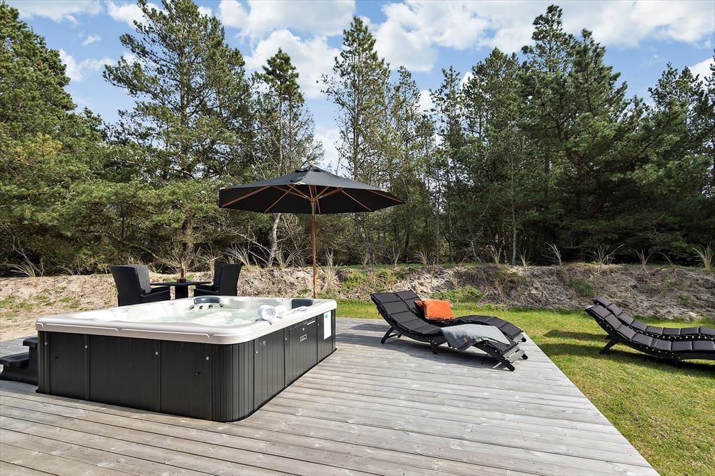 På den 1500 m2 store naturgrund har I god plads til både leg, wellness og fælles hyggestunder. Et lækkert terrassemiljø breder sig rundt om sommerhuset, så I har mange skønne opholdspladser at vælge imellem – inklusiv et overdækket areal og en udespa, der står klar til eventuelle kølige dage eller stjerneklare aftener. En udendørs bruser ligger på sydøstsiden af huset, og på græsplænen kan legebørn i alle aldre spille havespil eller vise, hvad de dur til med en fodbold.