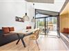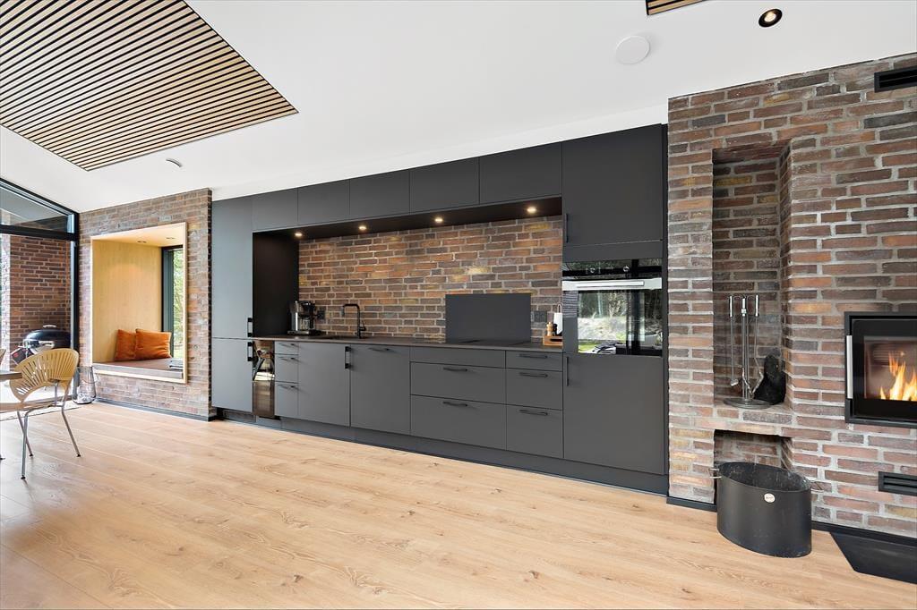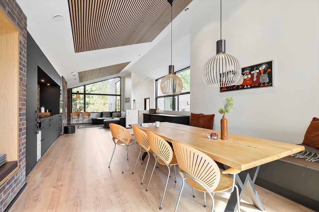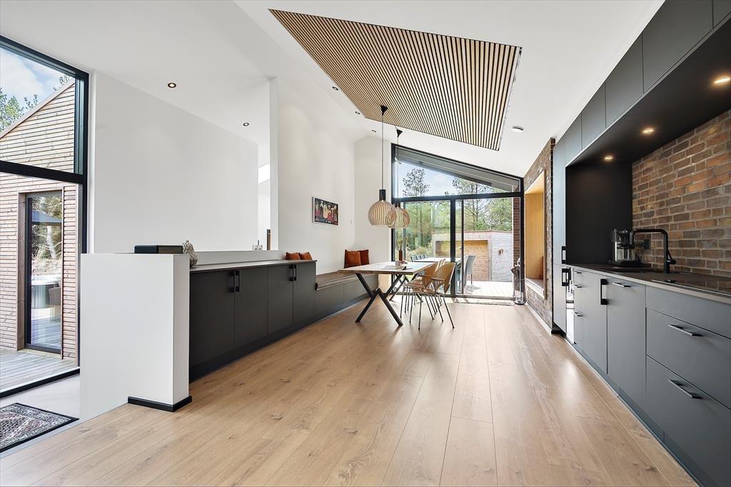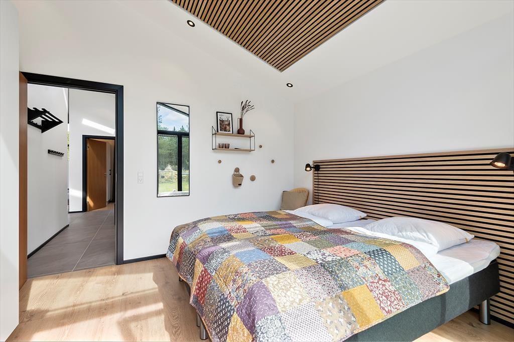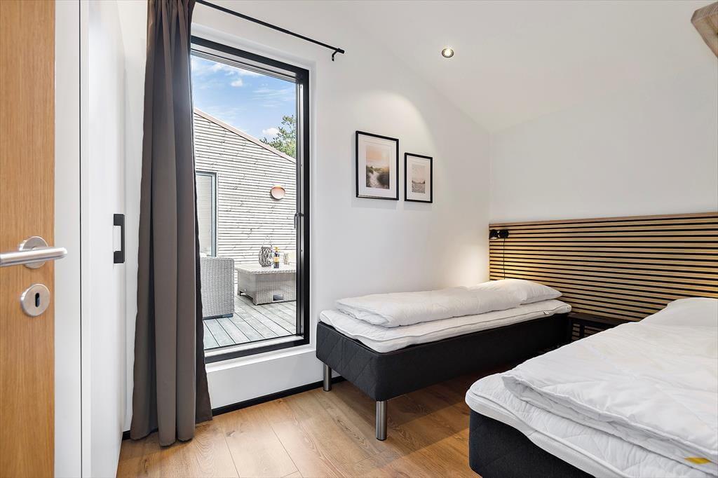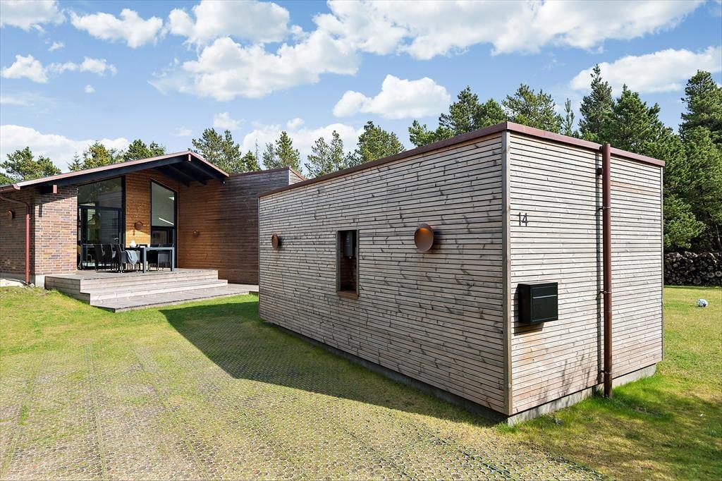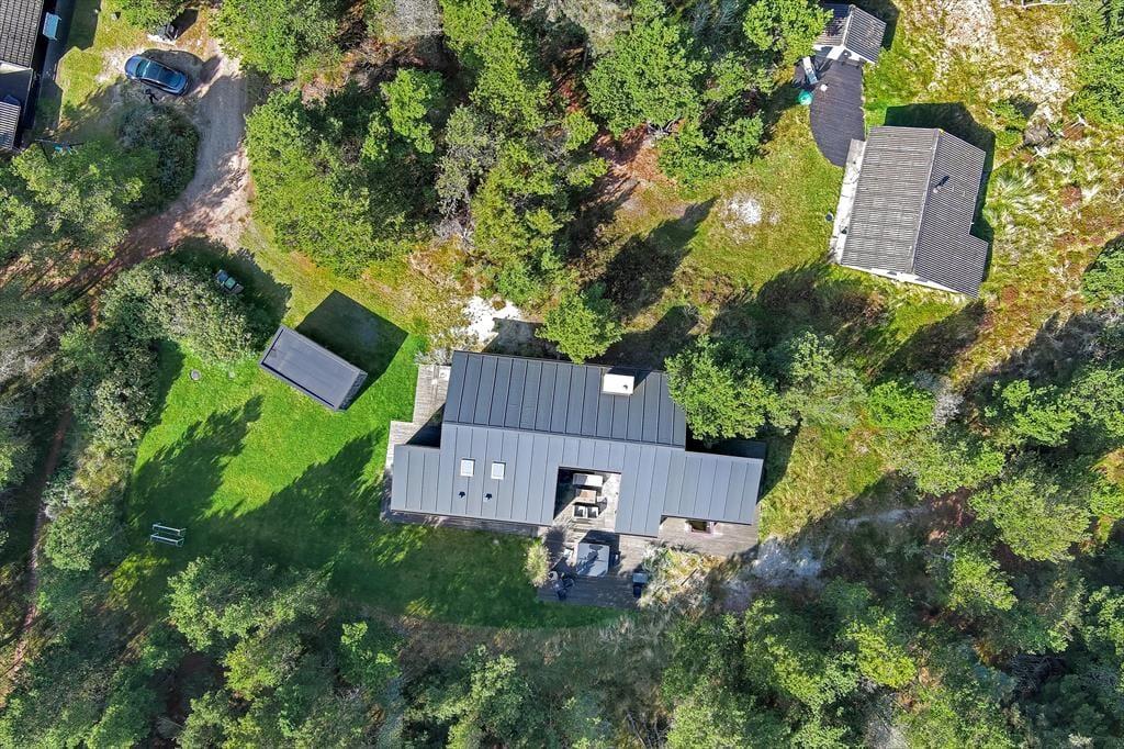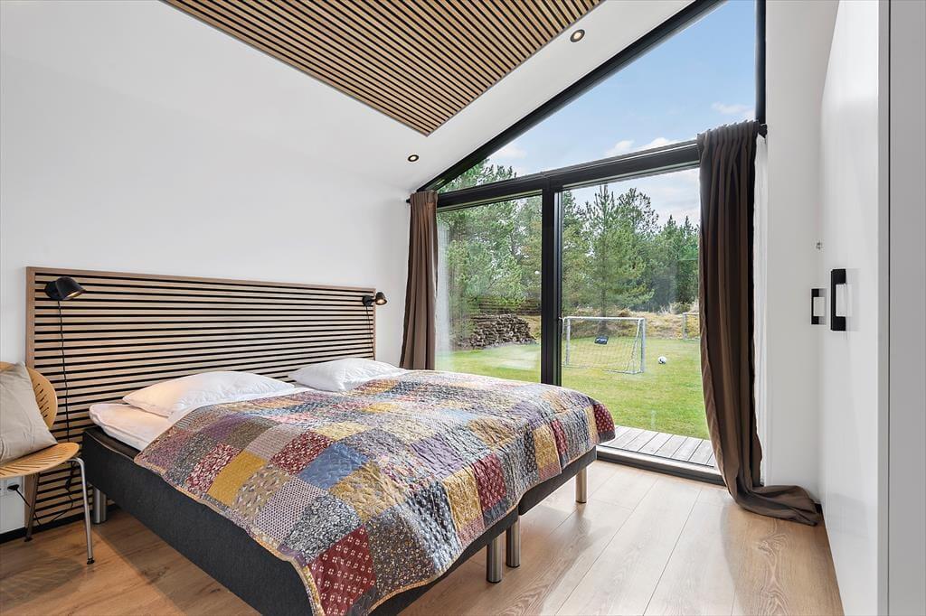 Med 150 m2 inden døre og en perfekt udformet planløsning kan I nemt samles op til otte personer på Sandvej 14. Sommerhuset er opført i 2022, og der er ikke en finger at sætte på indretningen, der byder på lyse, brede plankegulve, loft til kip, store vinduespartier og interiør i smagfulde farvetoner. Fire flotte værelser og to ditto badeværelser er ligeligt opdelt i to soveafsnit, så huset kan oplagt benyttes af to børnefamilier. Der er også et praktisk depotrum med vaskesøjle, og helt centralt ligger opholdsafdelingen, hvor et lækkert åbent køkken er forenet med en opholdsstue. Ved sofaen er der både stort fladskærms-tv og indbygningspejs, og nær spisebordet er der etableret en hyggelig briks i vinduesnichen, hvor I kan læse eller slappe af med udsigt til grundens naturskønne bevoksning.