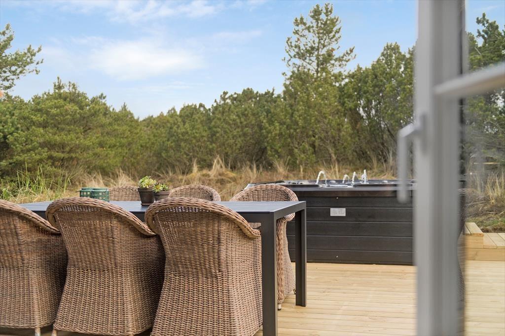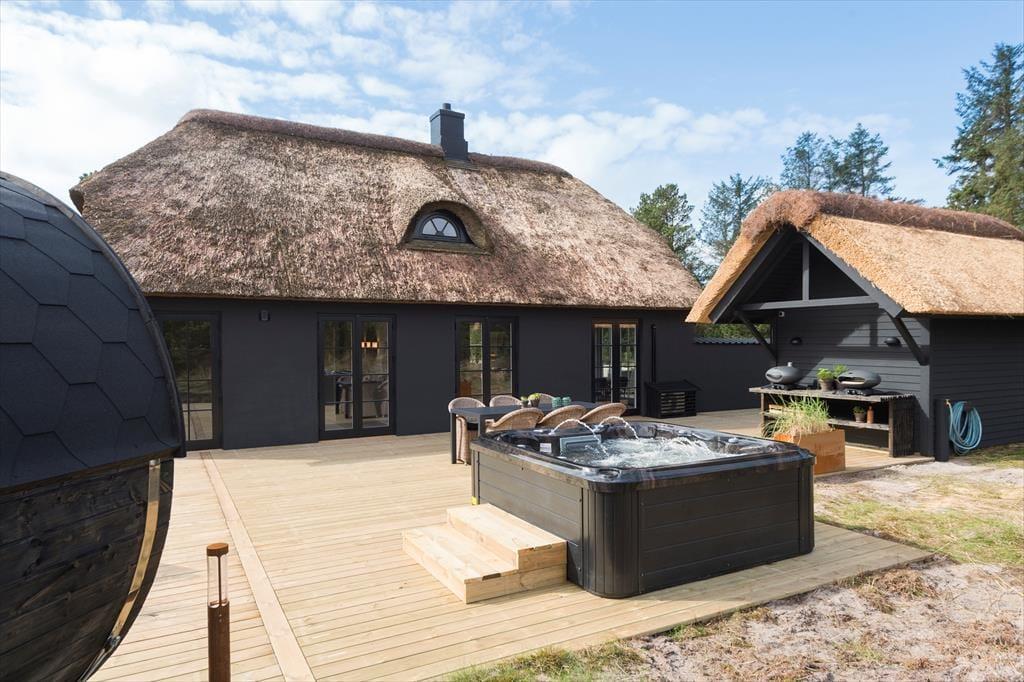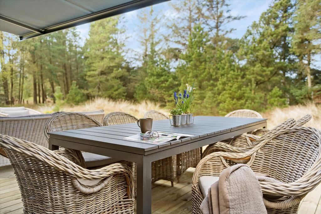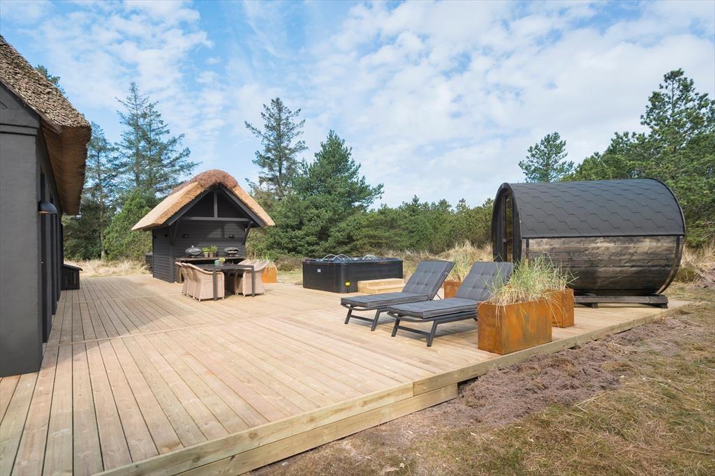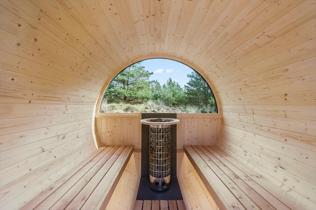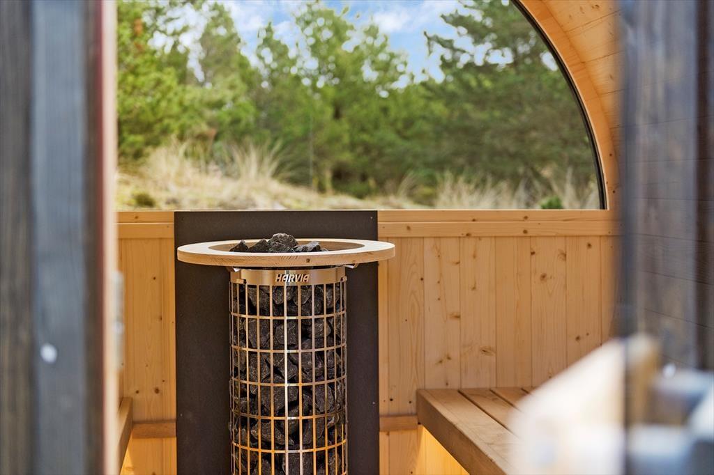 Det høje kvalitetsniveau er også tydeligt ude i det fri, hvor en stor og lækker træterrasse breder sig hele vejen rundt om sommerhuset. Spabadet og tøndesaunaen inviterer til wellness med udsigt til krogede fyrretræer og naturskønne dufte i næseborene, og hvis du vil forkæle familien med hjemmelavet pizza og andre lækkerier, kan du samle alle ved havebordet og gå i gang med madlavningen under åben himmel. Markisen på den vestvendte del af terrassen kan slås ud, hvis I trænger til skygge – og hvis du er ankommet i elbil, er det muligt at lade den op på naturgrunden.