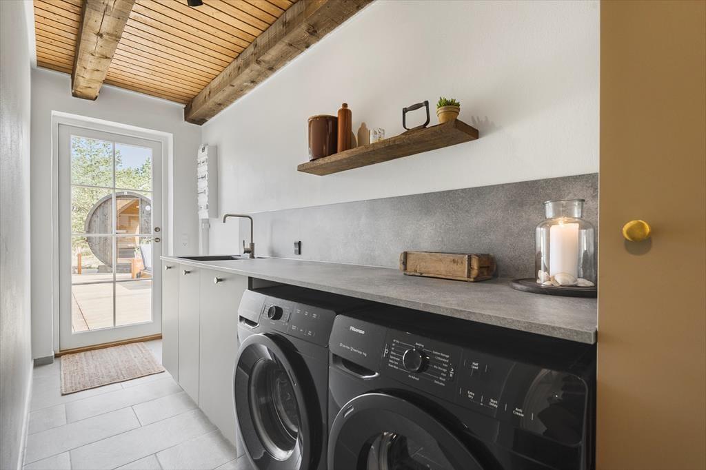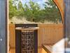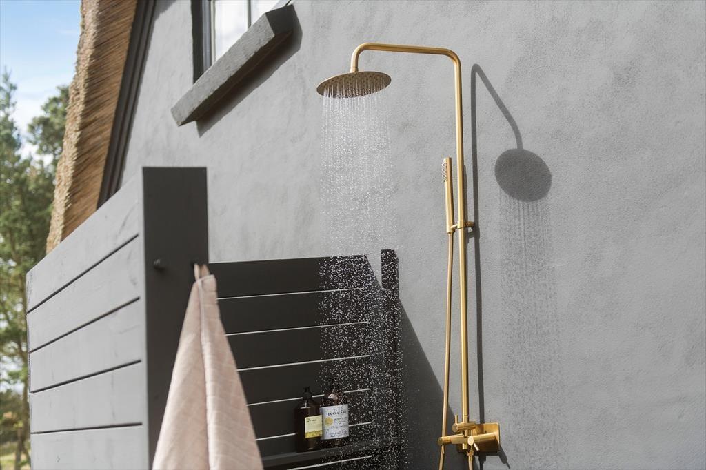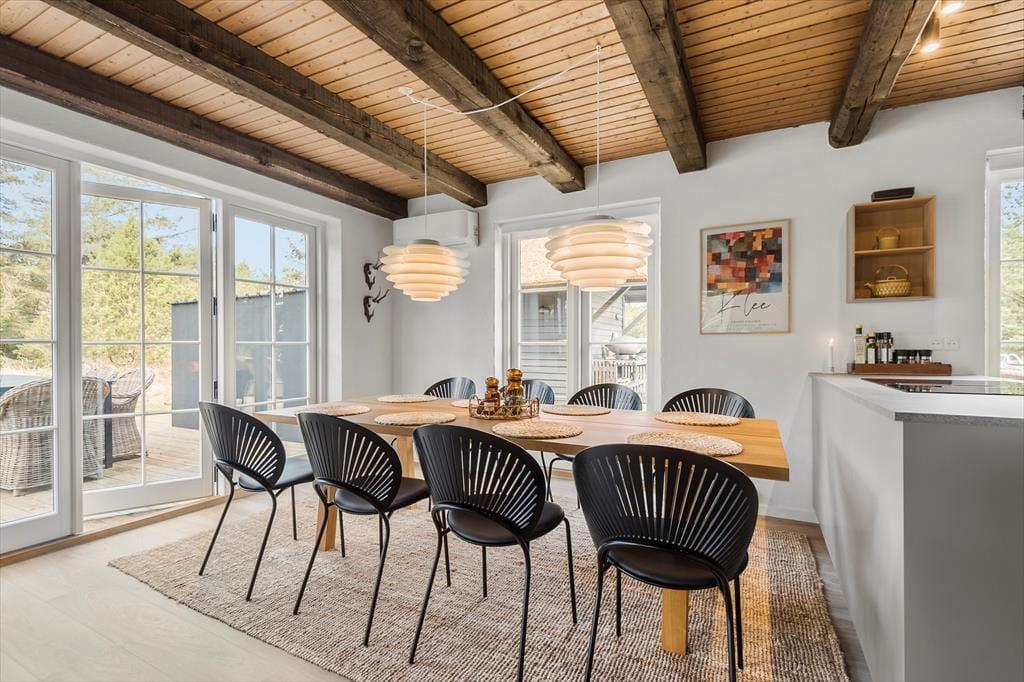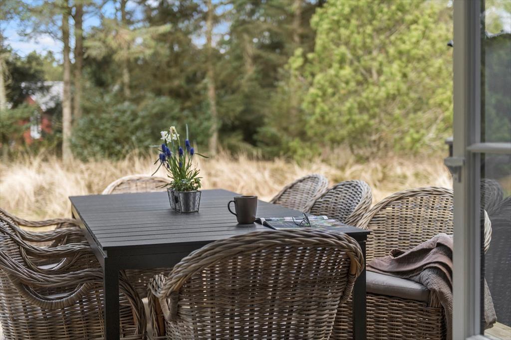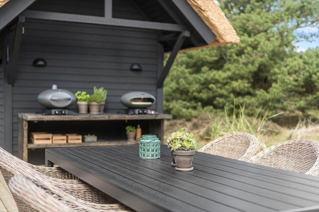Det høje kvalitetsniveau er også tydeligt ude i det fri, hvor en stor og lækker træterrasse breder sig hele vejen rundt om sommerhuset. Spabadet og tøndesaunaen inviterer til wellness med udsigt til krogede fyrretræer og naturskønne dufte i næseborene, og hvis du vil forkæle familien med hjemmelavet pizza og andre lækkerier, kan du samle alle ved havebordet og gå i gang med madlavningen under åben himmel. Markisen på den vestvendte del af terrassen kan slås ud, hvis I trænger til skygge – og hvis du er ankommet i elbil, er det muligt at lade den op på naturgrunden.