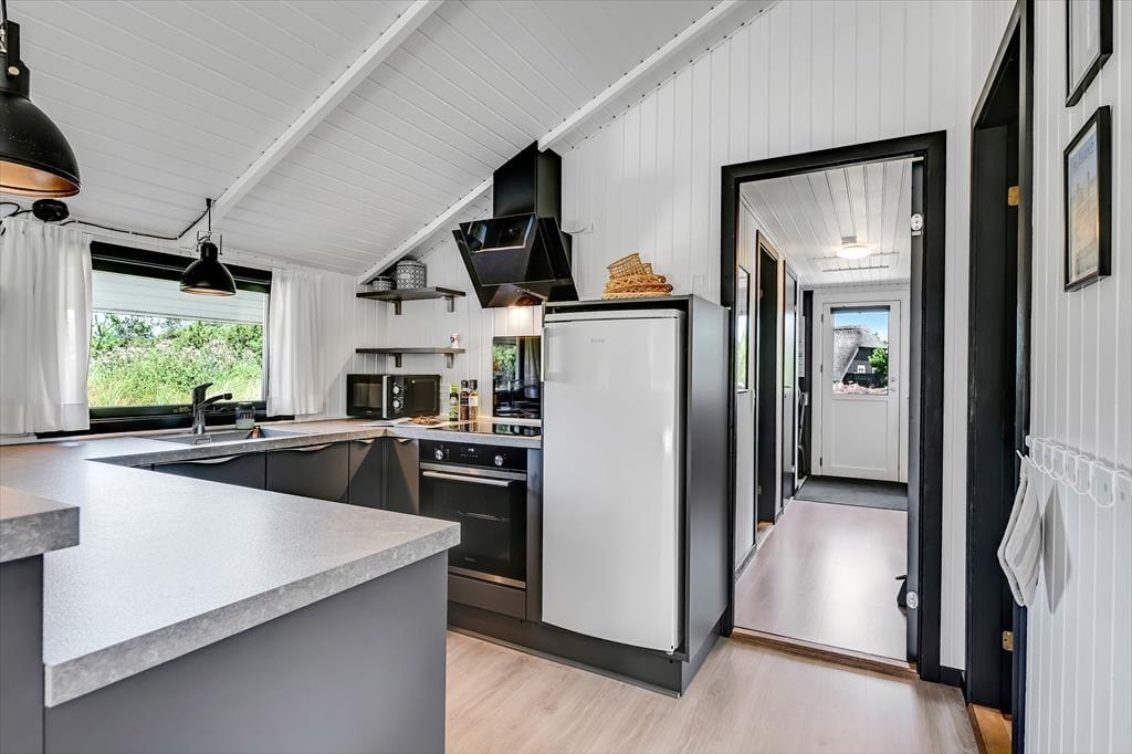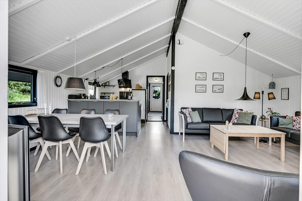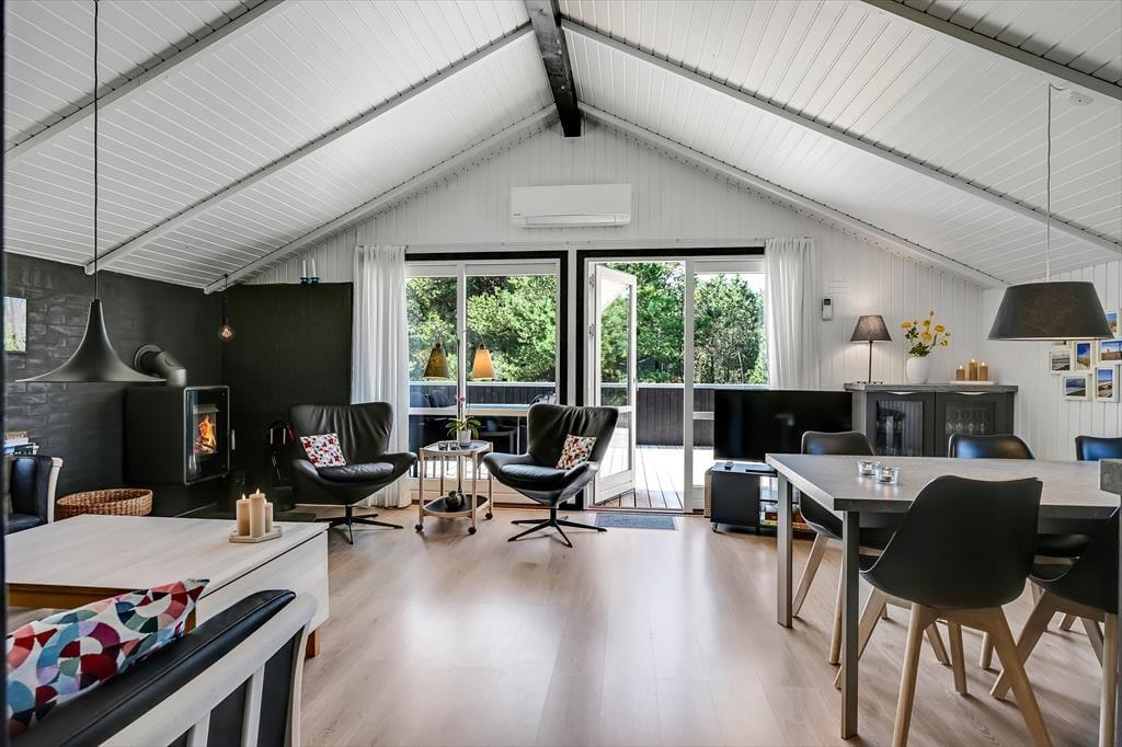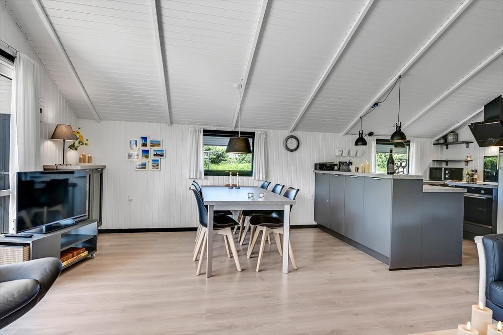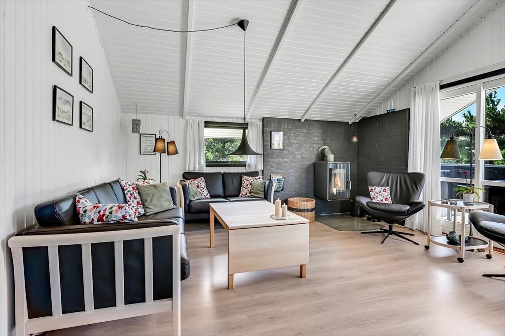 Selvom der er meget at opleve i lokalområdet, er det rart at have en hyggelig base til feriens mere tilbagelænede stunder. Her i sommerhuset kan du slappe af i den lyse og velindrettede stue, der har loft til kip, brændeovn og havedør ud til terrassen. Hvis du drømmer om at læse din medbragte krimi færdig, kan du blive siddende helt roligt i sofaafdelingen i timevis. Spisebordet er et skønt samlingspunkt – for eksempel når du eller andre i selskabet har været i gang med at trylle noget lækkert frem i det åbne køkken. Et badeværelse og tre soveværelser fuldender planløsningen, så alt i alt er det en rar feriebolig, der fint kan rumme seks personer.