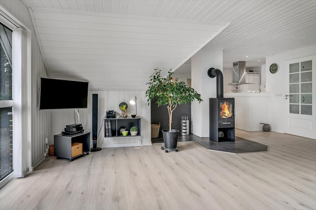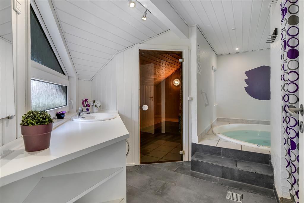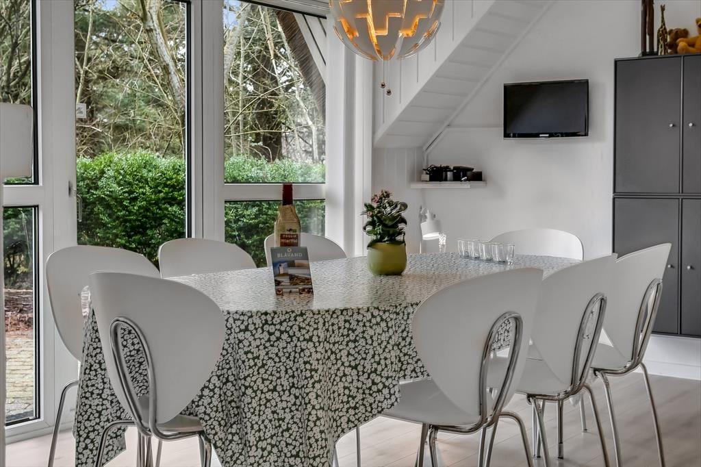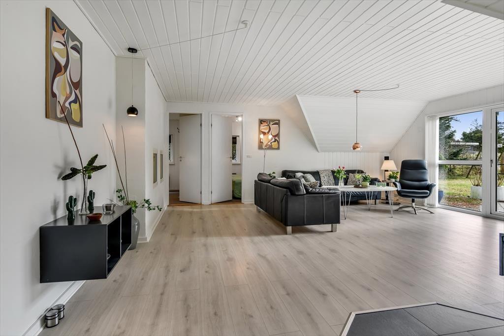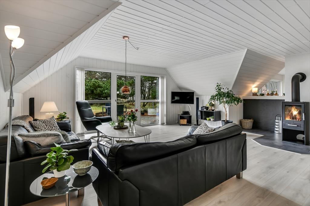 Sommerhusets indretning er lys og indbydende, og takket være de mange kvadratmeter og den gennemtænkte planløsning kan I fint være otte personer. Så hvis du vil invitere bedsteforældrene eller gode venner med på familieferien, kan det altså sagtens lade sig gøre. I det åbne køkken kan du brygge kaffe og finde snacks frem, som du kan servere for de andre i sofaafdelingen – hvis der samtidig er ild i brændeovnen og eventuelt en film på fladskærms-tv’et, kan man næsten ikke bede om mere. Spisebordet er et hyggeligt samlingspunkt, når I vil spise brunch eller nyde dagens øvrige måltider, og hvis der er afslapning på ferieprogrammet, vil du med sikkerhed blive glad for husets store spabad og sauna.
