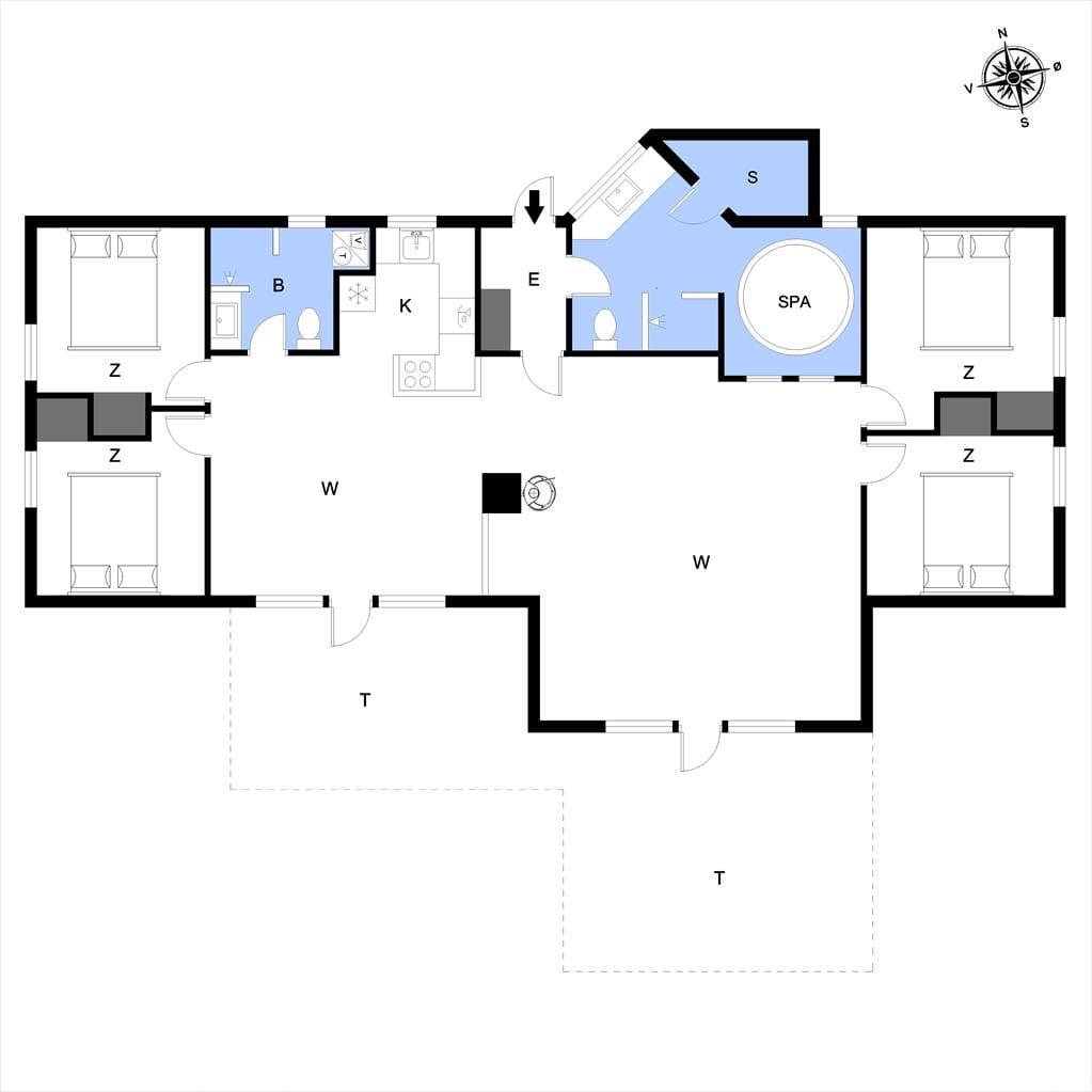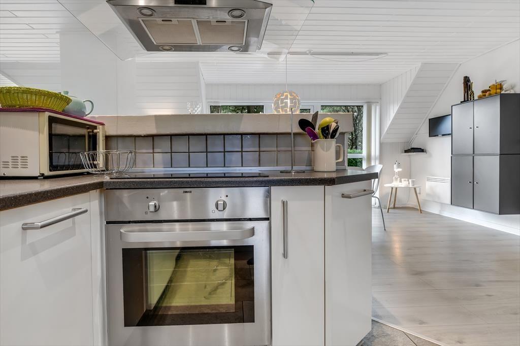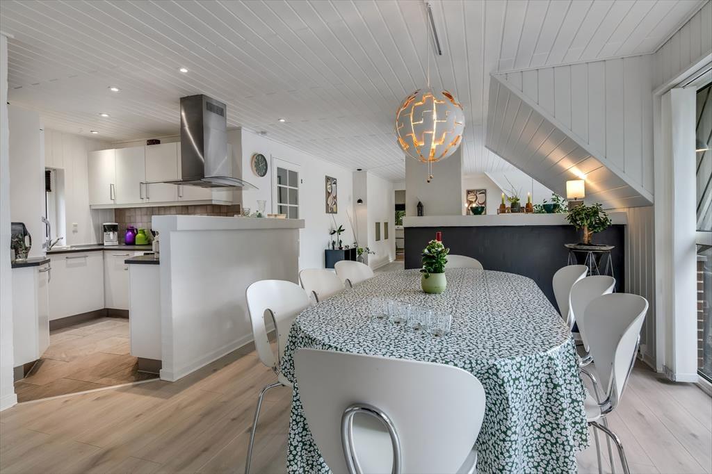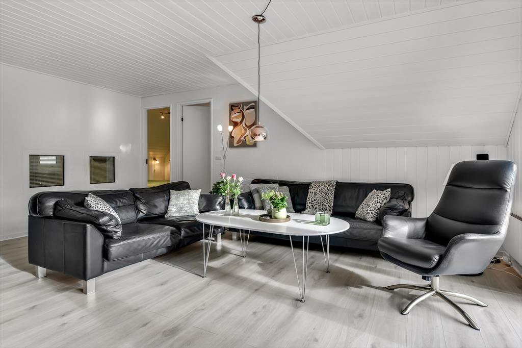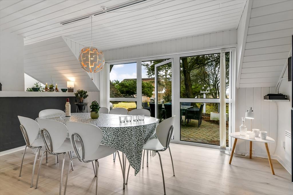 Sommerhusets indretning er lys og indbydende, og takket være de mange kvadratmeter og den gennemtænkte planløsning kan I fint være otte personer. Så hvis du vil invitere bedsteforældrene eller gode venner med på familieferien, kan det altså sagtens lade sig gøre. I det åbne køkken kan du brygge kaffe og finde snacks frem, som du kan servere for de andre i sofaafdelingen – hvis der samtidig er ild i brændeovnen og eventuelt en film på fladskærms-tv’et, kan man næsten ikke bede om mere. Spisebordet er et hyggeligt samlingspunkt, når I vil spise brunch eller nyde dagens øvrige måltider, og hvis der er afslapning på ferieprogrammet, vil du med sikkerhed blive glad for husets store spabad og sauna.