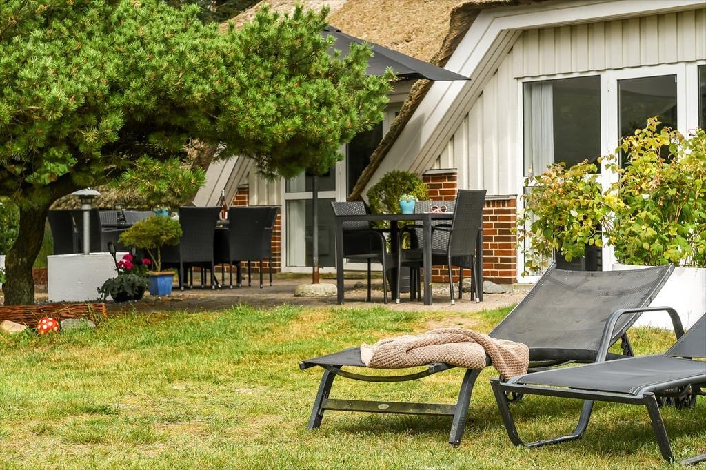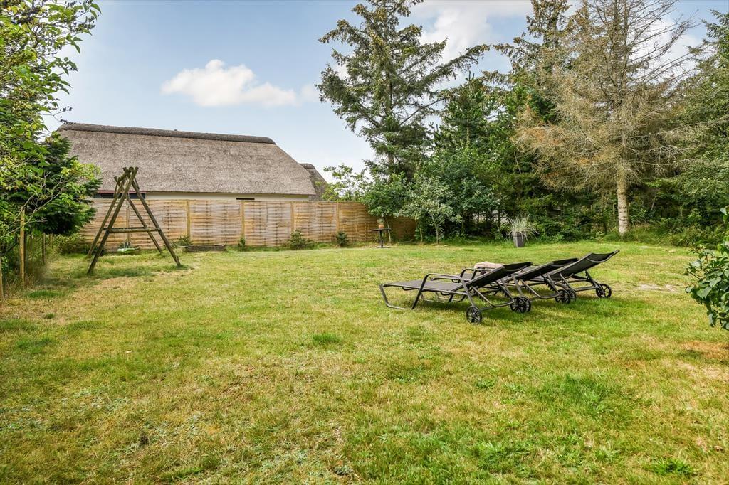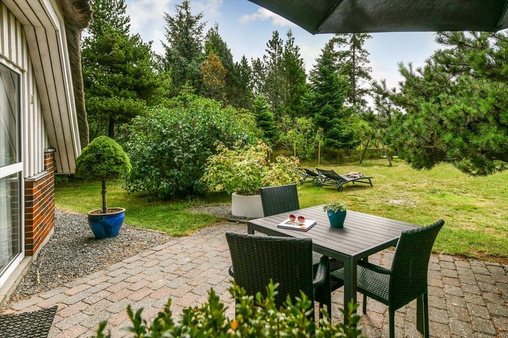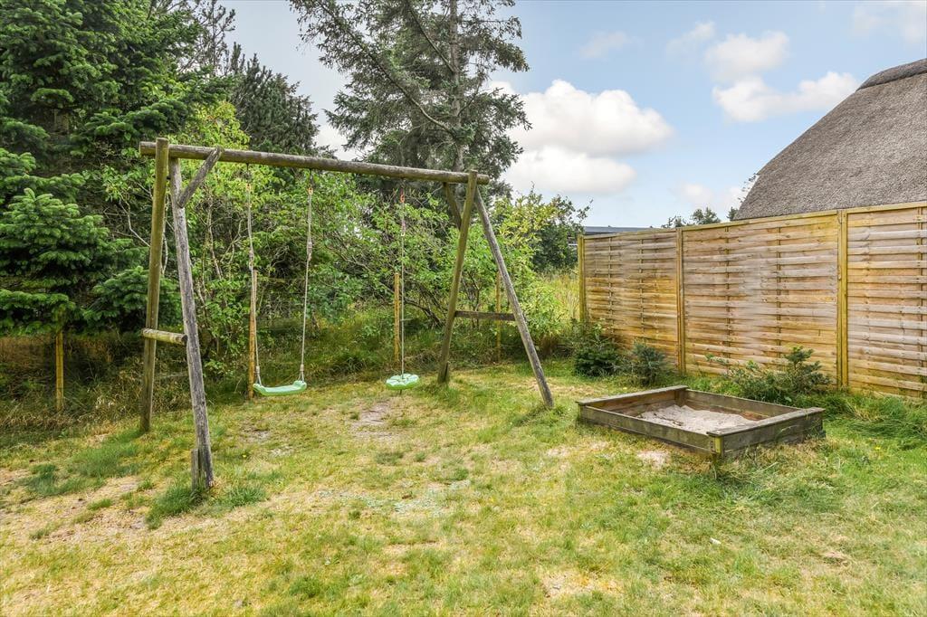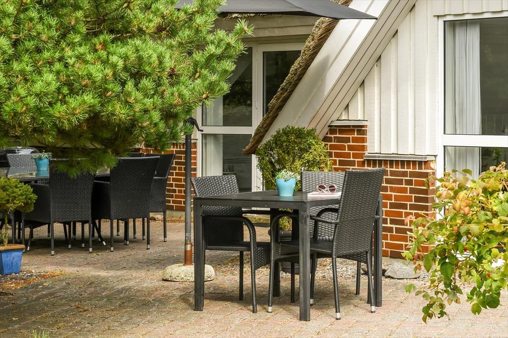 Både fra stuens sofa- og spiseafdeling er der direkte adgang til terrassemiljøet, så når vejret er lunt og sommerligt, skal du blot åbne glasdørene for at skabe fri passage mellem ude og inde. Med andre ord kan du nemt tage en kop kaffe eller en bog med ud til den sydvendte terrasse, der breder sig ud mod den fredfyldte og grønne baghave. Har du små børn med på ferie, vil de sikkert blive glade for gyngerne og sandkassen, og græsplænen kan oplagt danne underlaget, hvis I vil kaste med frisbee, spille vikingespil eller tumle med hunden.
