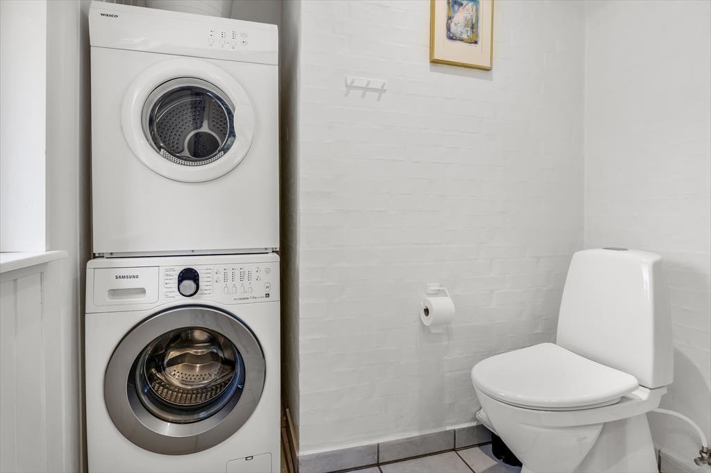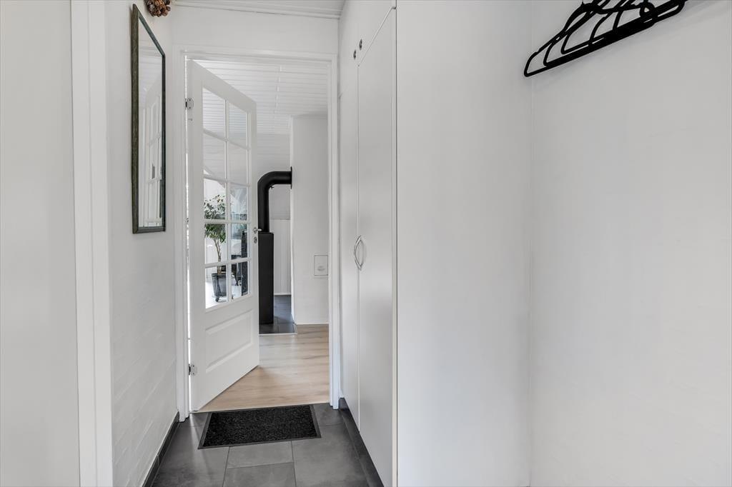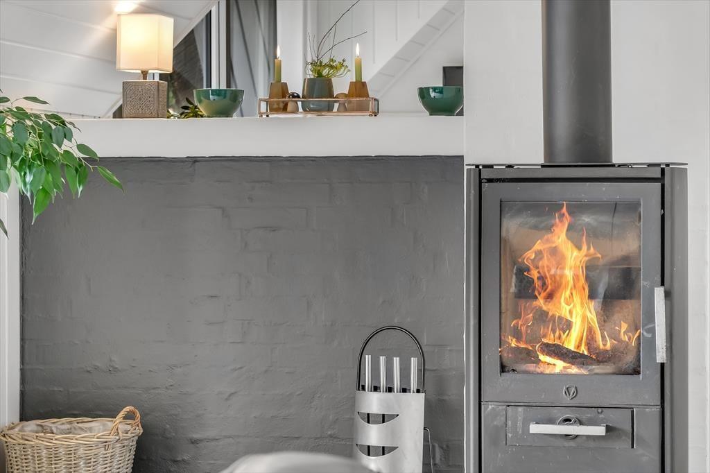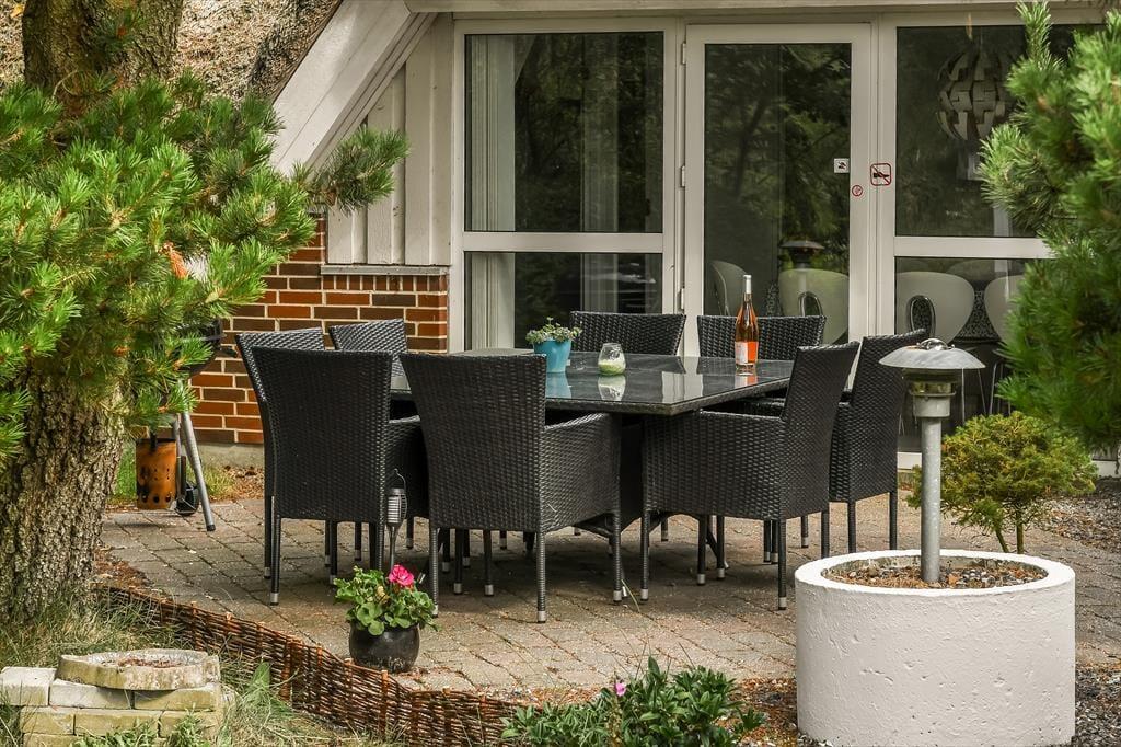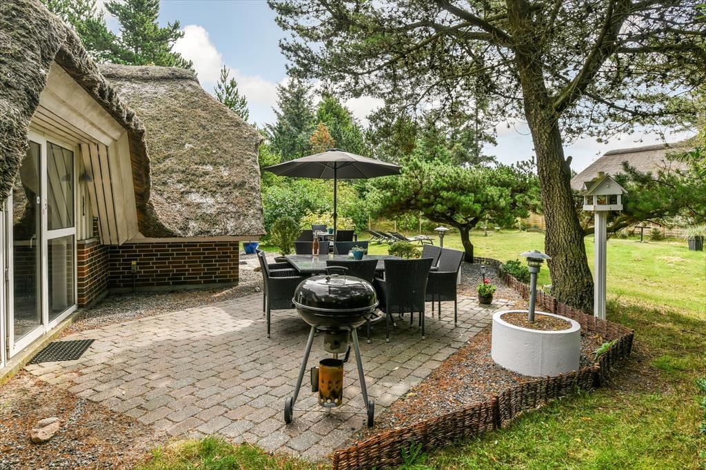Både fra stuens sofa- og spiseafdeling er der direkte adgang til terrassemiljøet, så når vejret er lunt og sommerligt, skal du blot åbne glasdørene for at skabe fri passage mellem ude og inde. Med andre ord kan du nemt tage en kop kaffe eller en bog med ud til den sydvendte terrasse, der breder sig ud mod den fredfyldte og grønne baghave. Har du små børn med på ferie, vil de sikkert blive glade for gyngerne og sandkassen, og græsplænen kan oplagt danne underlaget, hvis I vil kaste med frisbee, spille vikingespil eller tumle med hunden.