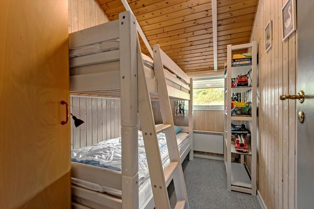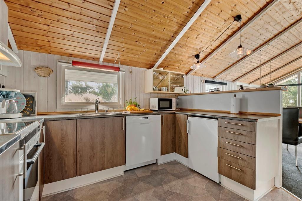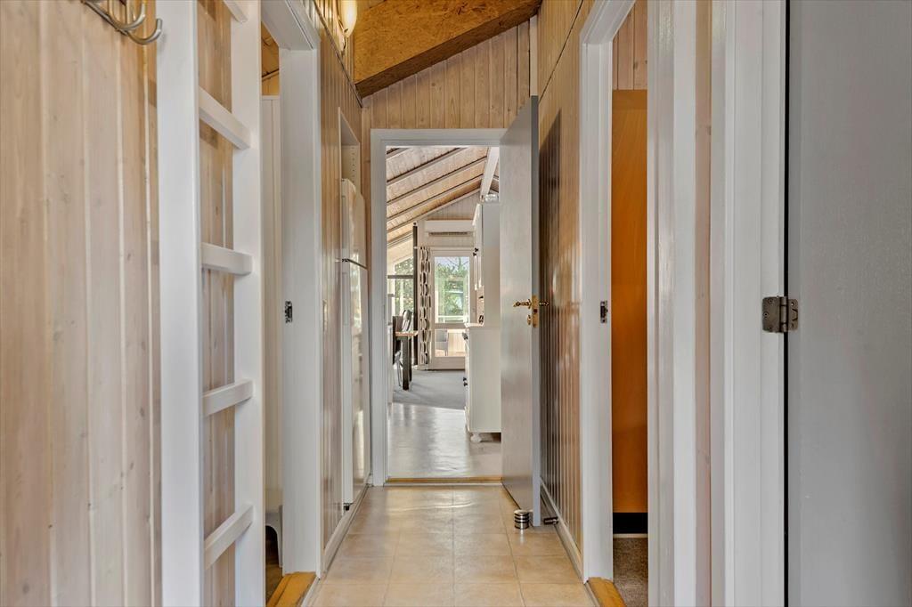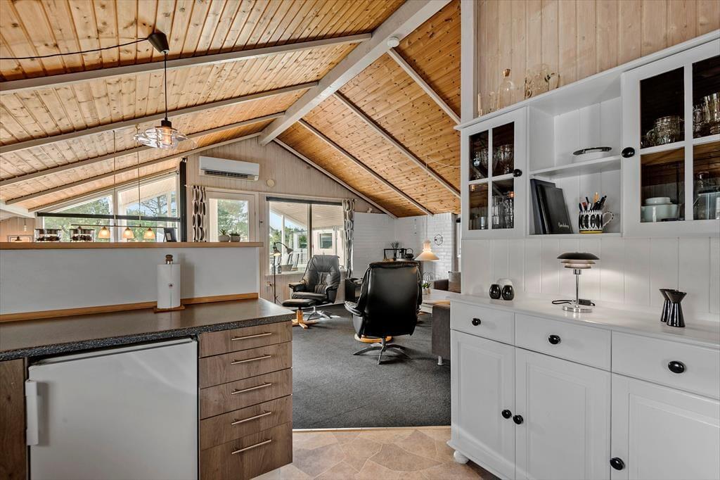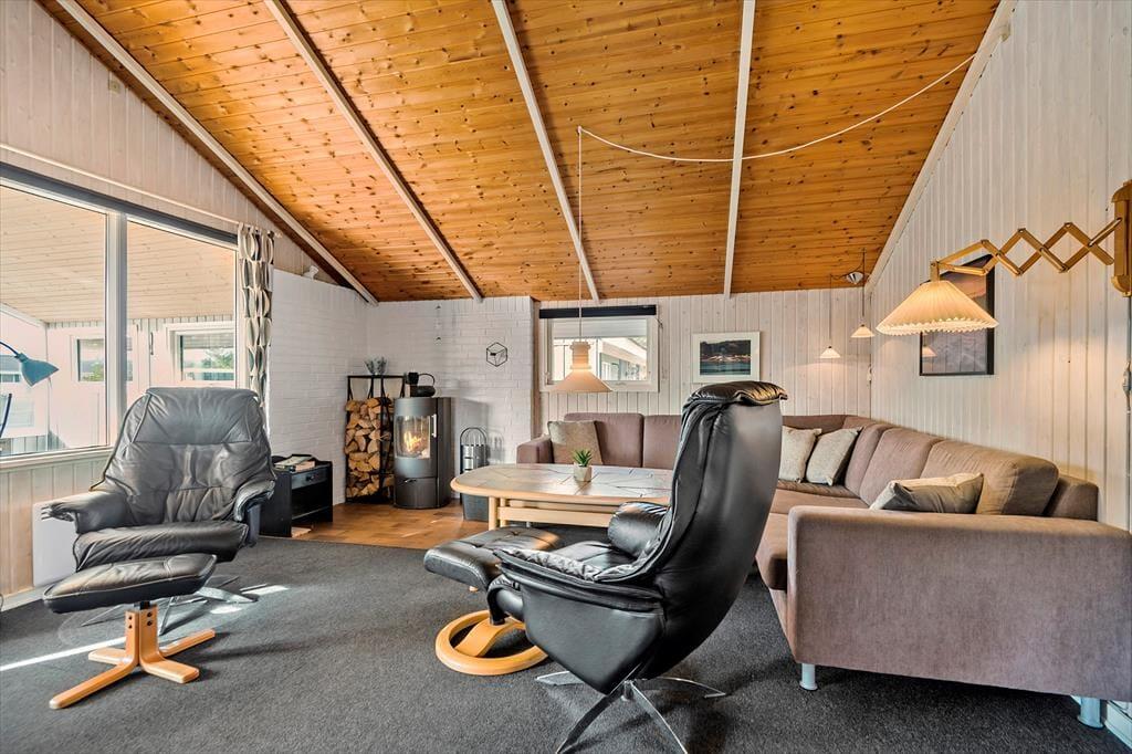 Sommerhuset har en fornuftig planløsning med tre soveværelser og et badeværelse – og selvom saunaen på sidstnævnte med garanti kan blive et hit, er det nu nok alligevel i stuen, at du kommer til at tilbringe de fleste af dagens vågne timer. I stuen er der loft til kip og store vinduespartier, der sammen med brændeovnen bidrager til hyggestemningen, og lige meget om du har lyst til at slappe af i sofaafdelingen eller spille brætspil ved spisebordet med familien, kan du føle dig godt tilpas. Et veludstyret køkken ligger i åben forbindelse med stuen, og det er en rar detalje, for så behøver du ikke at gå glip af hyggesnakken og det sociale samvær, selvom du skal forberede aftensmaden.