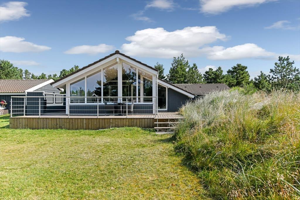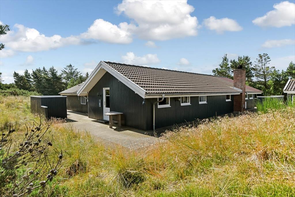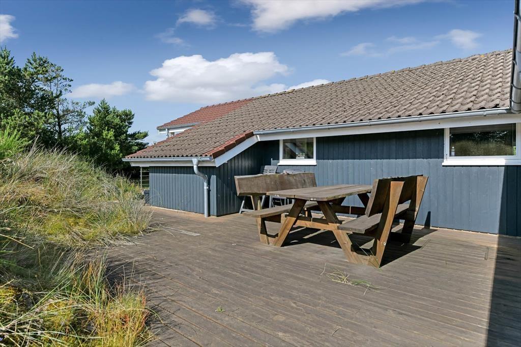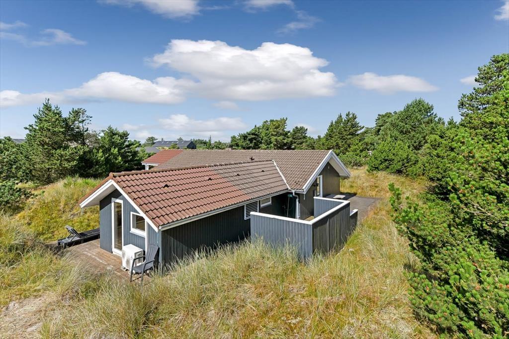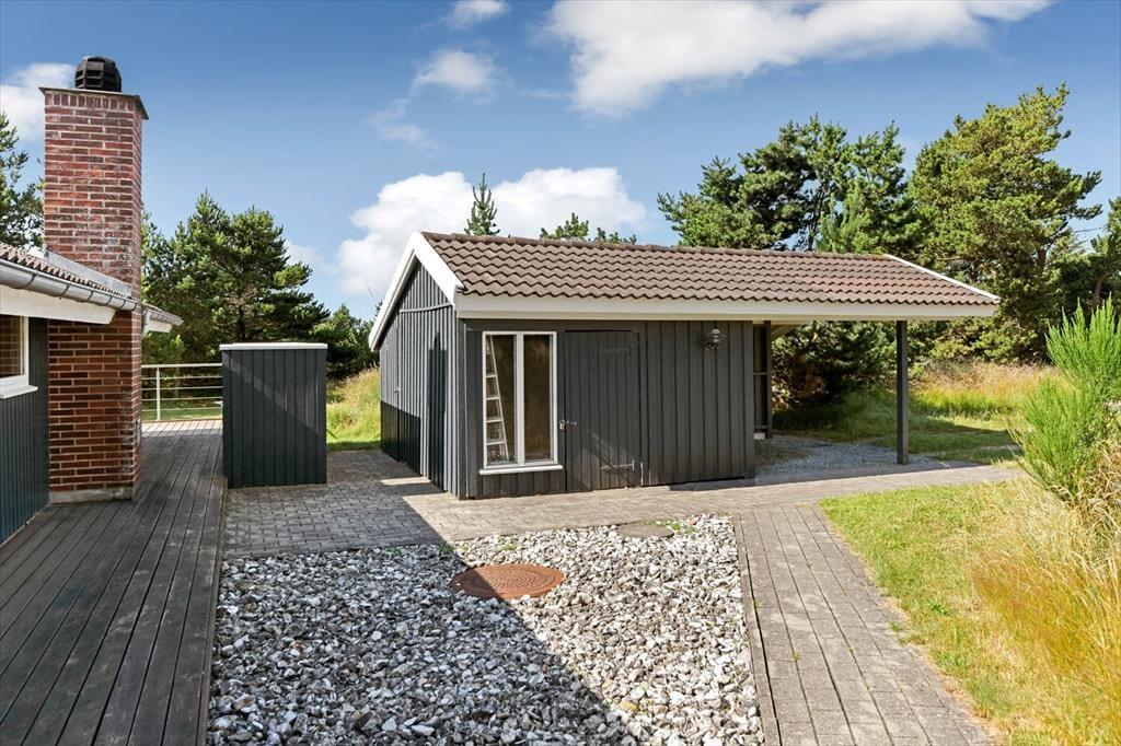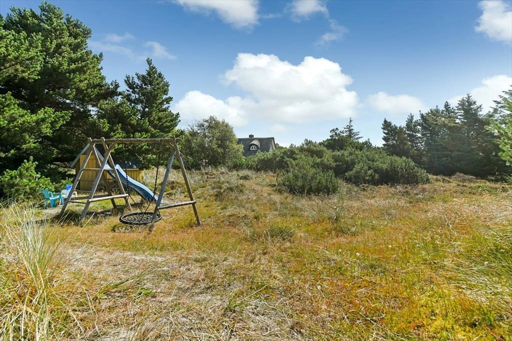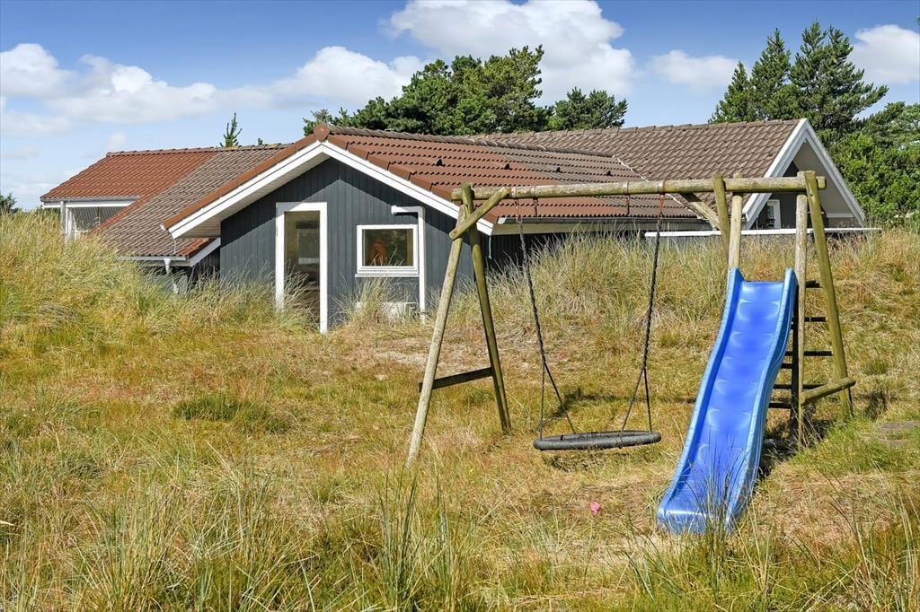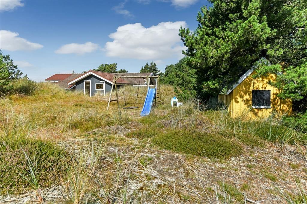 På den store naturgrund er du omgivet af små, marehalmsklædte klitter og flotte fyrretræer, når du slapper af i solen. En stor terrasse breder sig mod øst, syd og vest, så mon ikke du nemt kan finde en tilfredsstillende siddeplads hele dagen lang – og hvis du leder efter ly om aftenen, når duggen er ved at falde, kan du og familien rykke ind på den afskærmede og overdækkede del af opholdsmiljøet. Til de yngste feriegæster er der et gyngestativ med rutsjebane og et legehus, og bilen kan holde trygt i carporten ud mod vejen.