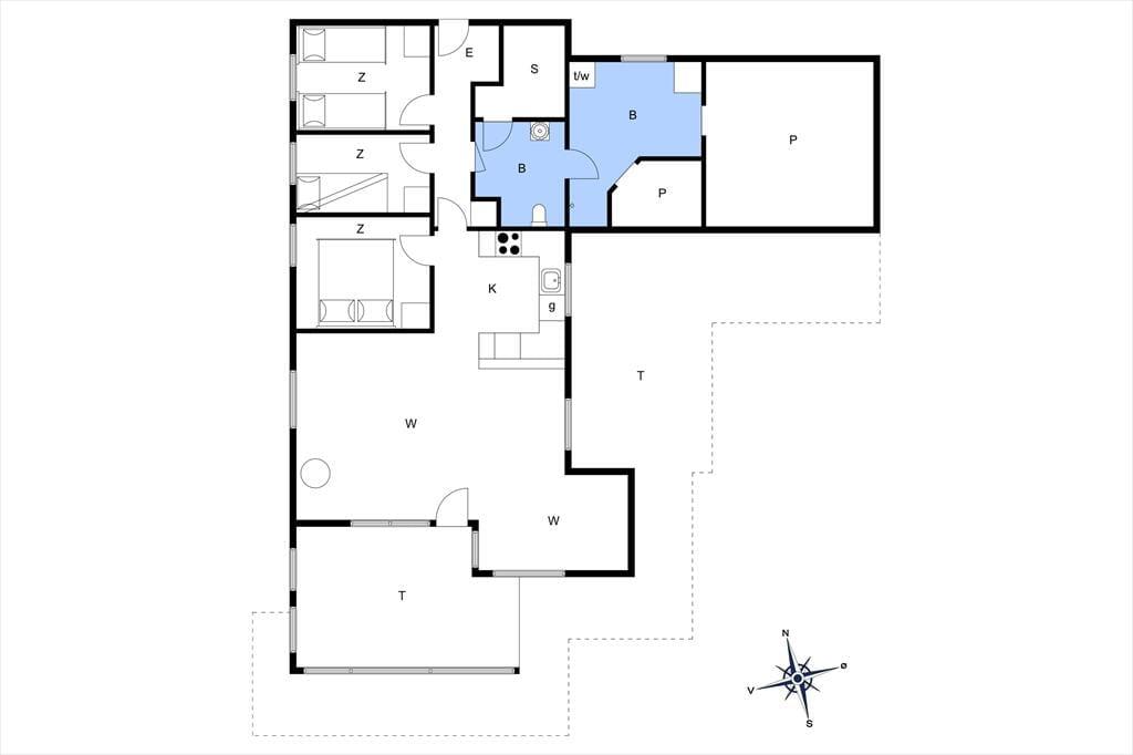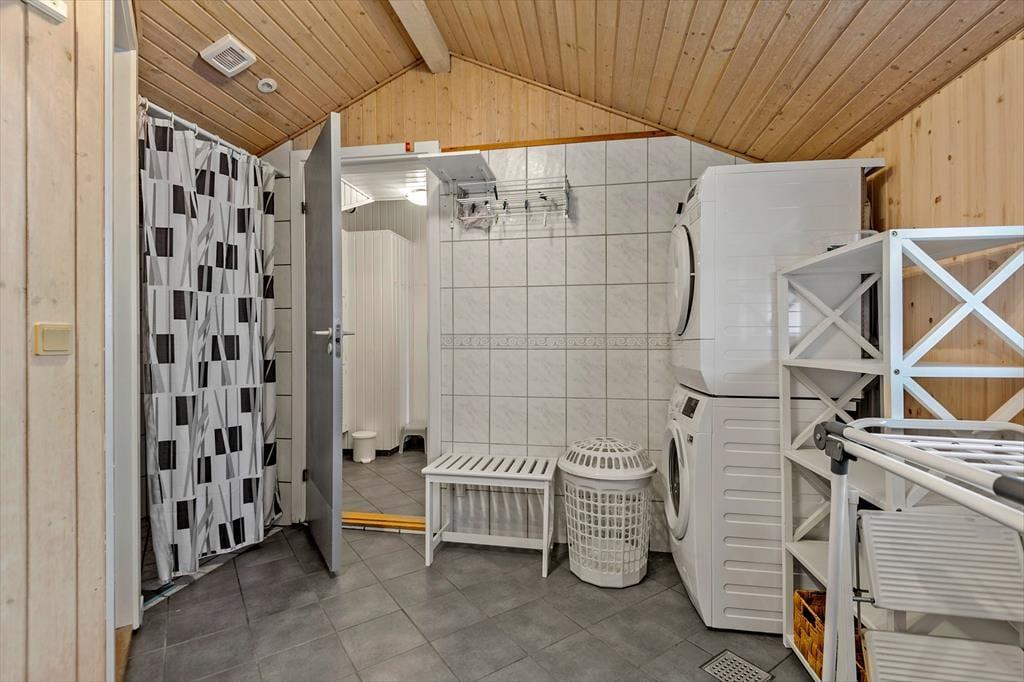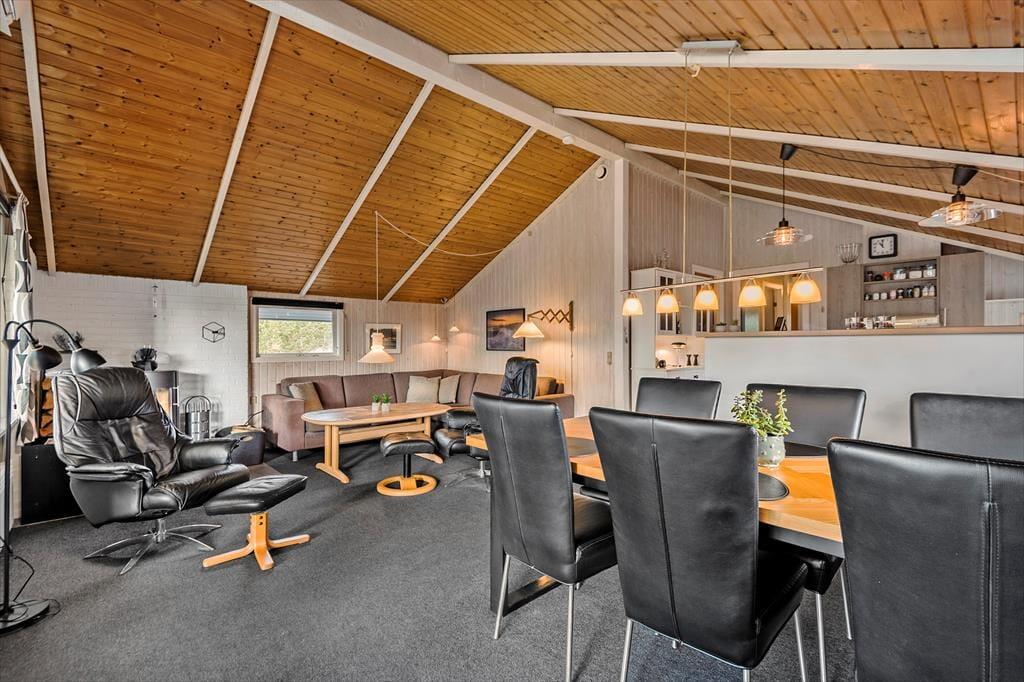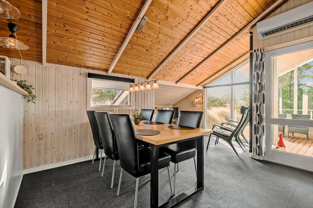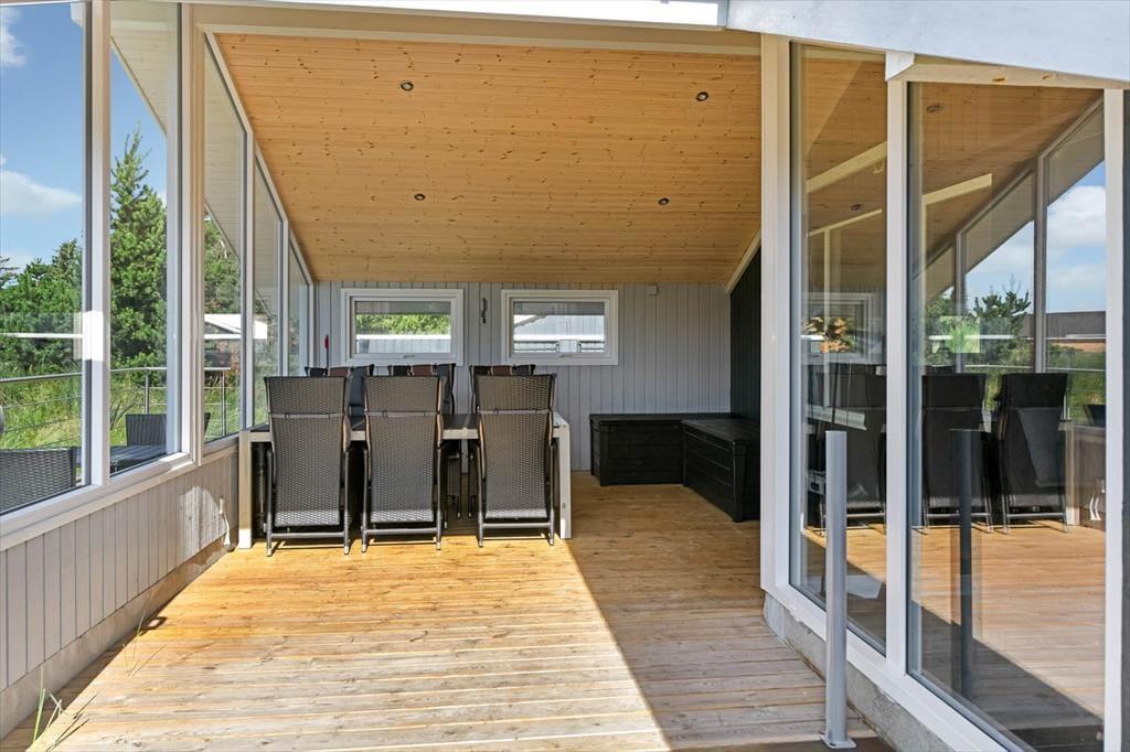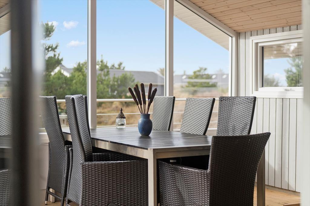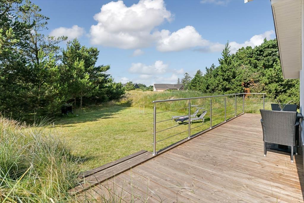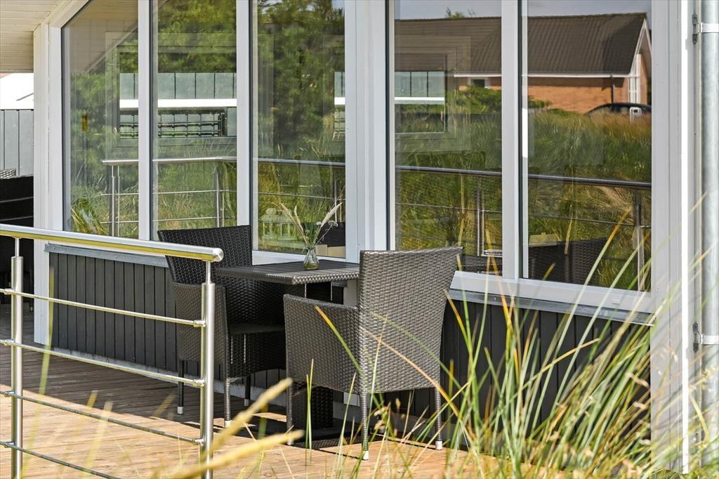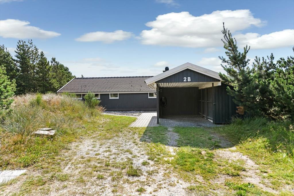 På den store naturgrund er du omgivet af små, marehalmsklædte klitter og flotte fyrretræer, når du slapper af i solen. En stor terrasse breder sig mod øst, syd og vest, så mon ikke du nemt kan finde en tilfredsstillende siddeplads hele dagen lang – og hvis du leder efter ly om aftenen, når duggen er ved at falde, kan du og familien rykke ind på den afskærmede og overdækkede del af opholdsmiljøet. Til de yngste feriegæster er der et gyngestativ med rutsjebane og et legehus, og bilen kan holde trygt i carporten ud mod vejen.
