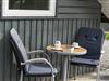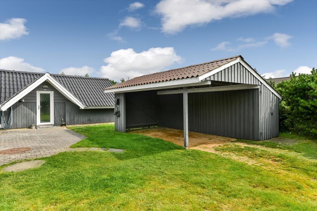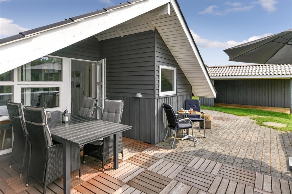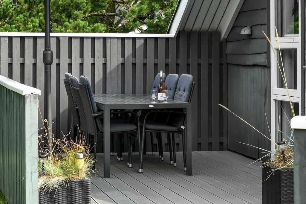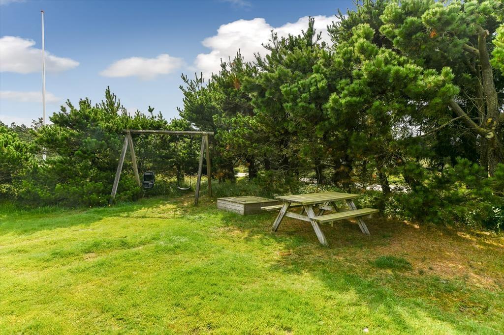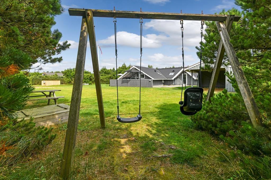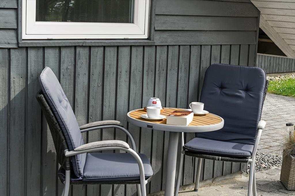 Sommerhusets udearealer er godt afskærmede af nåletræer ud mod vejen og ind mod naboerne. På græsplænen har hele familien god plads til at spille bold, slå kolbøtter og lege fangeleg, og du bliver helt sikker populær, hvis du tager tjansen med at skubbe børnene på gyngerne. Hvis ungerne er store nok til at gynge selv, eller hvis I alle trænger til at blive frisket op med kaffe og saftevand, er terrassen et skønt sted at slå sig ned – den er stor, delvist overdækket og har flere gode solkroge, så der er flere dejlige siddepladser at vælge imellem.
