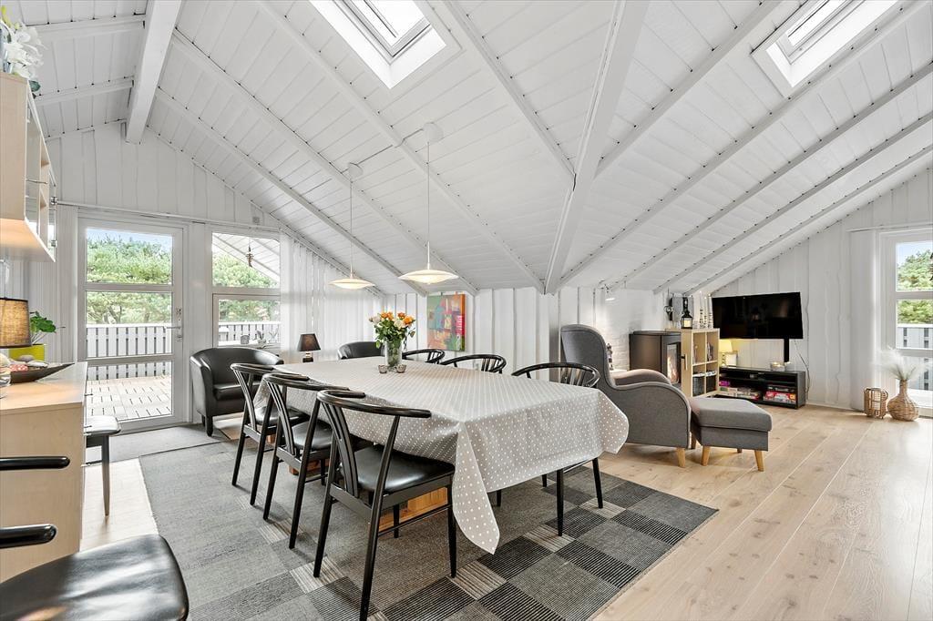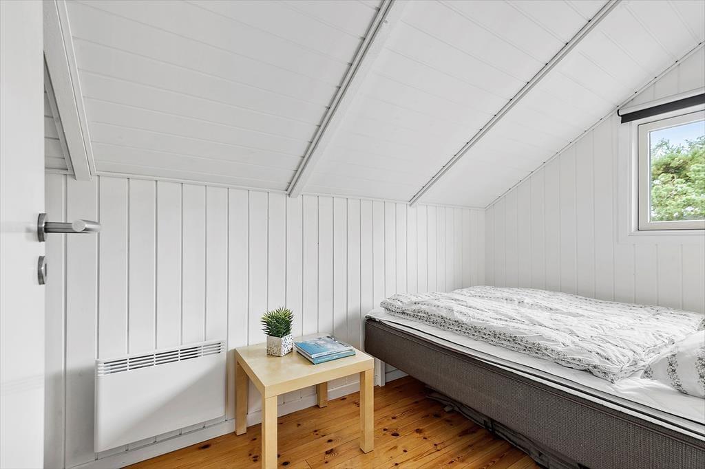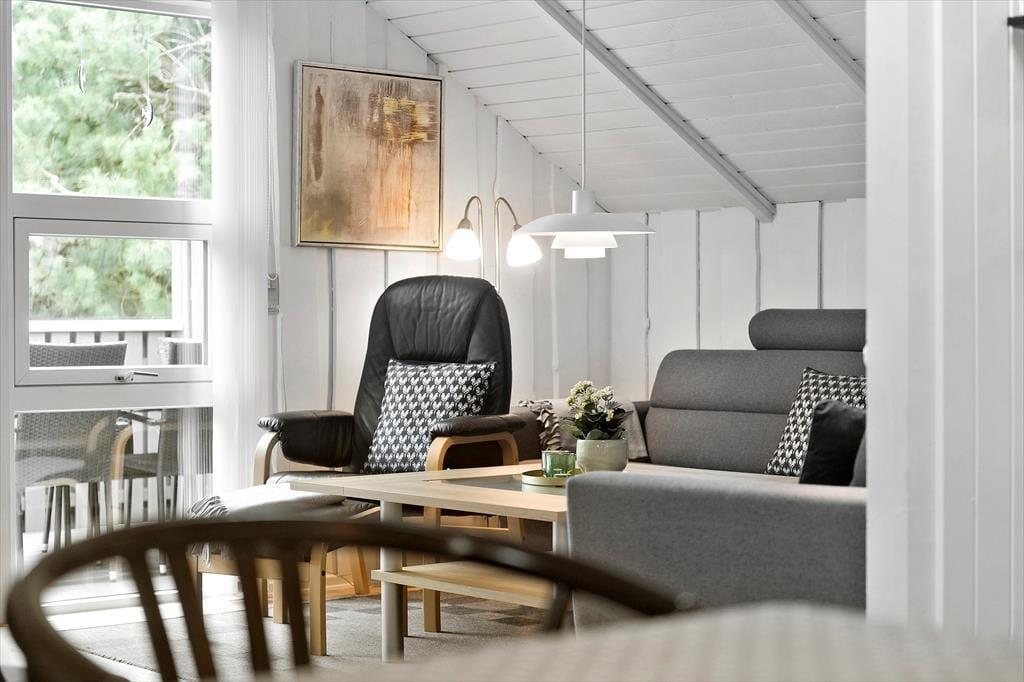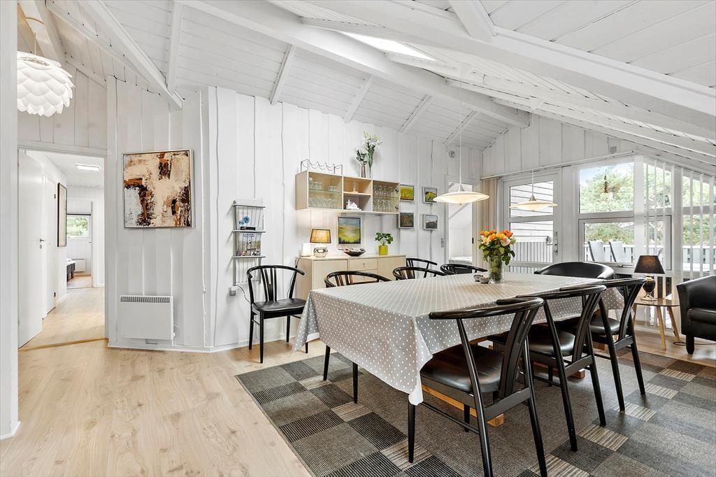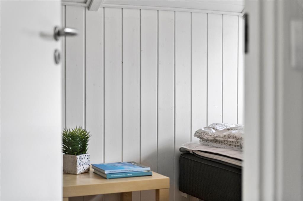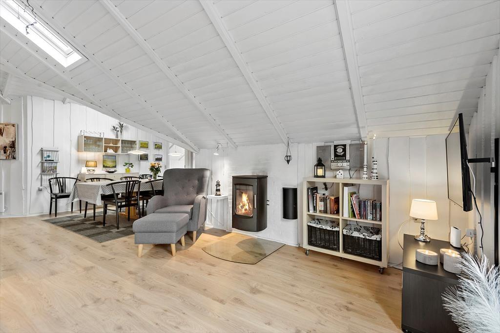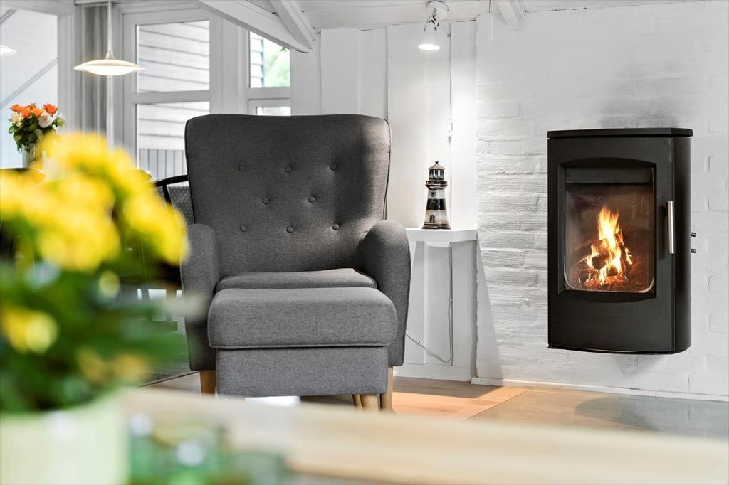 Med fire soveværelser, et badeværelse og et gæstetoilet passer sommerhusets planløsning fint til otte personer – og to husdyr er også velkomne, så du har mulighed for at have både familie, venner og selv hunden med på ferie. Stuen er det oplagte samlingspunkt, og her kan I hygge jer i lyse og velordnede rammer. Lænestolen ved brændeovnen fungerer som den perfekte hyggekrog, hvis du har lyst til at fordybe dig i en god bog eller komme videre med strikkeprojektet, og hvis nogen i familien går i gang med at lave mad i køkkenet, kan du sætte dig hen på en af barstolene for at holde dem med selskab. Måltidet kan I nyde sammen ved spisebordet, og så er det spørgsmålet, om dagen skal sluttes af med en omgang wellness i form af et varmt spabad og en rolig stund i saunaen.
