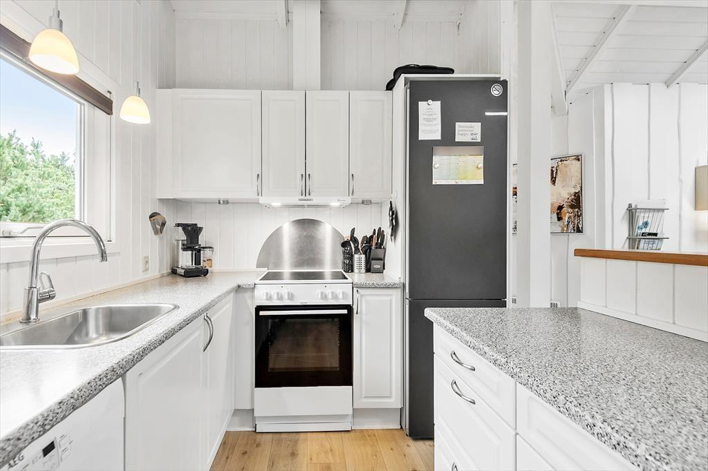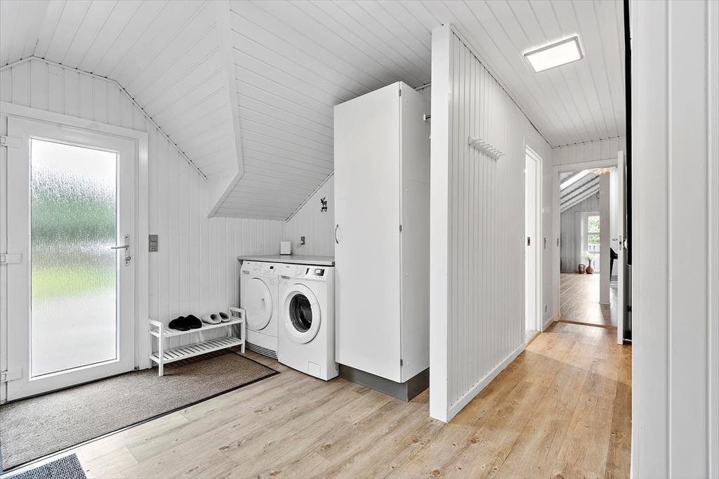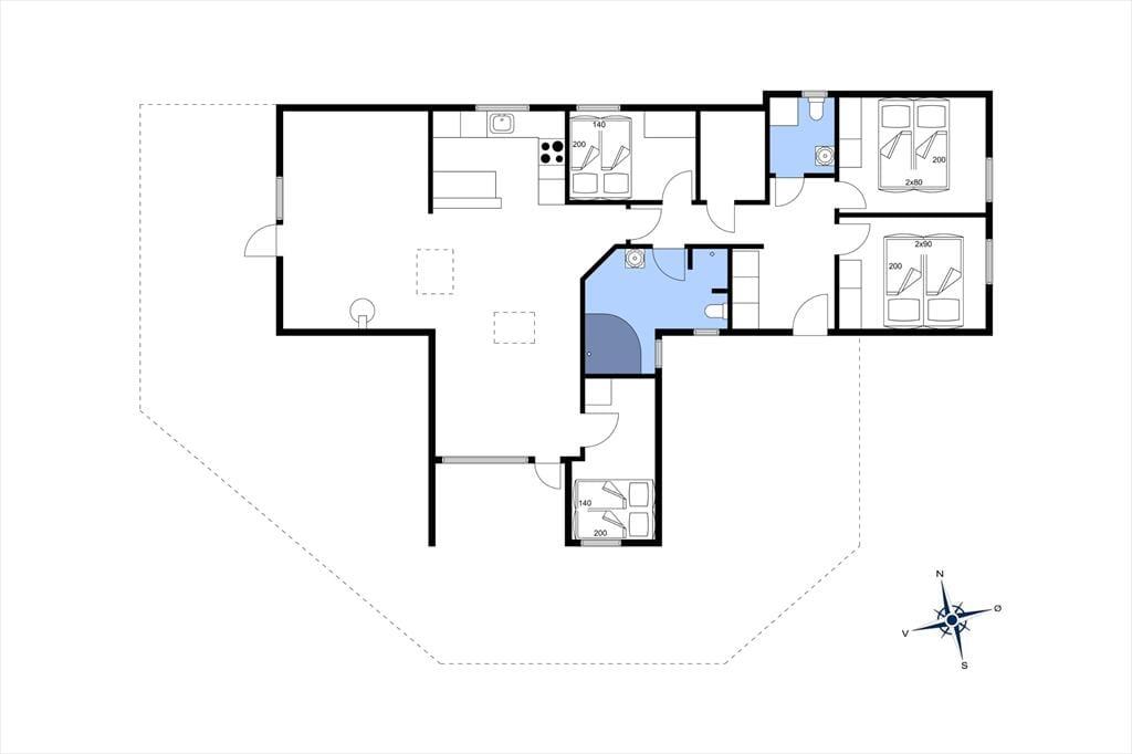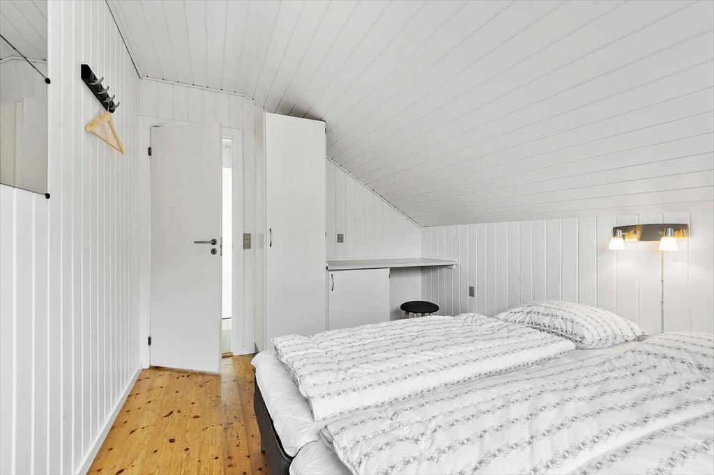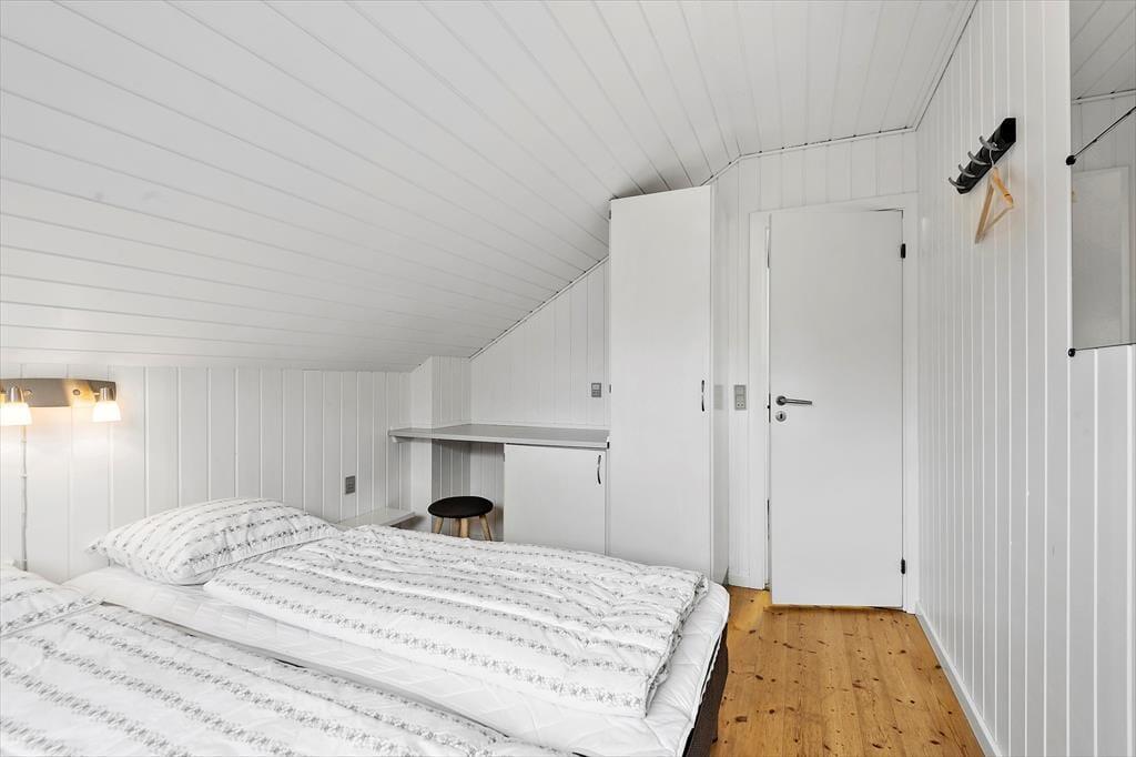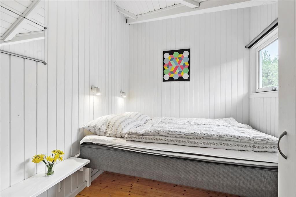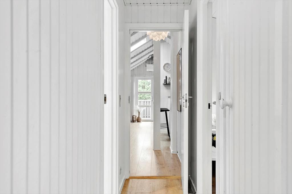 Med fire soveværelser, et badeværelse og et gæstetoilet passer sommerhusets planløsning fint til otte personer – og to husdyr er også velkomne, så du har mulighed for at have både familie, venner og selv hunden med på ferie. Stuen er det oplagte samlingspunkt, og her kan I hygge jer i lyse og velordnede rammer. Lænestolen ved brændeovnen fungerer som den perfekte hyggekrog, hvis du har lyst til at fordybe dig i en god bog eller komme videre med strikkeprojektet, og hvis nogen i familien går i gang med at lave mad i køkkenet, kan du sætte dig hen på en af barstolene for at holde dem med selskab. Måltidet kan I nyde sammen ved spisebordet, og så er det spørgsmålet, om dagen skal sluttes af med en omgang wellness i form af et varmt spabad og en rolig stund i saunaen.
