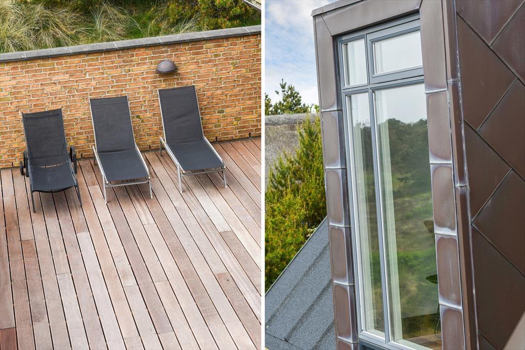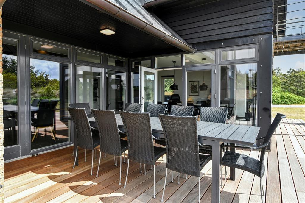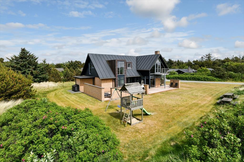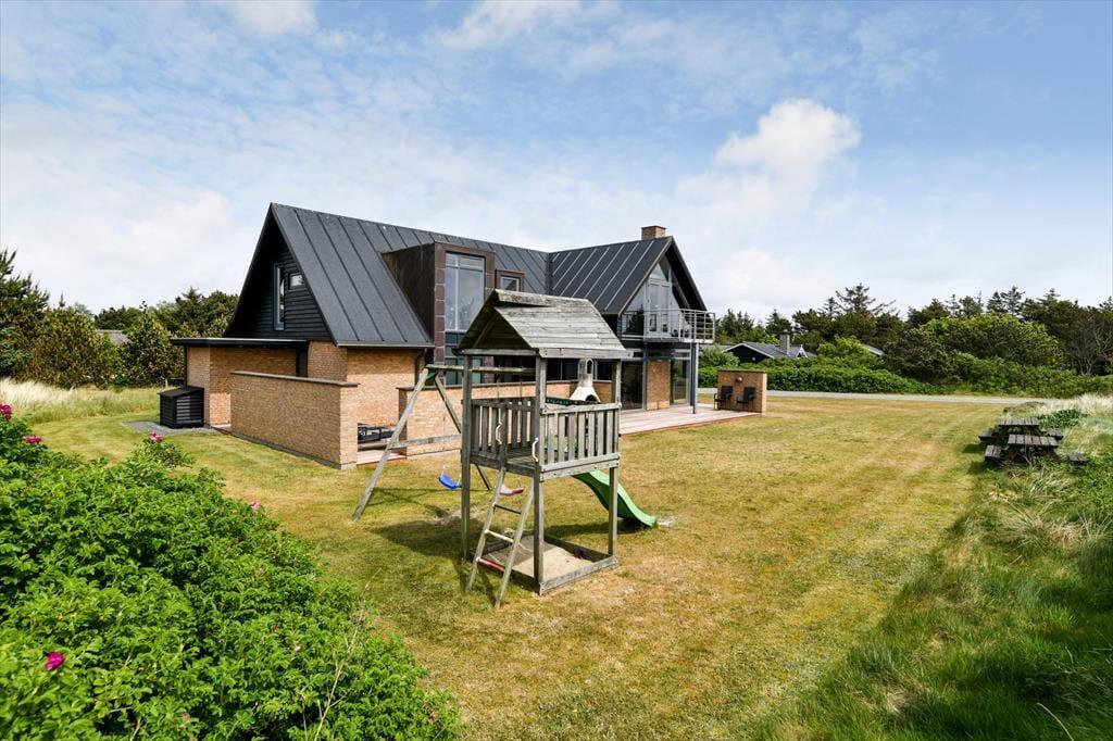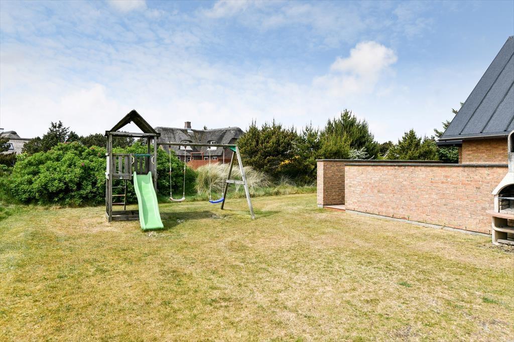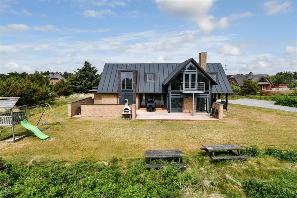 Det er ikke kun indenfor, at du og dit selskab har fine forhold, når I vil nyde ferien sammen med leg og afslapning. Også ude i det fri kan I se frem til at have det skønt på den store, grønne naturgrund, der byder på et sjovt legestativ til de yngste, flere bord-bænke-sæt og en dejlig græsplæne med plads til havespil. En stor og flot træterrasse breder sig mod syd, så her er solforholdene gode – og mon ikke du kan indsnuse den friske havluft og næsten høre bølgernes brusen, når du sidder her og læner dig tilbage?
