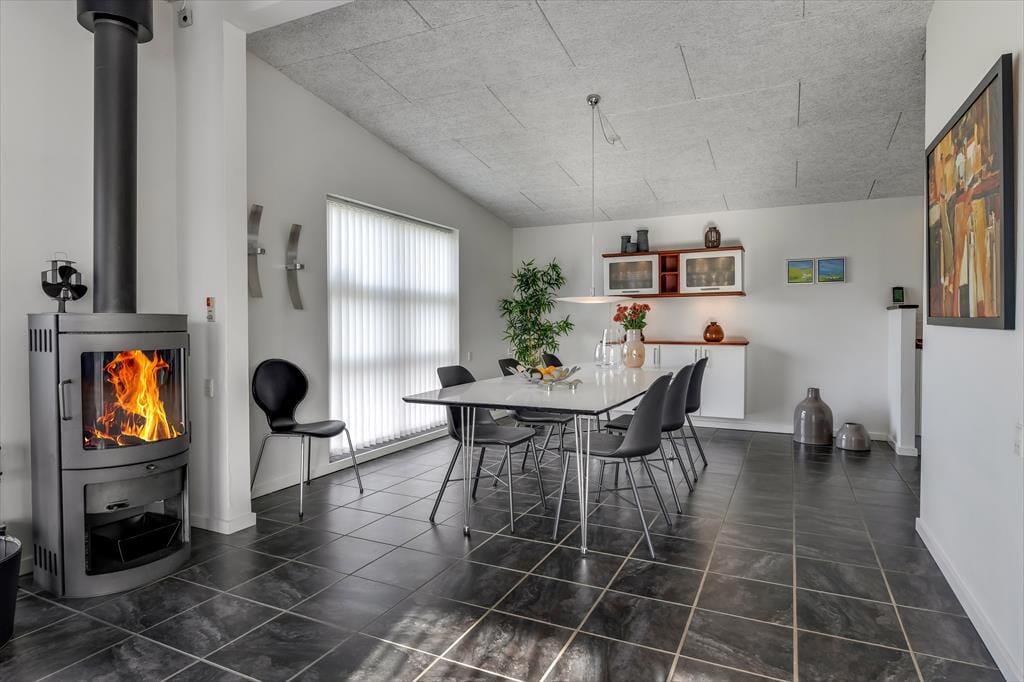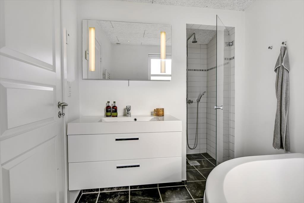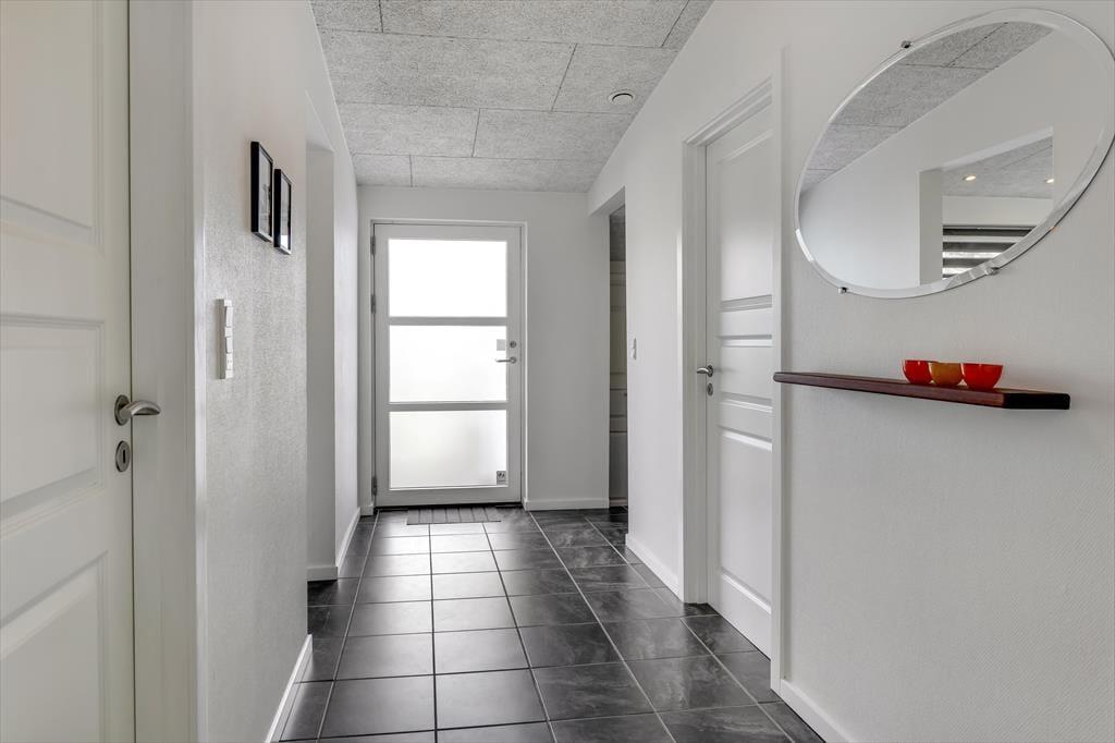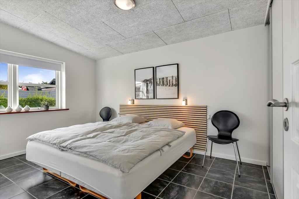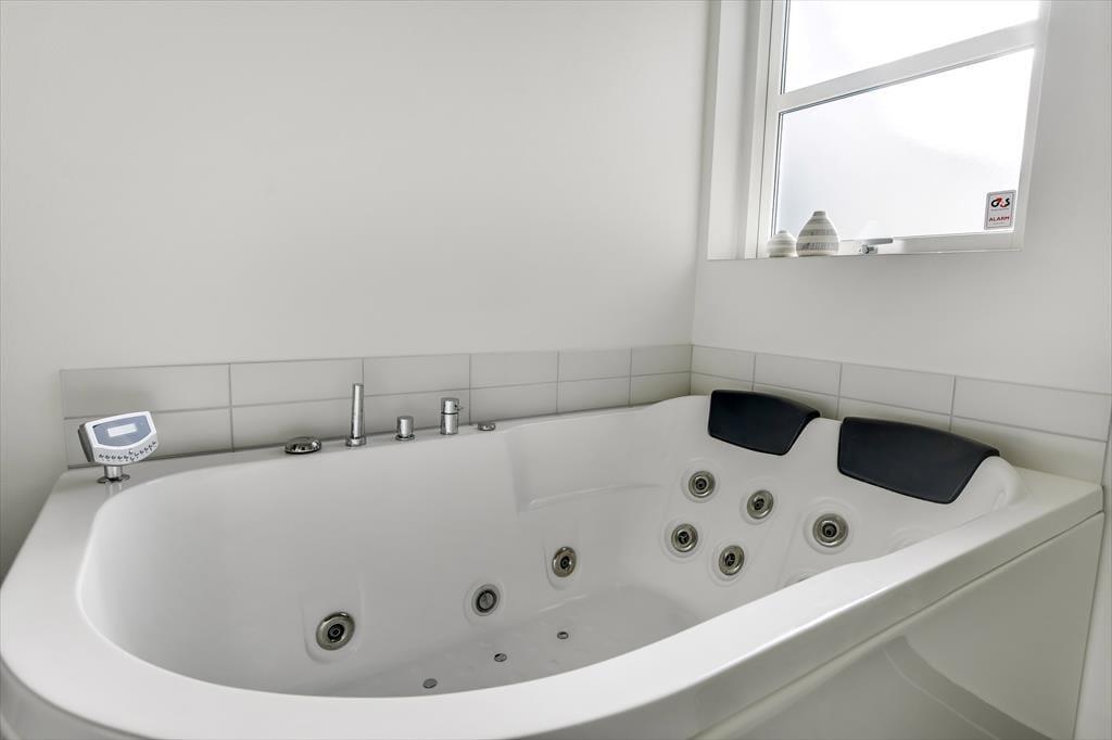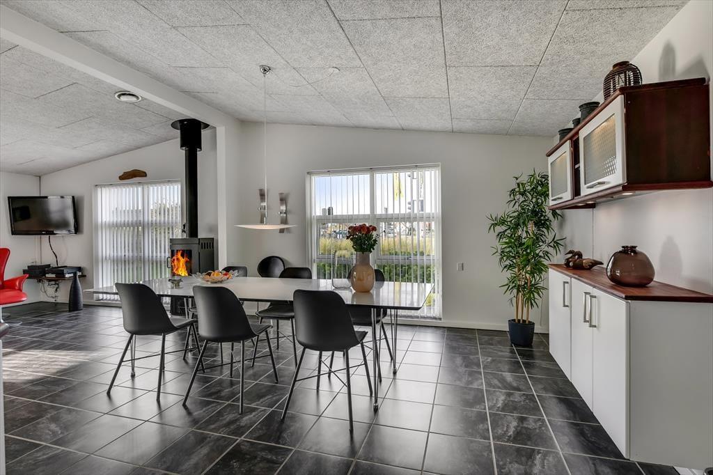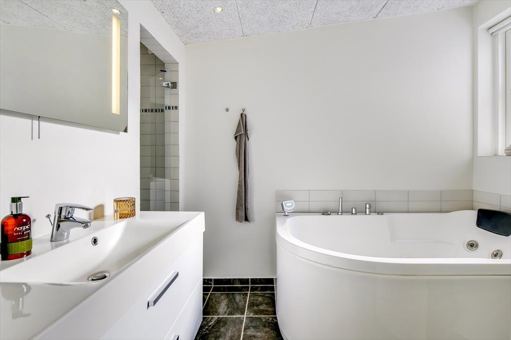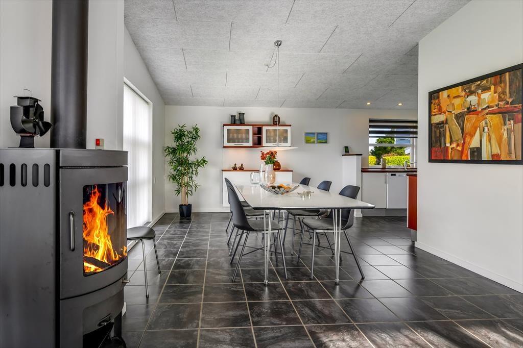 Indenfor i sommerhuset er hvid den gennemgående farve på vægge og interiør, og det mørke gulv giver en flot kontrast til alt det lyse. Fra entréen har du adgang til tre gode soveværelser og et pænt badeværelse, og et gangareal leder videre til husets gode bryggers og endnu et badeværelse. Sidstnævnte er værd at bemærke, for her står der et lækkert spabad, hvis du skulle trænge til en tilbagelænet pause i det varme vand. Stuen er derimod det oplagte samlingspunkt, når I alle vil hygge jer sammen – for eksempel med madlavning i det åbne køkken, brætspil omkring spisebordet eller sofaafslapning med udsigt til brændeovnen.