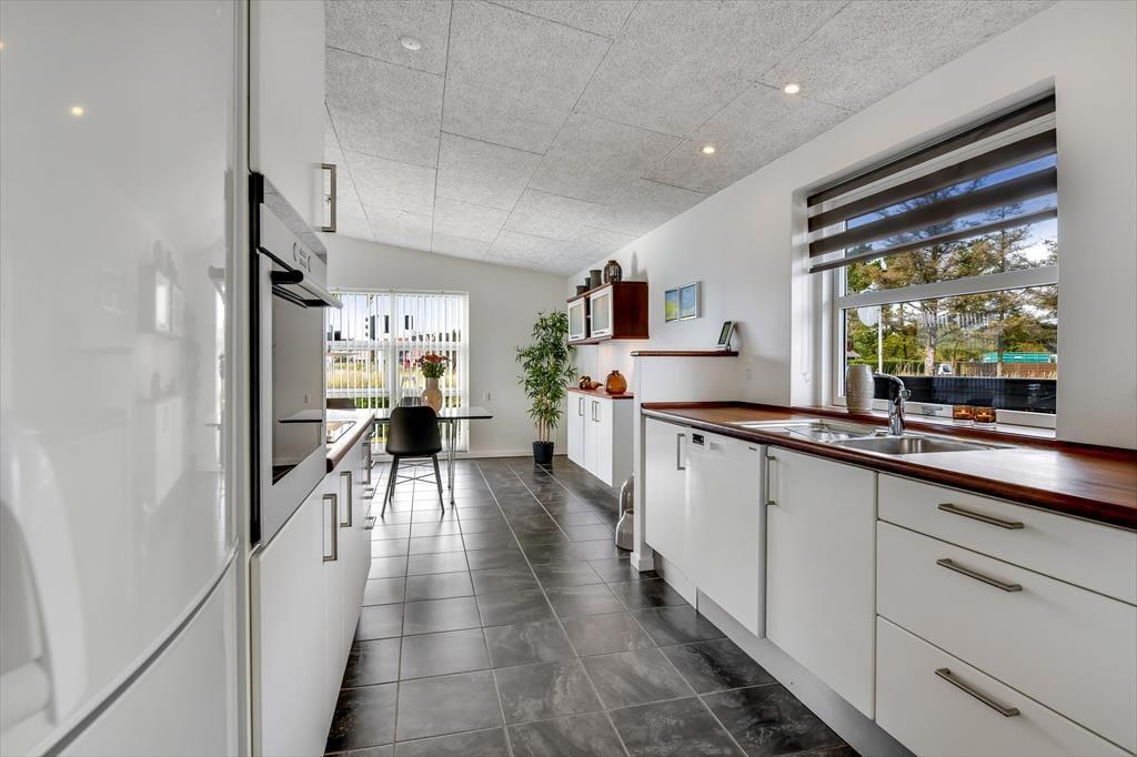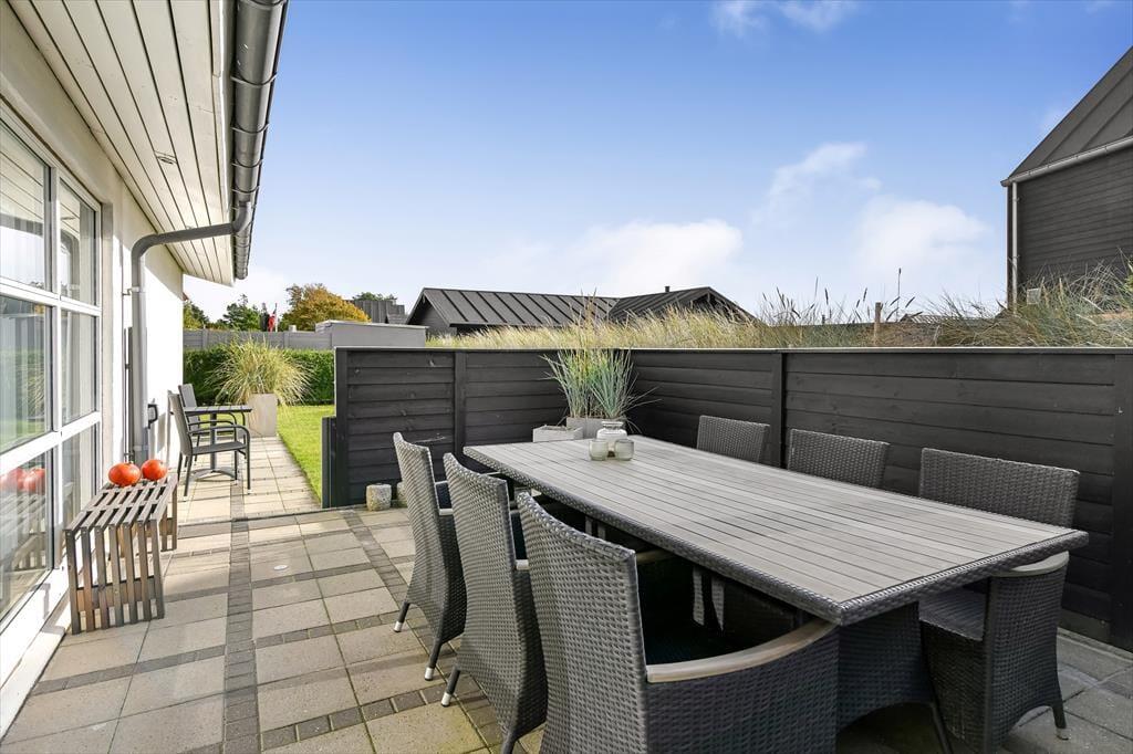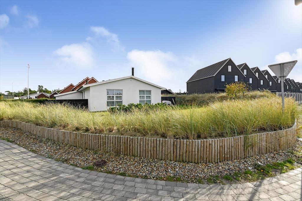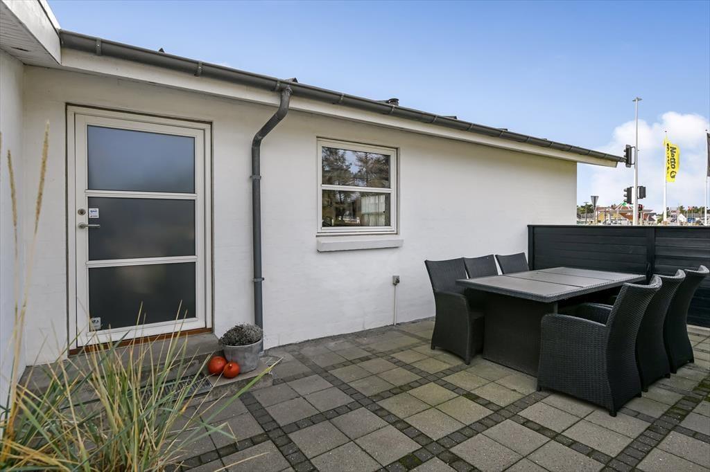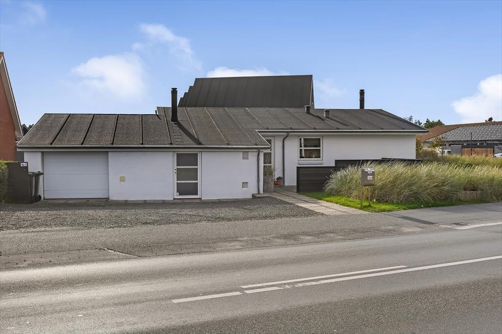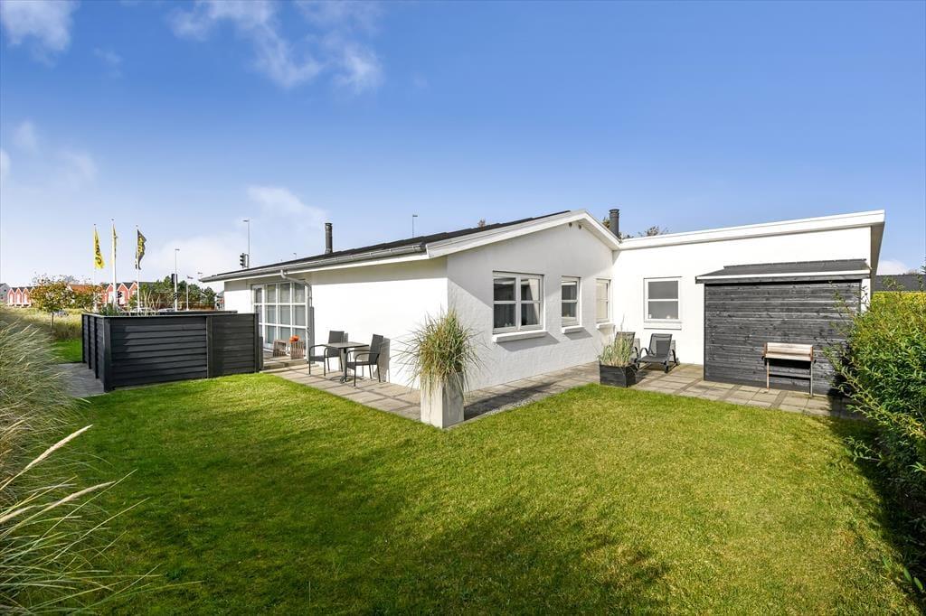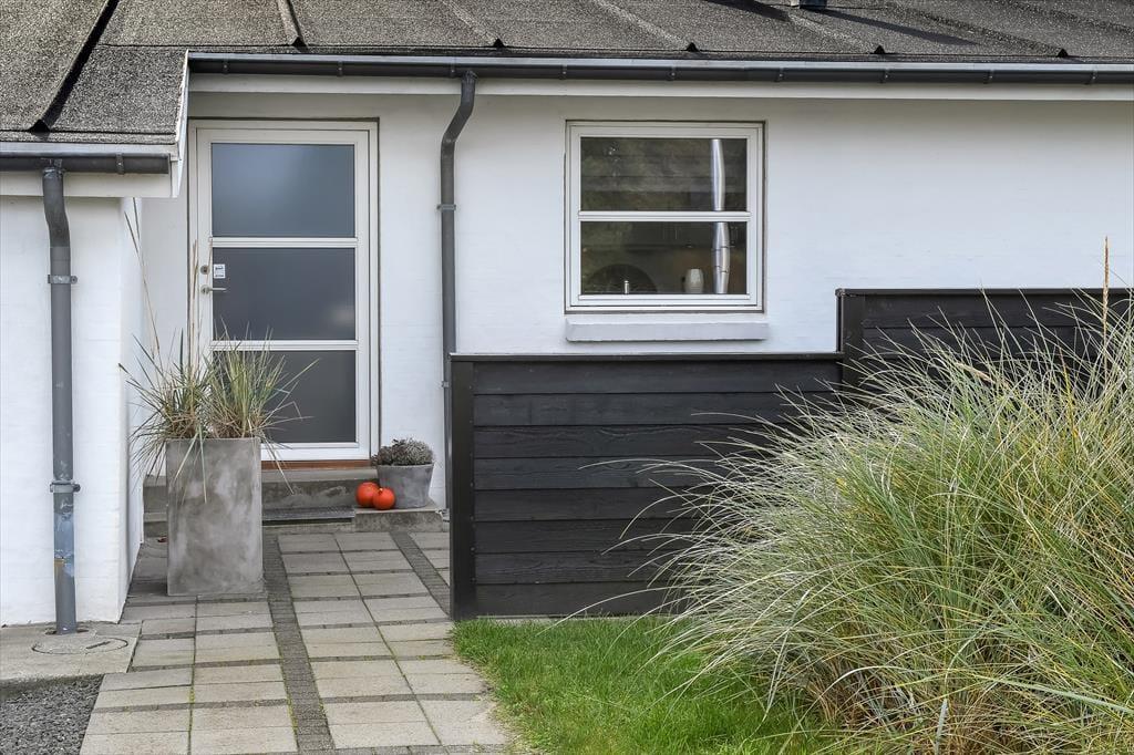 Selvom det er rart at være i stuen, er det nu fristende at rykke drivertilværelsen helt ud i det fri, når solen står højt på himlen. Ud mod vejen er der et terrasseareal ved hoveddøren, men mon ikke det er den sydvendte terrasse på den anden side af huset, der hurtigt bliver favoritten. Havens marehalmsklædte vold såvel som terrassehegnet skærmer udearealet godt af, så du kan læse avis, solbade eller grille i rolige rammer, og på græsplænen er der også plads til at slænge sig i solen på et tæppe. På grusarealet ud mod vejen kan der holde to biler, og der er også plads til parkering i husets garage.
