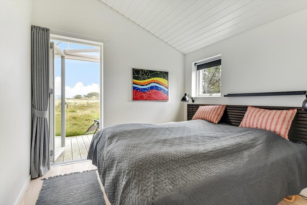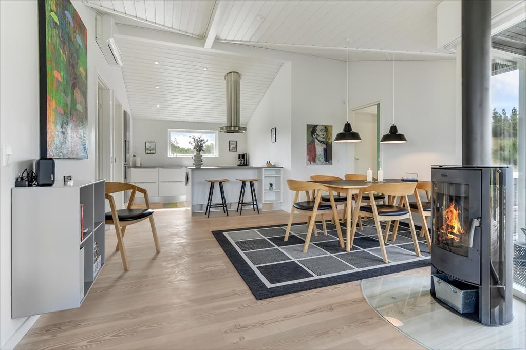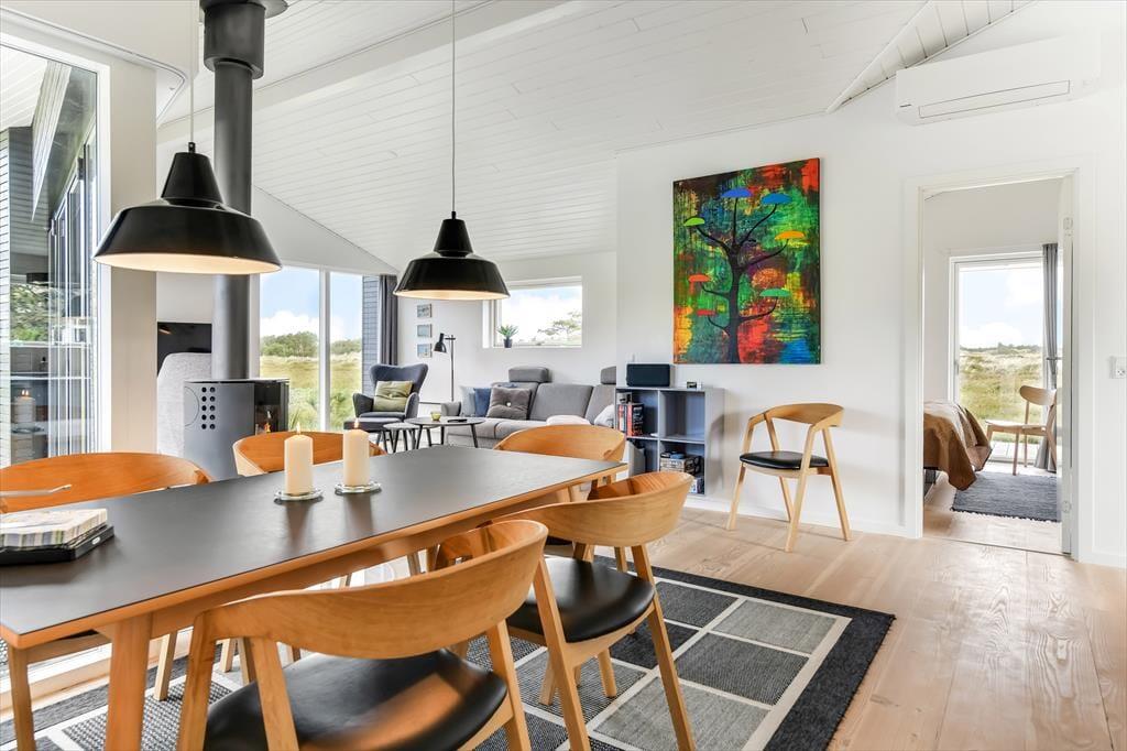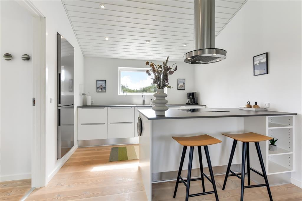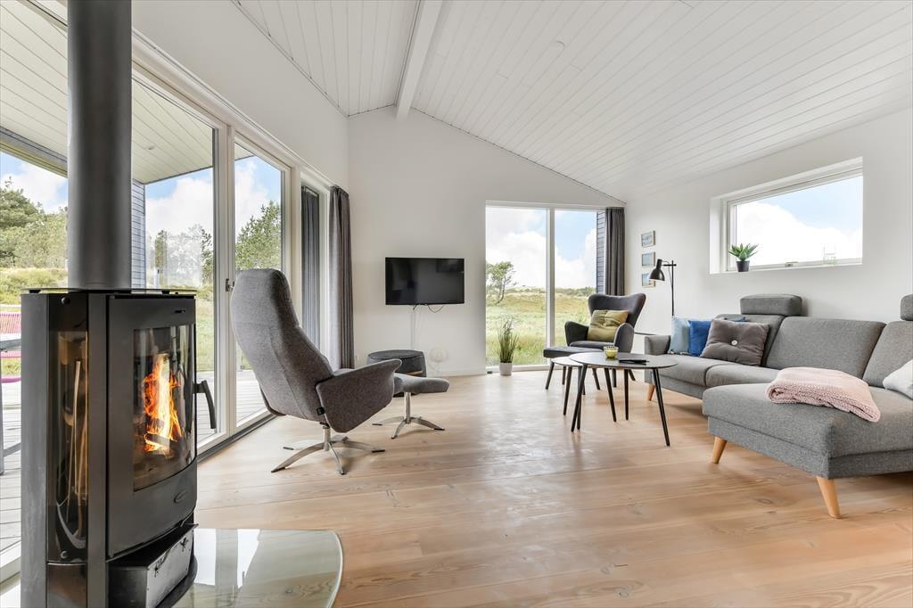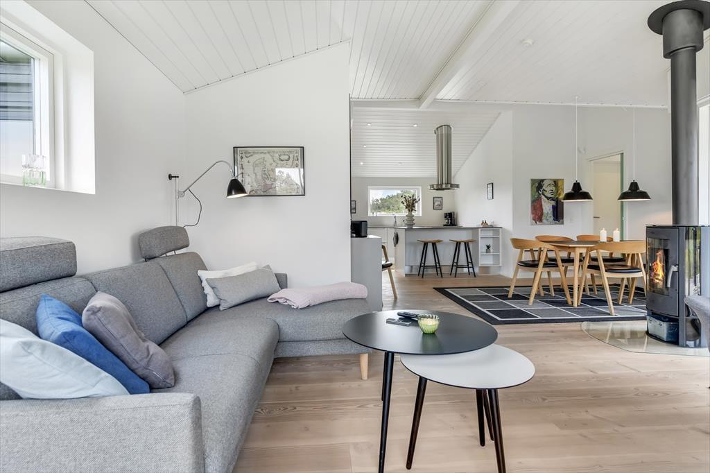 Det er oplagt at lade ferielivet foregå i helt roligt tempo, når det udspiller sig her i dette moderne sommerhus fra 2017. De lyse og velindrettede rum inviterer til at sove længe, tage velgørende brusebade og gøre noget ekstra ud af madlavningen, hvis det er det, du drømmer om – og timelange hyggestunder med brætspil, strikketøjet eller en spændende krimi kan også nemt indgå i dagsprogrammet. Når vejret er til det, er det hyggeligt at tænde op i brændeovnen, inden du sætter dig godt til rette i stuens sofa eller en af de komfortable lænestole. Ikke bare i stuen, men også fra soveværelserne er den betagende udsigt med til at understrege fornemmelsen af ro og fred, så det er det perfekte sted at lade op og samle ny energi.