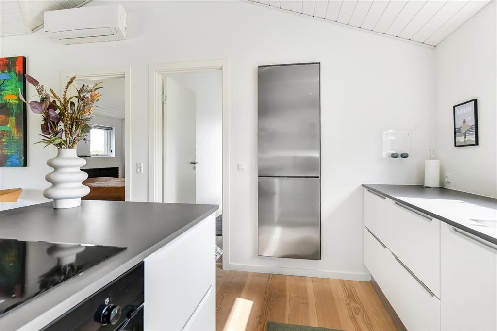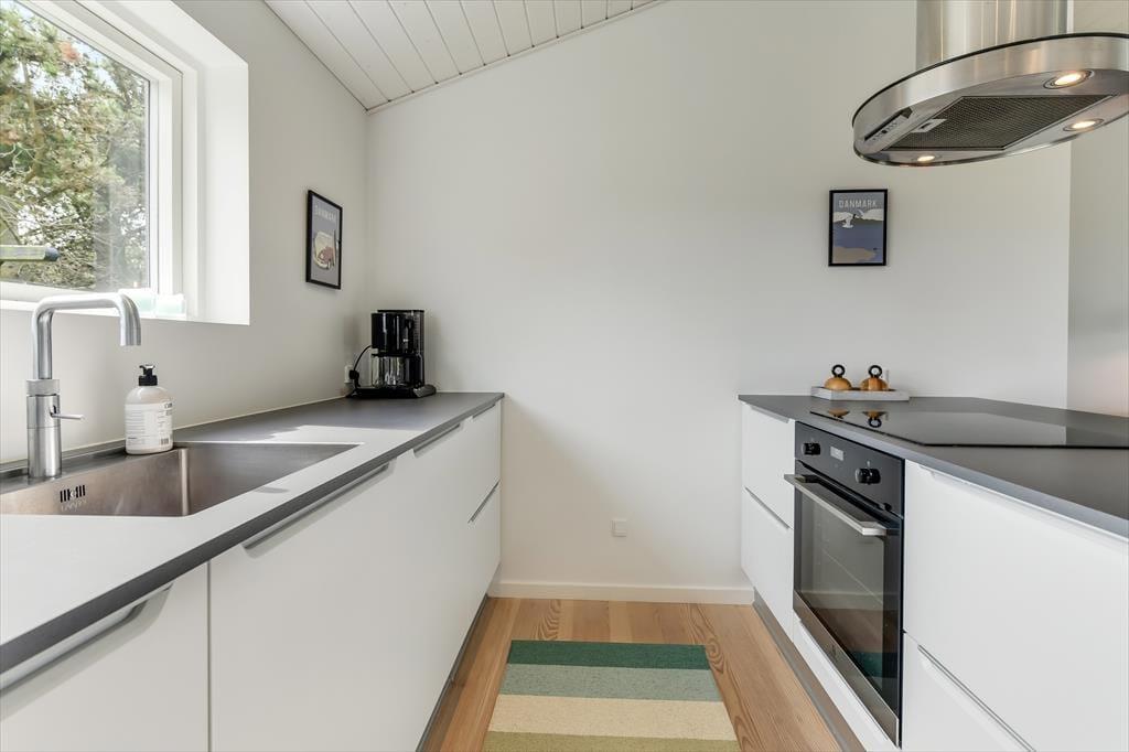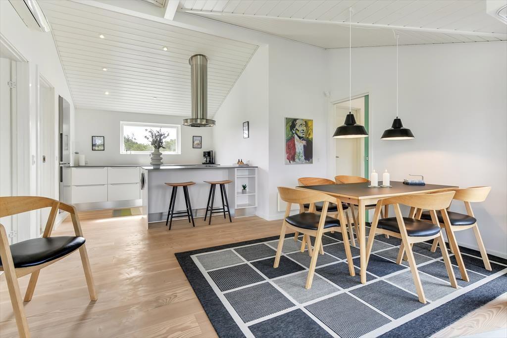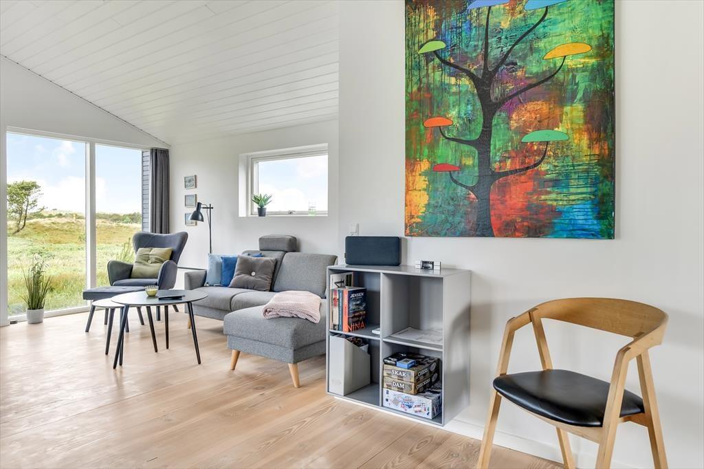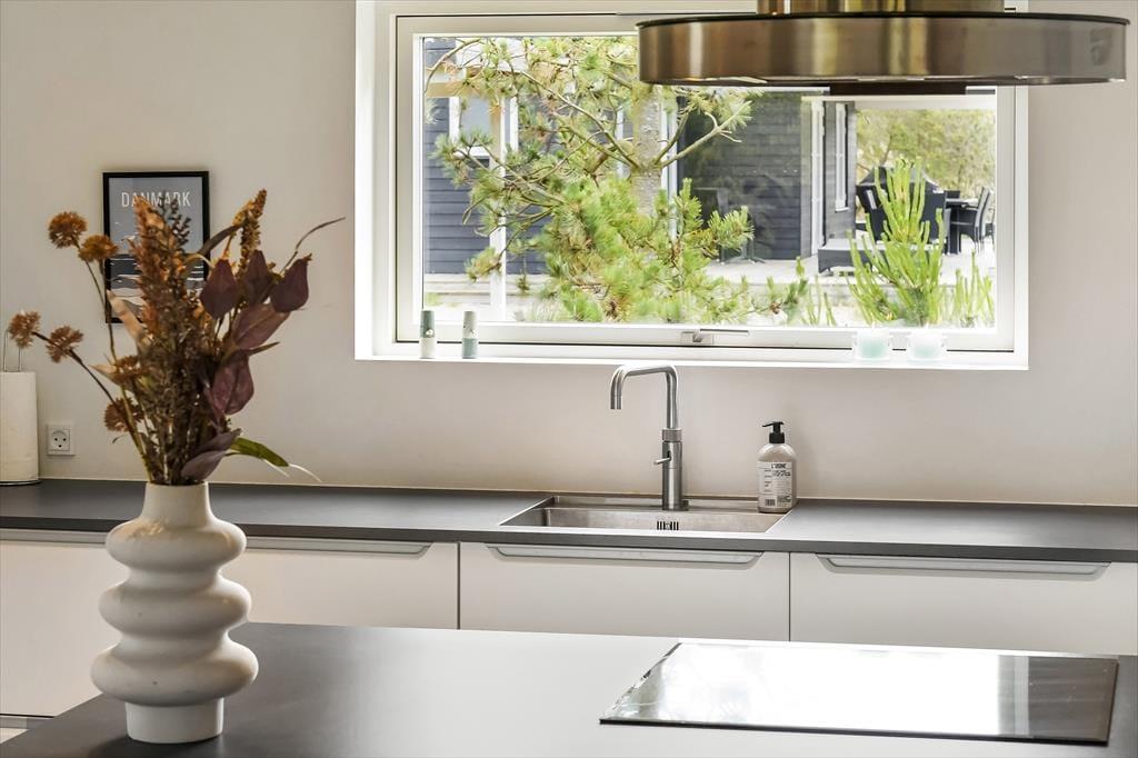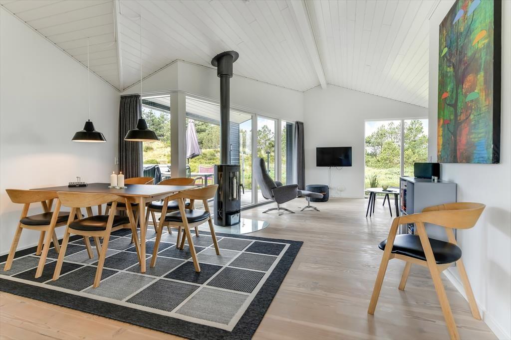 Det er oplagt at lade ferielivet foregå i helt roligt tempo, når det udspiller sig her i dette moderne sommerhus fra 2017. De lyse og velindrettede rum inviterer til at sove længe, tage velgørende brusebade og gøre noget ekstra ud af madlavningen, hvis det er det, du drømmer om – og timelange hyggestunder med brætspil, strikketøjet eller en spændende krimi kan også nemt indgå i dagsprogrammet. Når vejret er til det, er det hyggeligt at tænde op i brændeovnen, inden du sætter dig godt til rette i stuens sofa eller en af de komfortable lænestole. Ikke bare i stuen, men også fra soveværelserne er den betagende udsigt med til at understrege fornemmelsen af ro og fred, så det er det perfekte sted at lade op og samle ny energi.