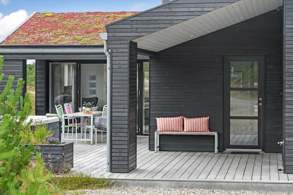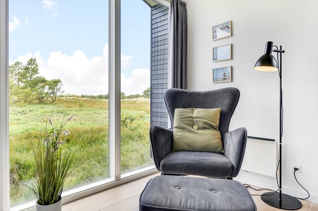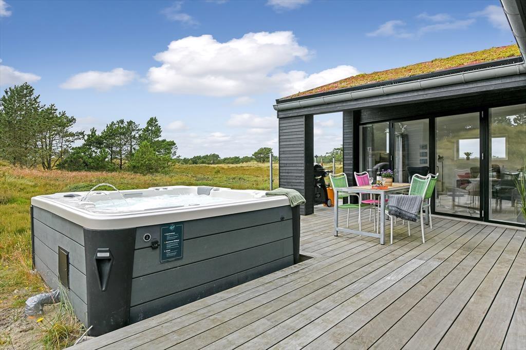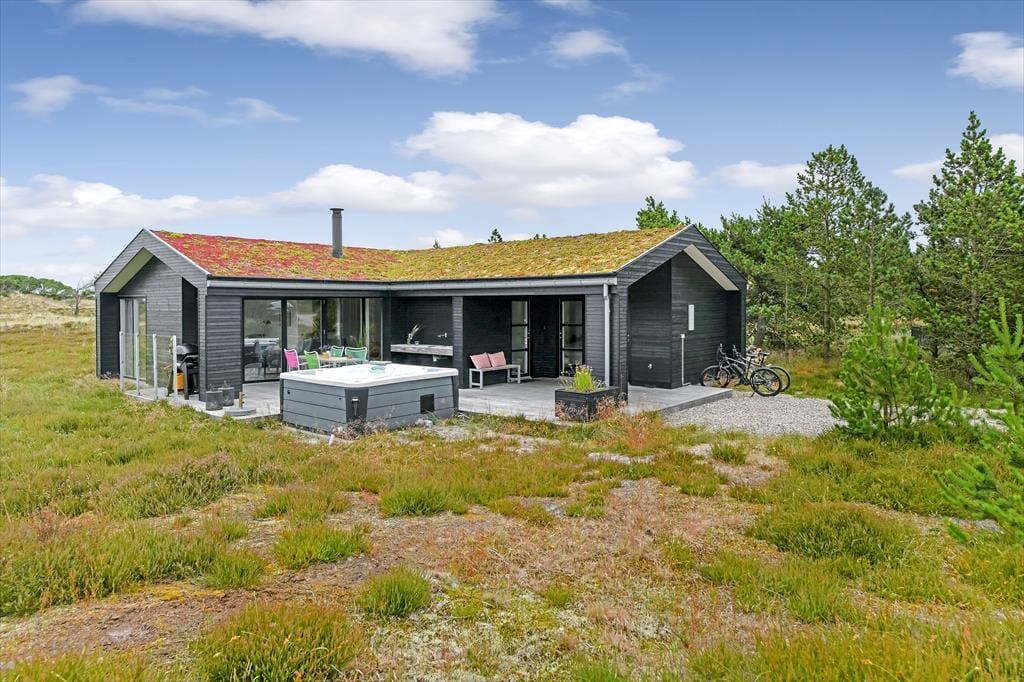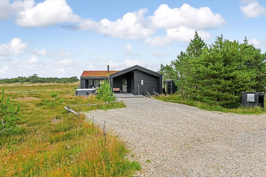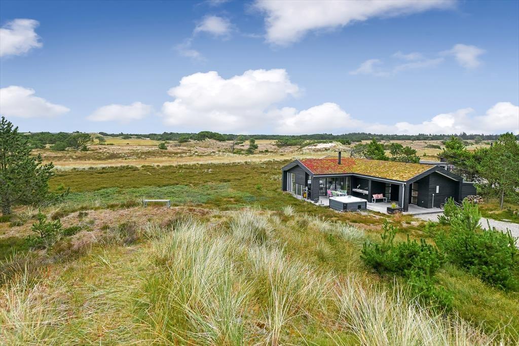 Sommerhuset ligger midt på en stor grund, der prydes af et smukt tæppe af lyng og anden naturskøn bevoksning. Mod nord breder klitheden sig, og sådan en udsigt er umulig at blive træt af, så uanset om du sidder i en havestol, på udsigtsbænken eller i det udendørs spabad har du noget skønt at kigge på. Med fuglesang fra fyrretræerne og klithedens dufte er det ikke kun synssansen, der vækkes, og selv når mørket sænker sig over Blåvand, er det herligt at sidde i de fredelige omgivelser – eventuelt på et af de overdækkede terrasseområder, hvis duggen er ved at falde.
