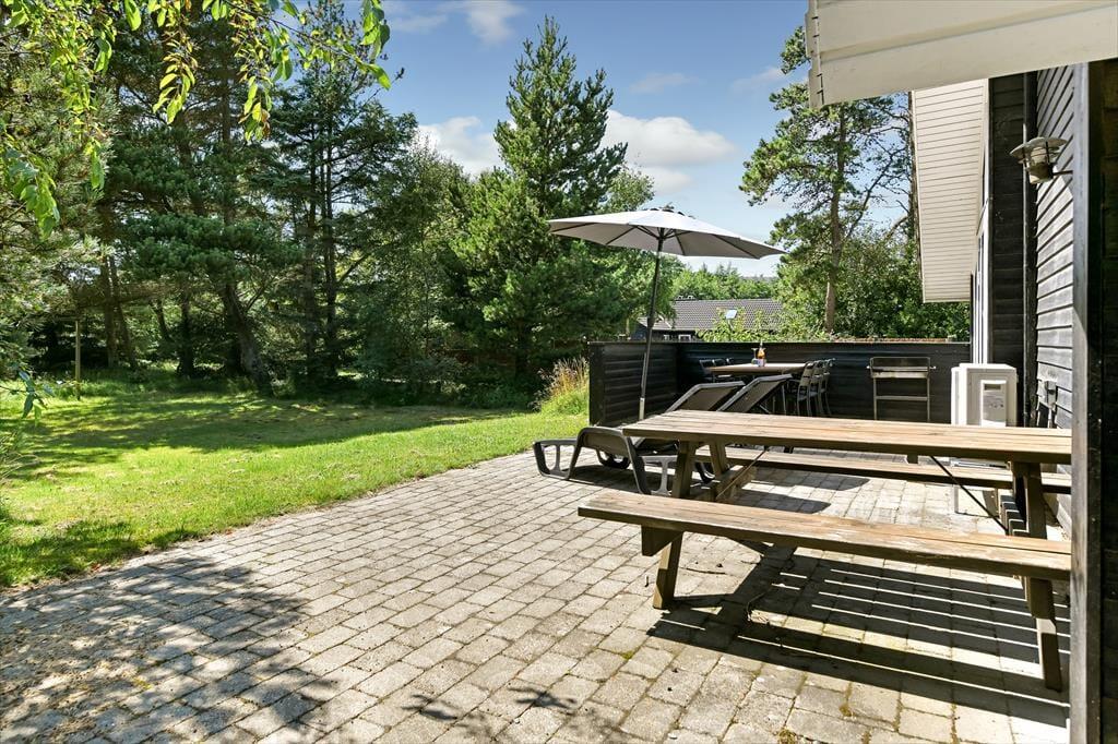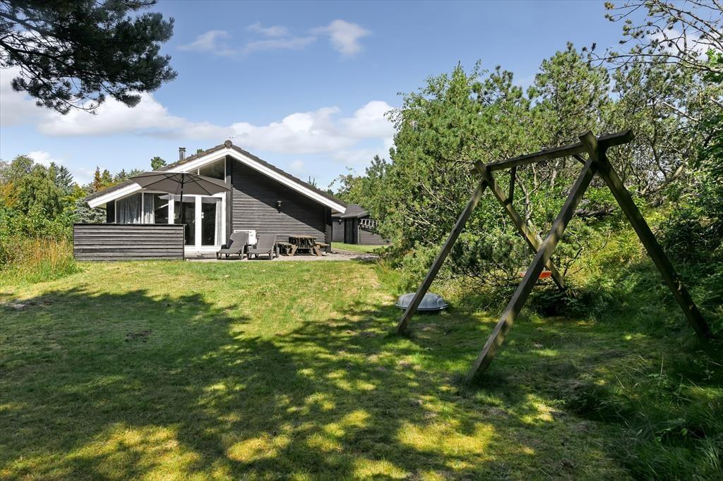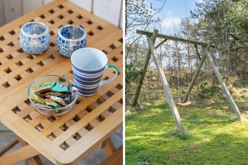 Naturgrunden er stor og køn med sin grønne bevoksning, der blandt andet består af duftende hybenbuske og høje fyrretræer. Der er også en god græsplæne, hvor børnene kan boltre sig – eller de voksne, hvis I er vilde med at spille vikingespil, skyde til måls og kaste med frisbee. Grundens gyngestativ og lille sandkasse er nu nok kun for de yngste, mens både store og små kan glæde sig over det store flisebelagte terrassemiljø, der byder på flere dejlige opholdspladser. Her kan du og familien samles til morgenmad med fuglesang fra trætoppene, solbeskinnede frokoster og friskgrillet aftensmad.