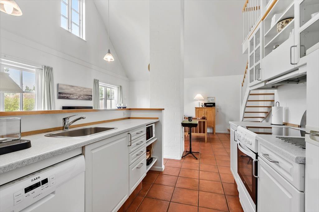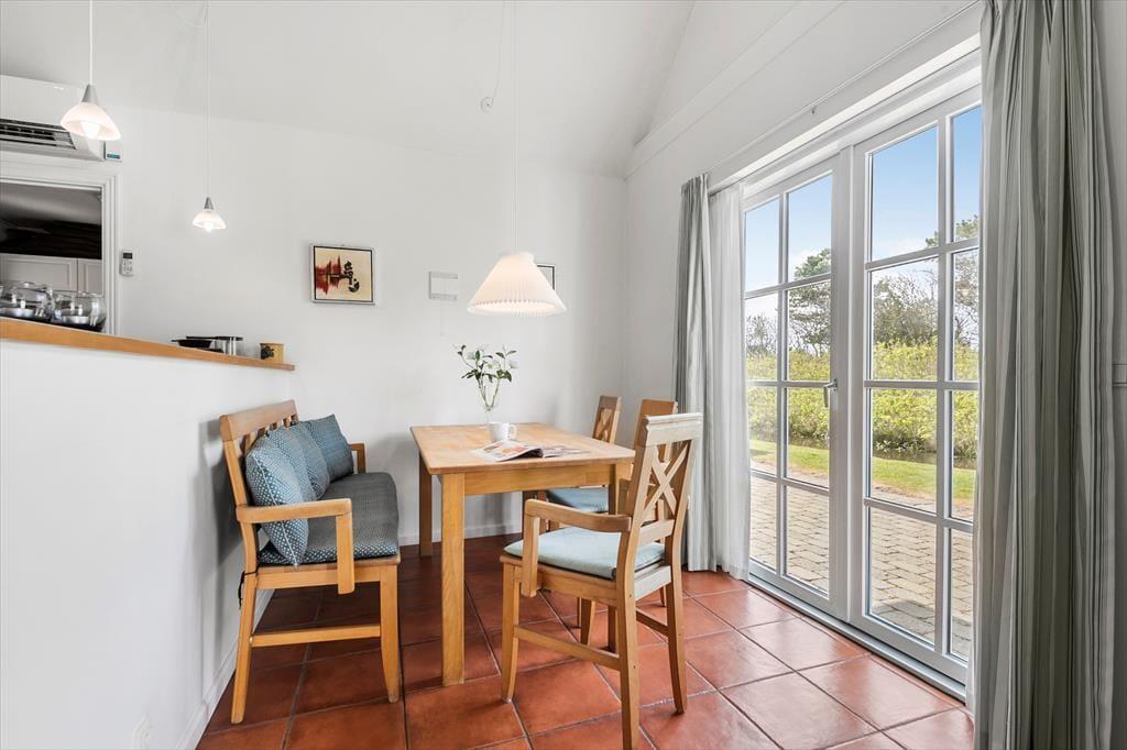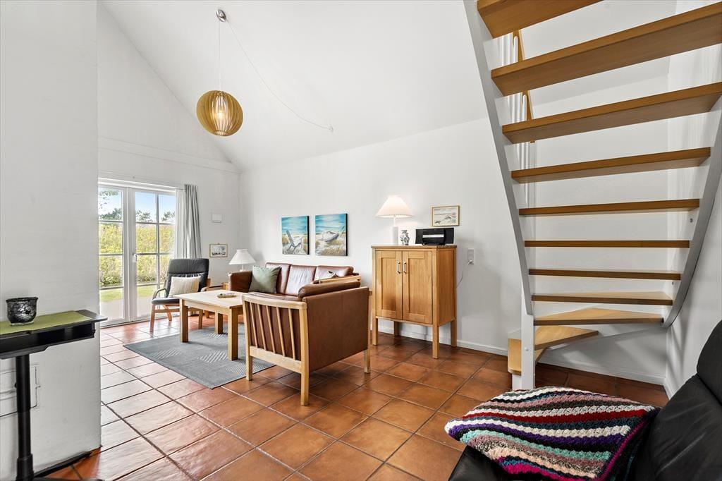 Der er noget svensk landidyl over de udendørs omgivelser, når man ser rækkehusenes charmerende træfacader og det lille vandløb, der risler i baghaven, men huset ligger altså midt i Blåvand. Vandet kan du nyde synet af, når du slapper af på terrassen – og udearealet er vestvendt, så du kan passende sidde her i solen om eftermiddagen og aftenen, når du er vendt hjem fra dagens små og store udflugter. Omgivelserne er rolige i det lukkede område, og derfor kan det af og til være helt svært at forstå, hvor centralt huset egentlig ligger.