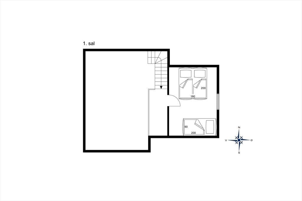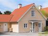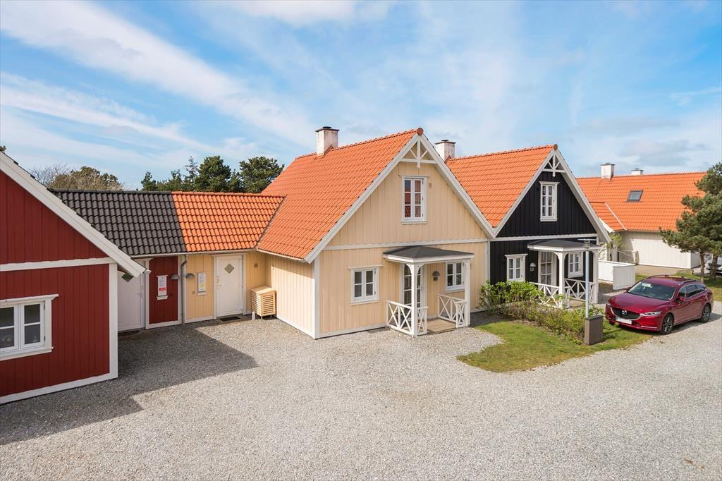 Sammen med de andre farvestrålende feriehuse i bebyggelsen lyser dette op med sin gule facade og sit røde tegltag. Inden døre er der loft til kip og brændeovn i stuen, og et åbent køkken er integreret i rummet, så du ubesværet kan fortsætte hyggesnakken, selvom du selv eller din kære går i gang med at lave kaffe eller forberede aftensmaden. I bestemmer selv, om I vil snakke eller sidde helt i ro, når det er tid til et varmt spabad eller en tur i saunaen – begge dele findes på badeværelset, hvor du selvfølgelig også kan tage et brusebad, hvis du trænger til at blive kvikket op om morgenen. Soveværelser er der to af, hvoraf det ene er placeret på førstesalen.