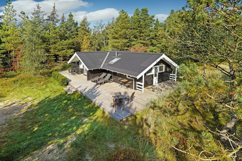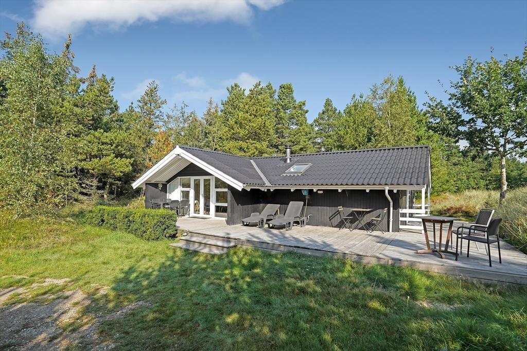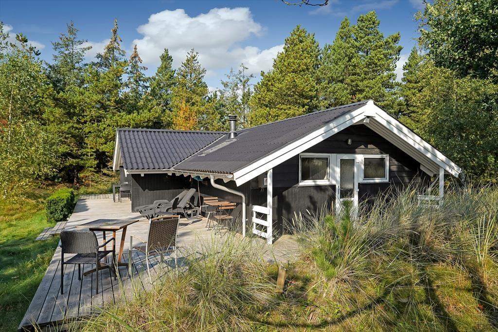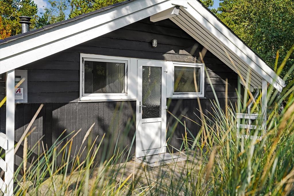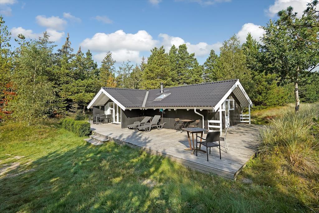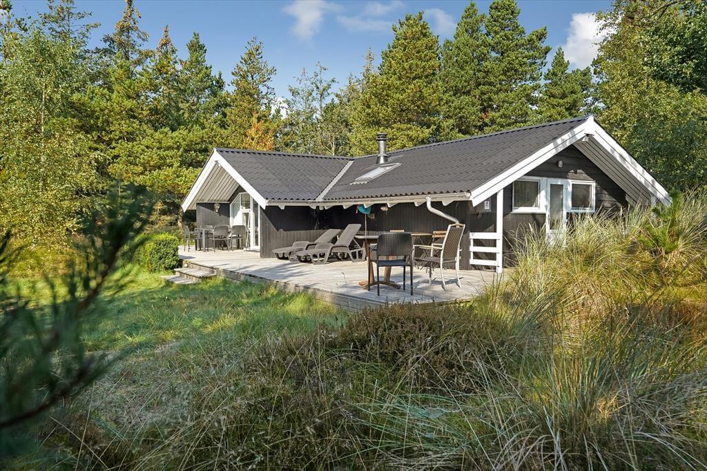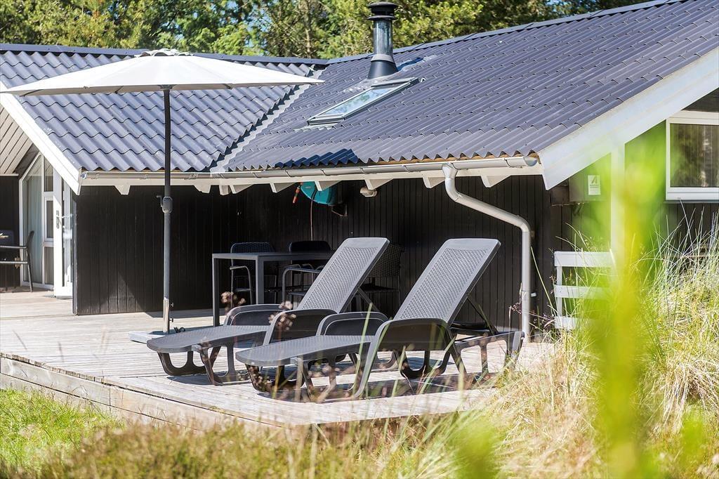 Med sin sortmalede træfacade og sit levende tag passer sommerhuset perfekt ind på den store naturgrund, der prydes af høje nåletræer, lilla lyng og anden typisk bevoksning. Rundt om huset breder en delvist overdækket træterrasse sig, og her er der flere gode opholdspladser at vælge imellem – så både morgenkaffen, solskinsfrokosten og de langstrakte aftensmåltider kan oplagt indtages her i de fredelige omgivelser. Der er en havegrill til rådighed, og det gør det muligt at tilberede maden under åben himmel, når du vender hjem med gode råvarer fra Blåvands fiskehandler, slagter eller supermarked.