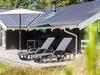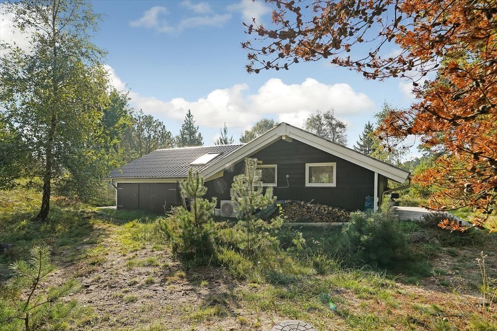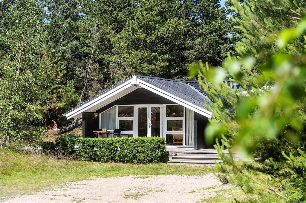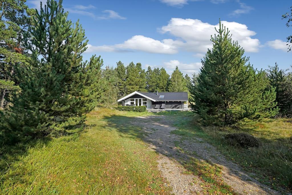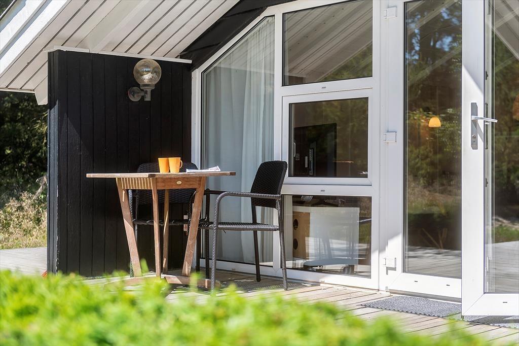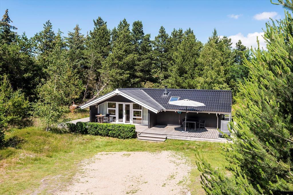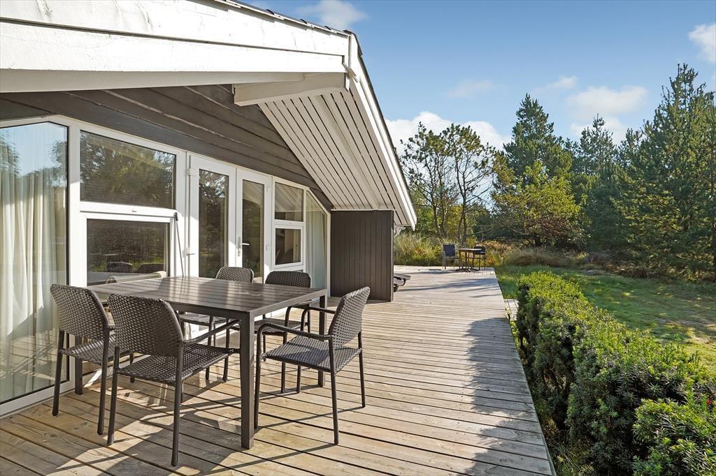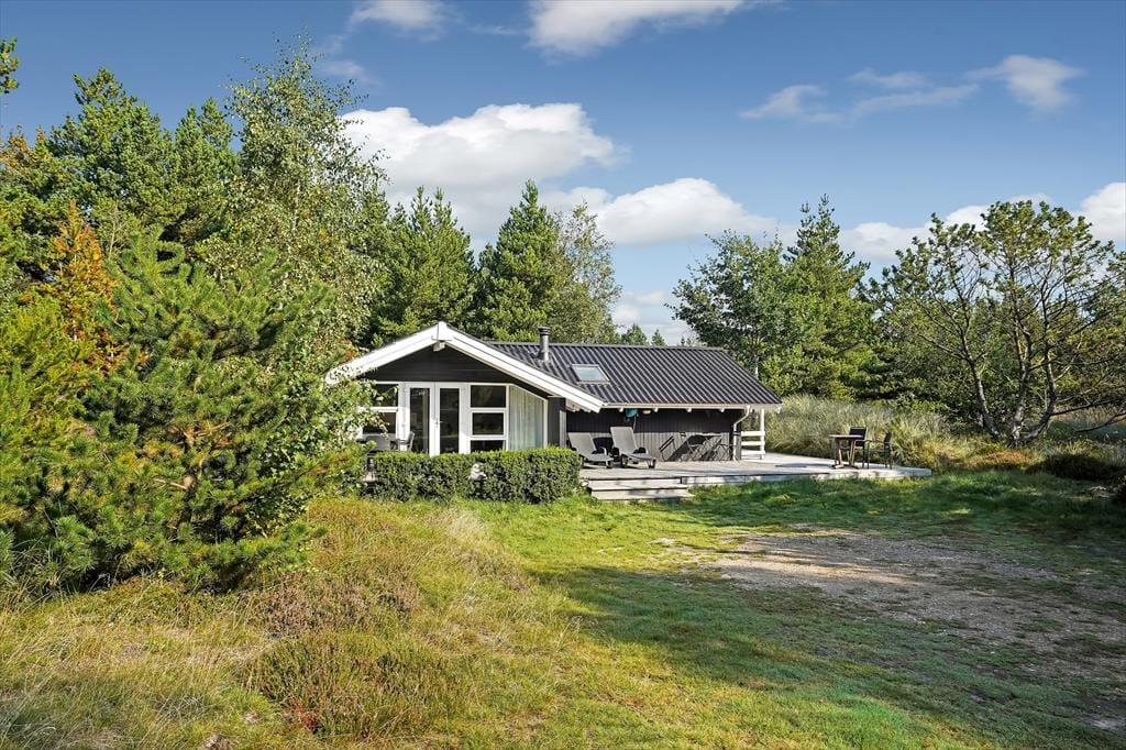 Med sin sortmalede træfacade og sit levende tag passer sommerhuset perfekt ind på den store naturgrund, der prydes af høje nåletræer, lilla lyng og anden typisk bevoksning. Rundt om huset breder en delvist overdækket træterrasse sig, og her er der flere gode opholdspladser at vælge imellem – så både morgenkaffen, solskinsfrokosten og de langstrakte aftensmåltider kan oplagt indtages her i de fredelige omgivelser. Der er en havegrill til rådighed, og det gør det muligt at tilberede maden under åben himmel, når du vender hjem med gode råvarer fra Blåvands fiskehandler, slagter eller supermarked.