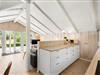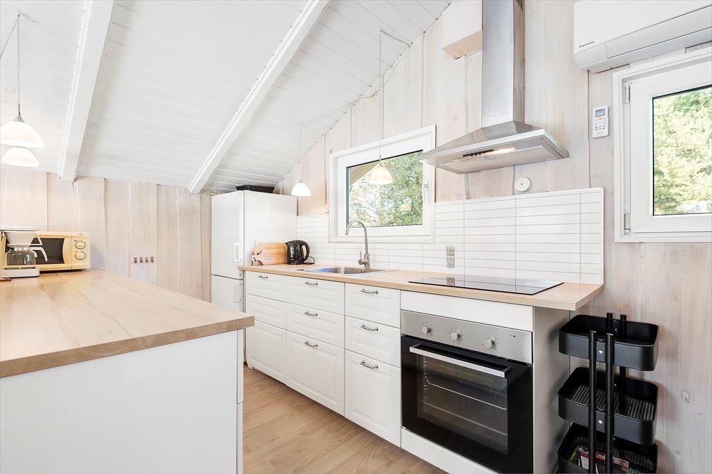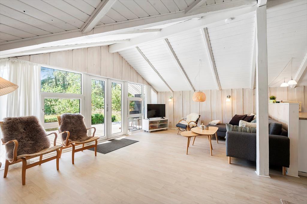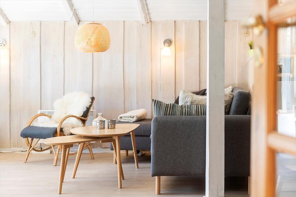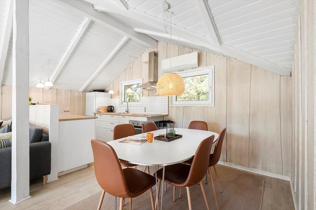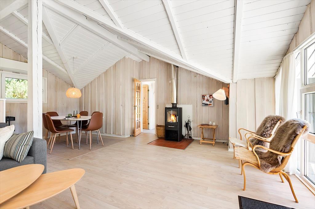 Da sommerhuset senest blev renoveret, lykkedes det ejerne at opdatere rummene, så de fremstår lyse og indbydende, og samtidig er den oprindelige charme fint bevaret. Der er træbeklædte vægge og loft til kip, og i stuen står en brændeovn, som du kan tænde op i, hvis du vil fylde huset med varme og hyggestemning. I det åbne køkken kan du forberede morgenmaden og forkæle din familie med lækkerier hele dagen lang – og så er det måske op til vejret og jeres humør, om måltiderne skal serveres ved stuens spisebord eller ude på den dejlige terrasse.