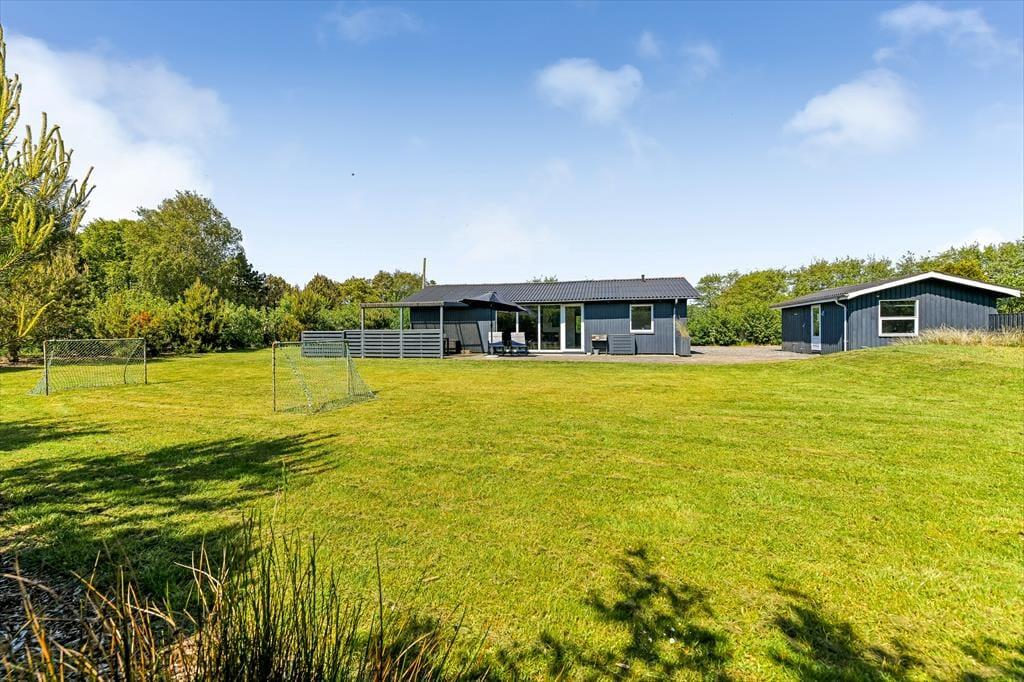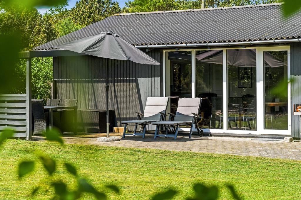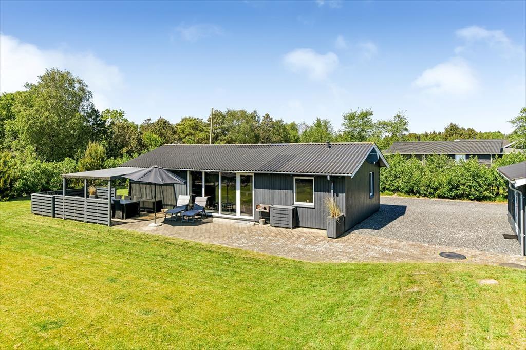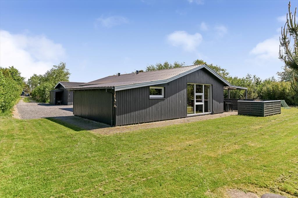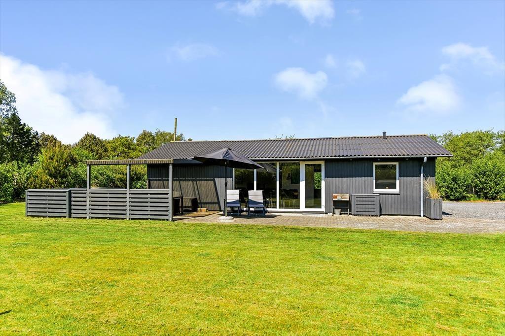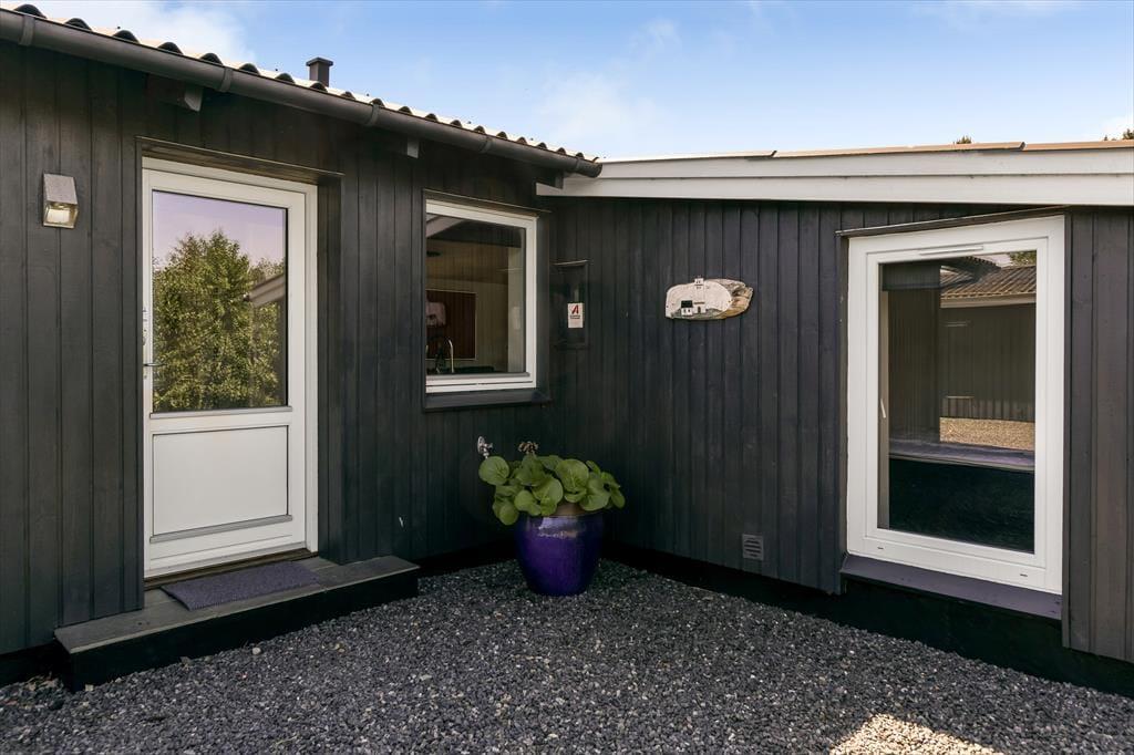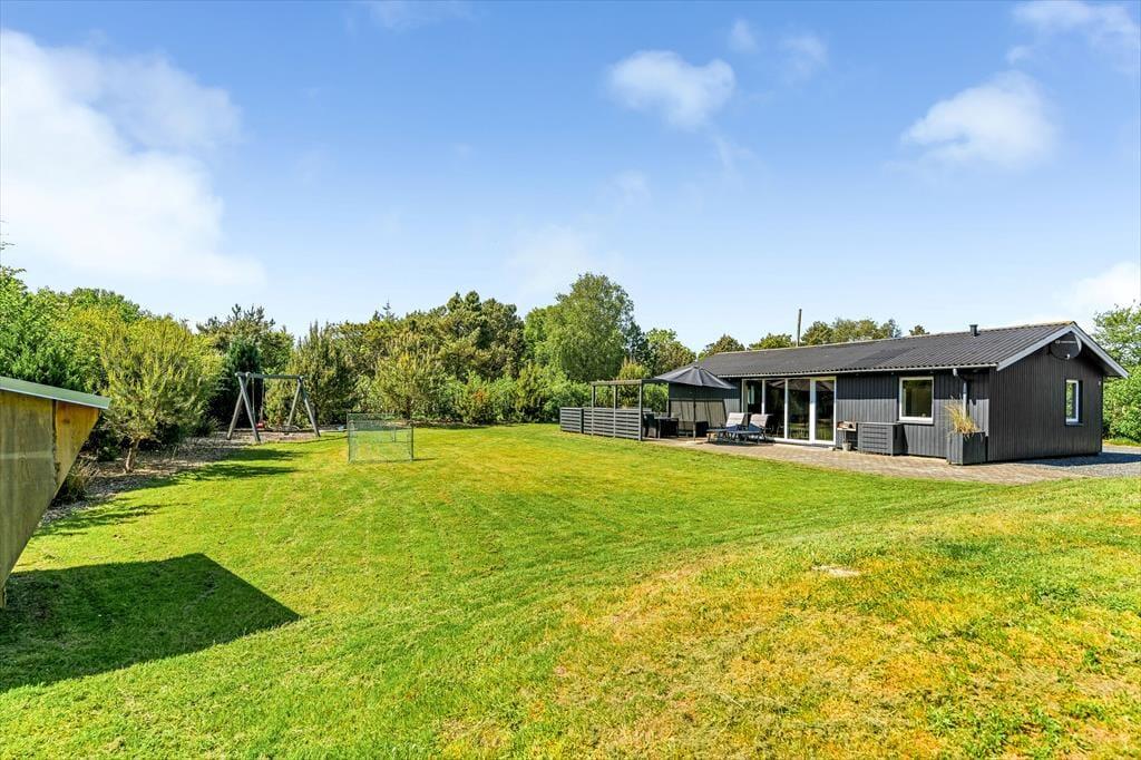 Sommerhuset ligger på en 1512 m2 stor grund, der prydes af kønne bede og skærmes af grønne løvtræer. Den sydvendte terrasse er delvist overdækket, så du kan vælge mellem både skygge og sol, når du vil slappe af i en havestol eller samles med familien til et lækkert måltid i det fri. De yngste feriegæster har både gynger og en sandkasse at lege med, og måske kan børnene få overtalt de voksne til at stå på mål, når der skal spilles fodboldkamp på græsplænen. På grusarealet foran sommerhuset er der god plads til at parkere en eller flere biler.