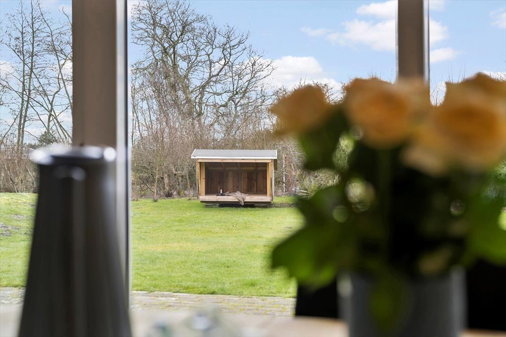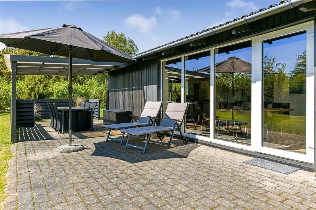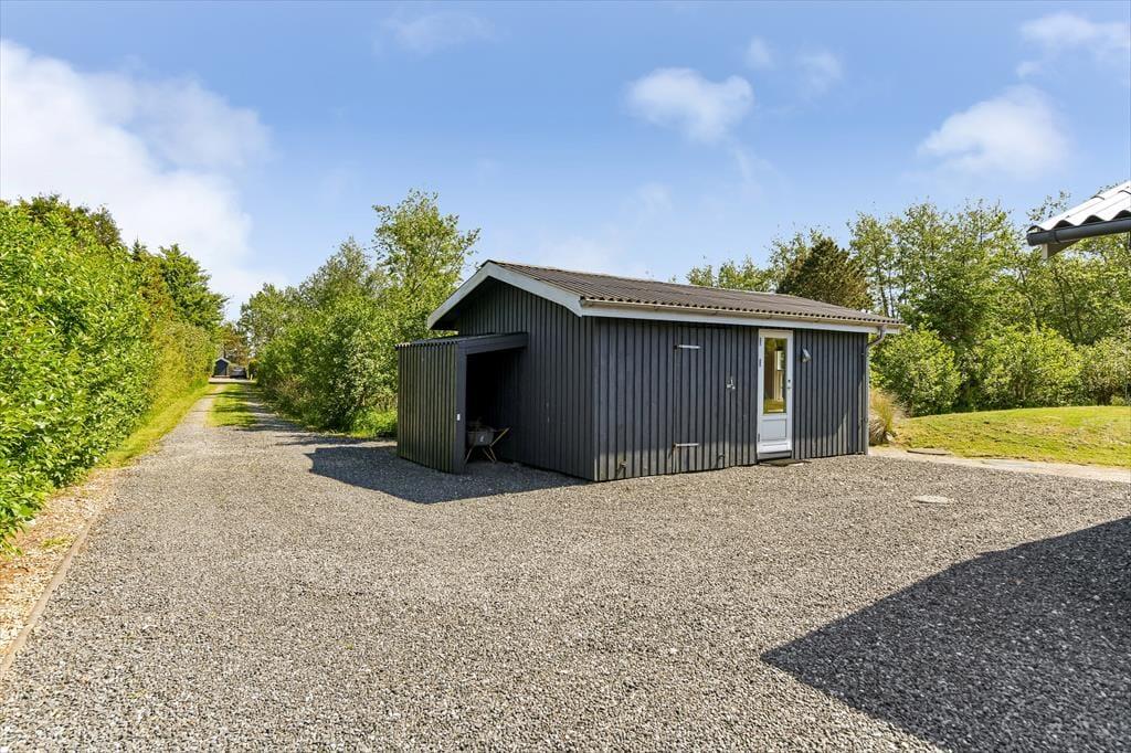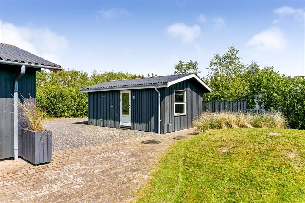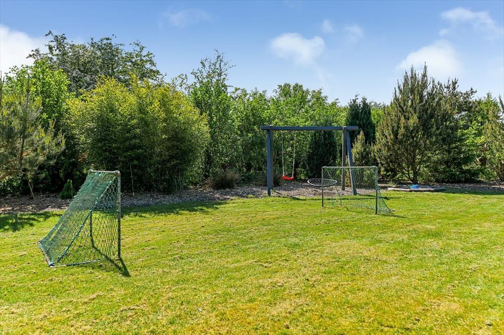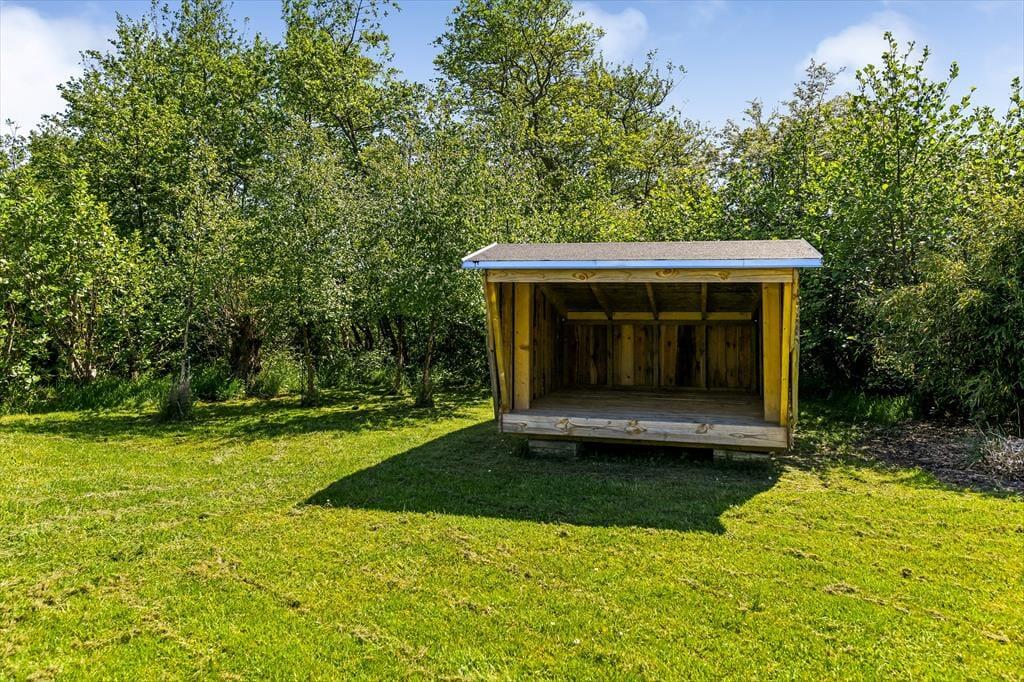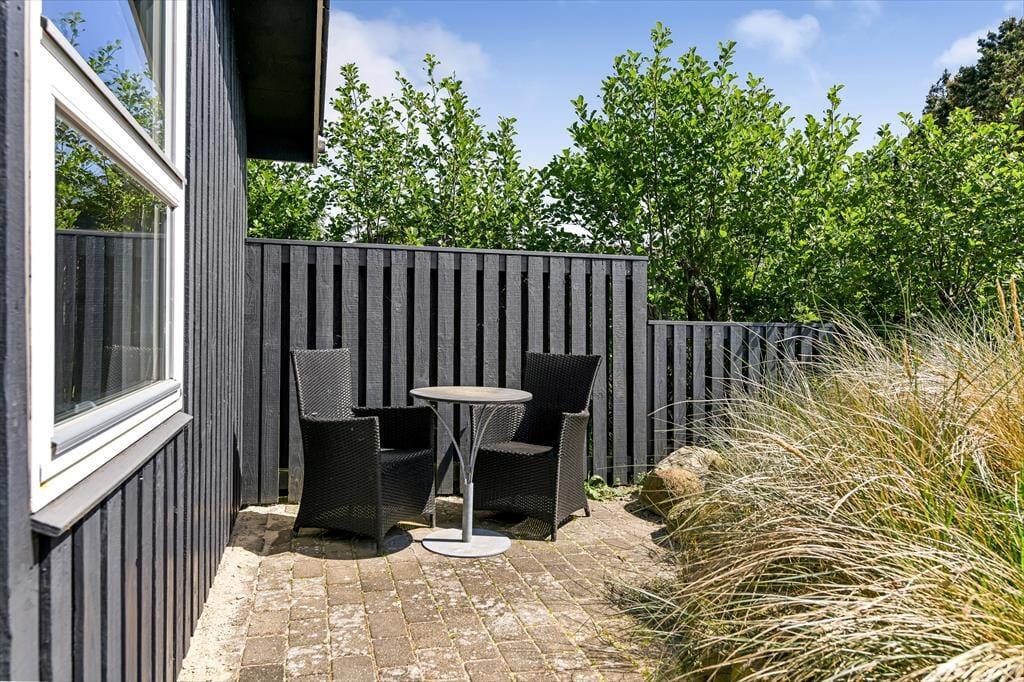 Sommerhuset ligger på en 1512 m2 stor grund, der prydes af kønne bede og skærmes af grønne løvtræer. Den sydvendte terrasse er delvist overdækket, så du kan vælge mellem både skygge og sol, når du vil slappe af i en havestol eller samles med familien til et lækkert måltid i det fri. De yngste feriegæster har både gynger og en sandkasse at lege med, og måske kan børnene få overtalt de voksne til at stå på mål, når der skal spilles fodboldkamp på græsplænen. På grusarealet foran sommerhuset er der god plads til at parkere en eller flere biler.