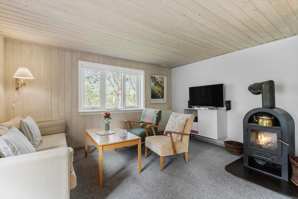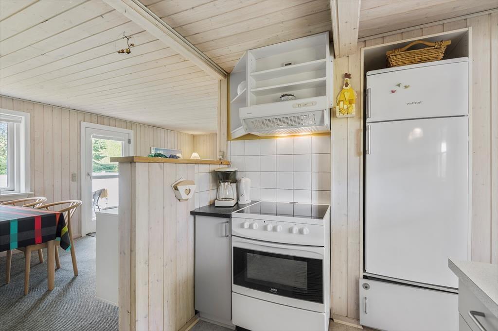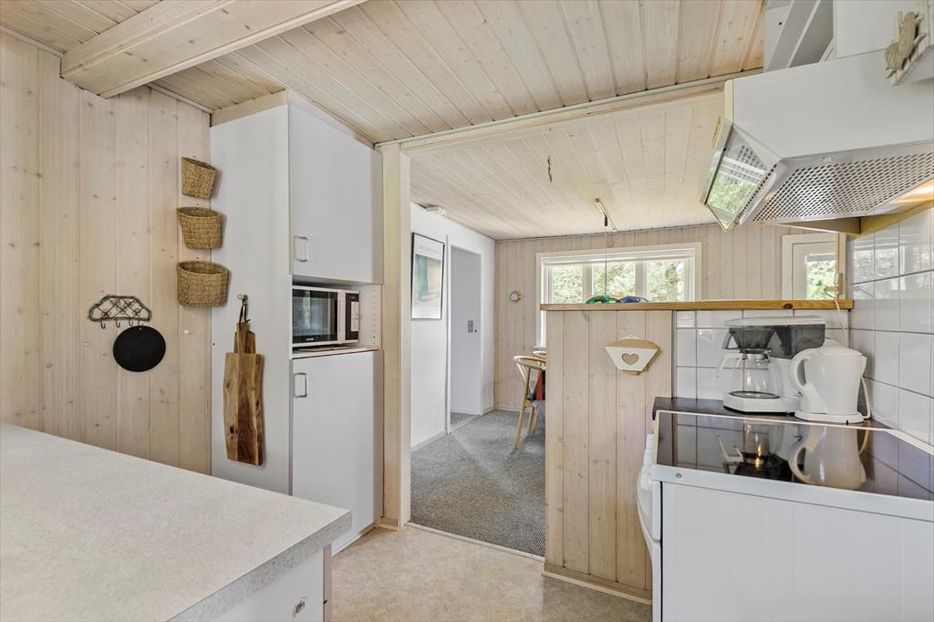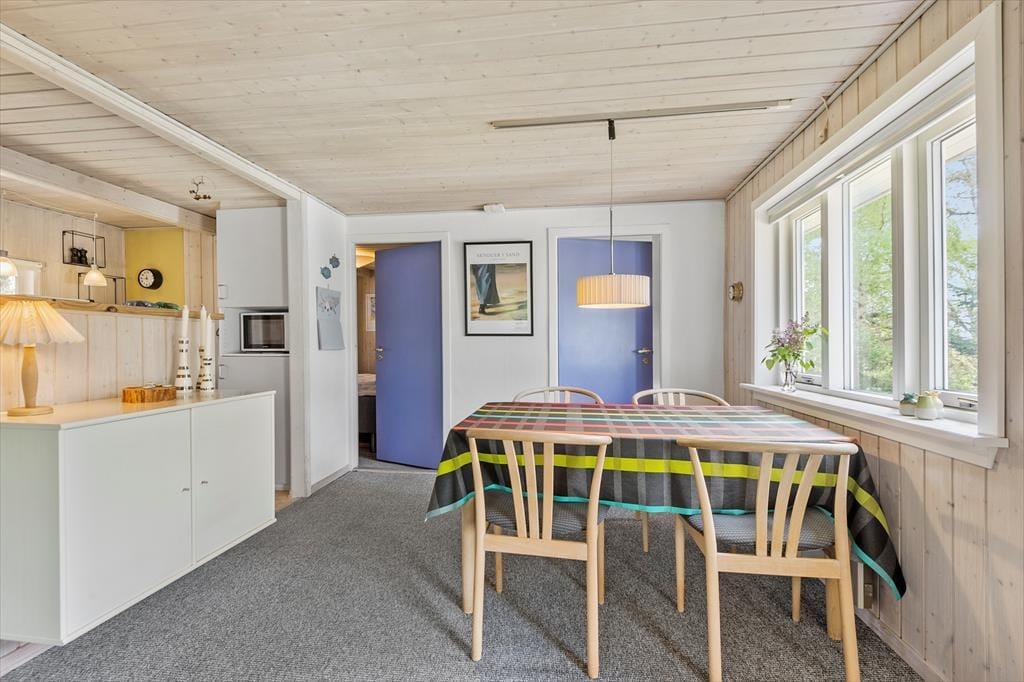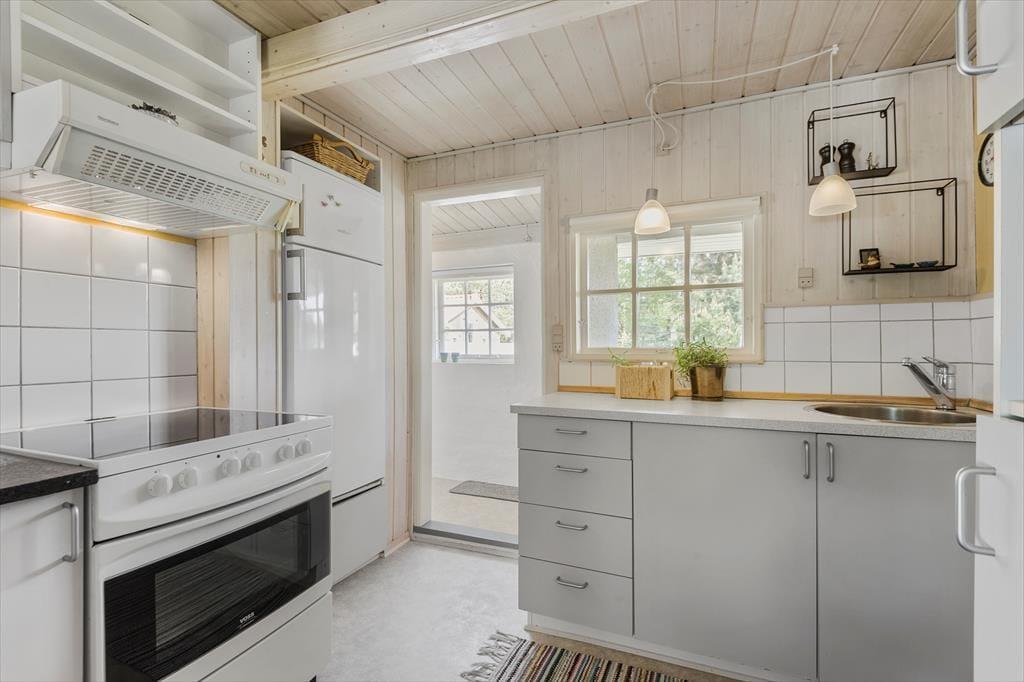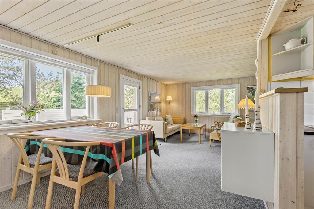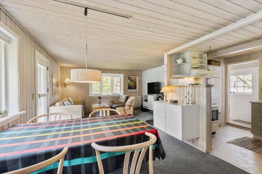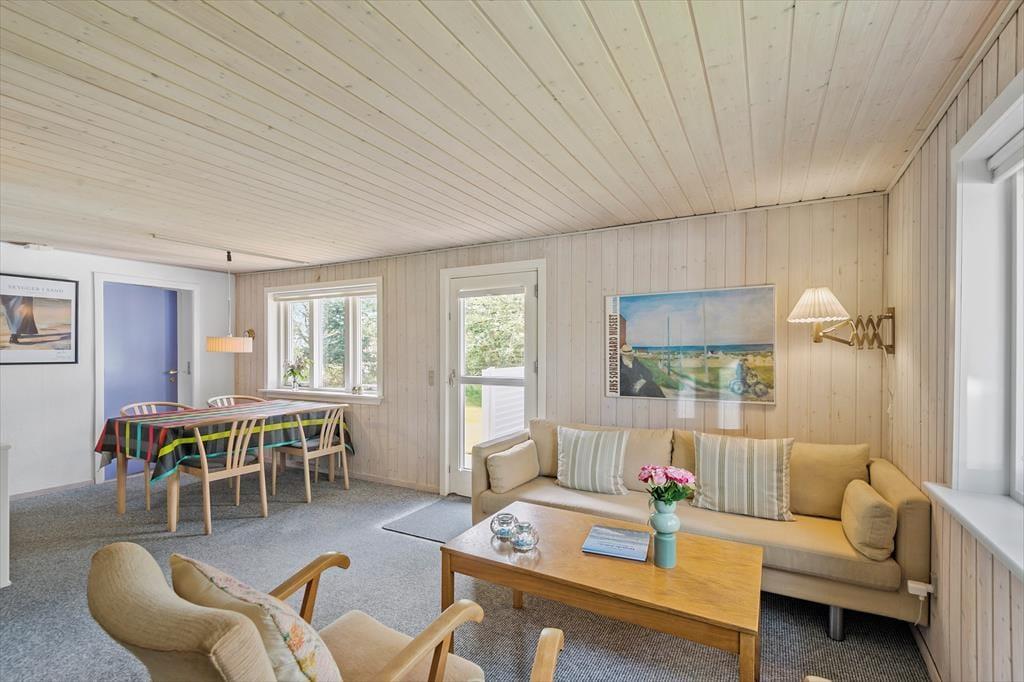 Med sin rare atmosfære og gode planløsning fungerer sommerhuset som en skøn base for et par eller en lille familie – og hvis du vil på ferie med en ven for at opleve Blåvand og de naturskønne omgivelser, kan det også fint lade sig gøre. Huset byder nemlig på to gode soveværelser og et badeværelse med bruseniche, og endelig er der opholdsrummet, hvor stue og køkken ligger i åben forbindelse. Stuens lyse indretning indbyder til at tage dagene i ro og mag, og centralt i rummet står en effektiv brændeovn, der sammen med varmepumpen sørger for ekstra varme og hyggestemning på eventuelle kølige aftener.