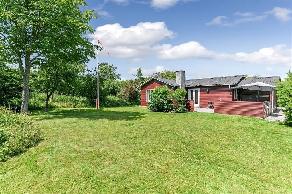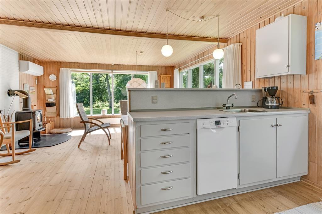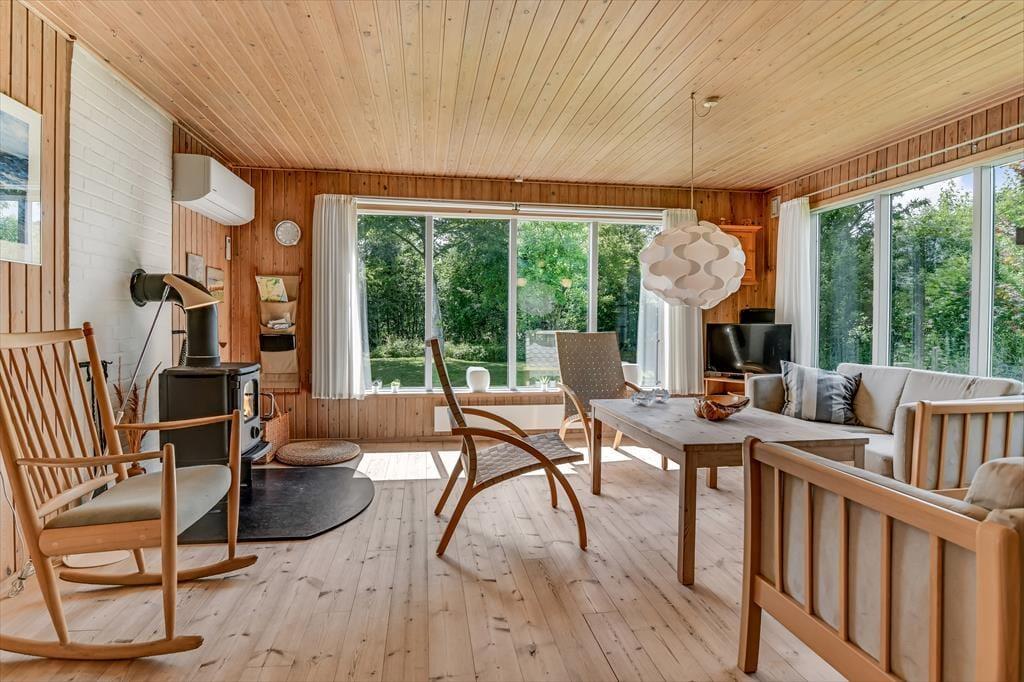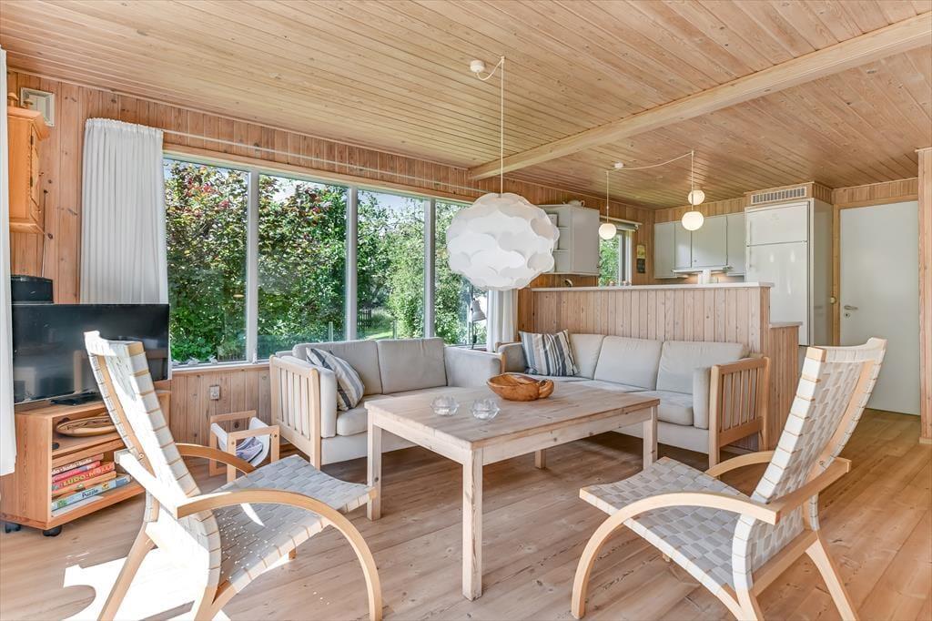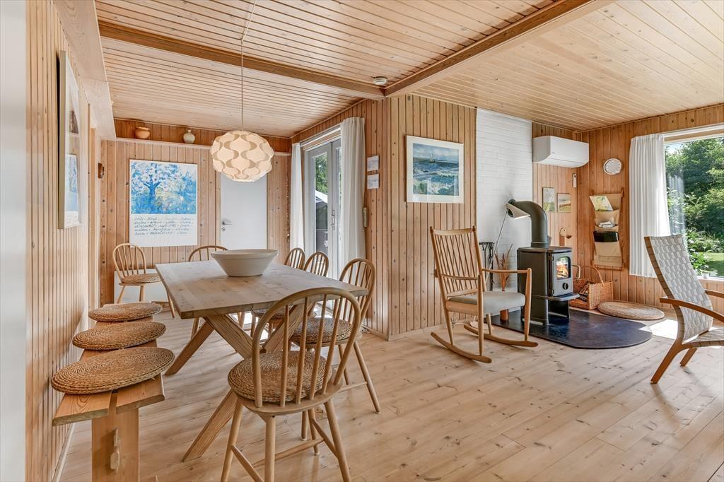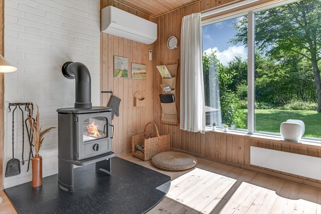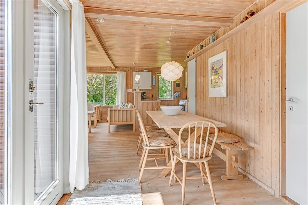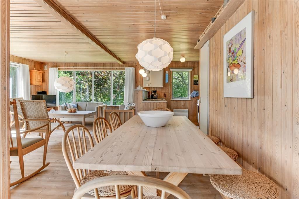 Dette feriehus er af den slags sommerhuse, som fra første øjeblik giver dig lyst til at sidde hyggeligt sammen i komfortabelt tøj i opholdsrummet, læse i fred og spille brætspil i glade omgivelser. Sofagruppen befinder sig lige ved brændeovnen. Ved den hyggelige spiseplads nyder I sammen dagens store og små måltider. Det veludstyrede køkken smelter sammen med opholdsrummet, og således kan du selv under madlavningen nyde nærheden til dine kære og deltage i alle samtaler. Der er tre soveværelser og et badeværelse med bruser, samt en udestue, der blandt andet inviterer til at nyde den første kaffe om morgenen med udsigt til de grønne træer.