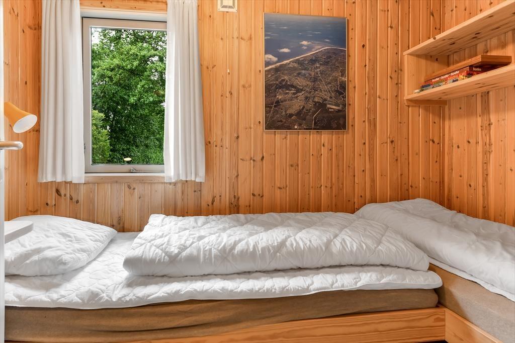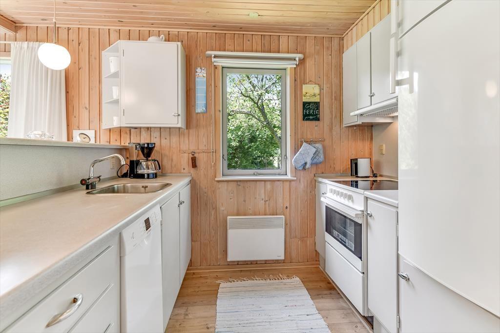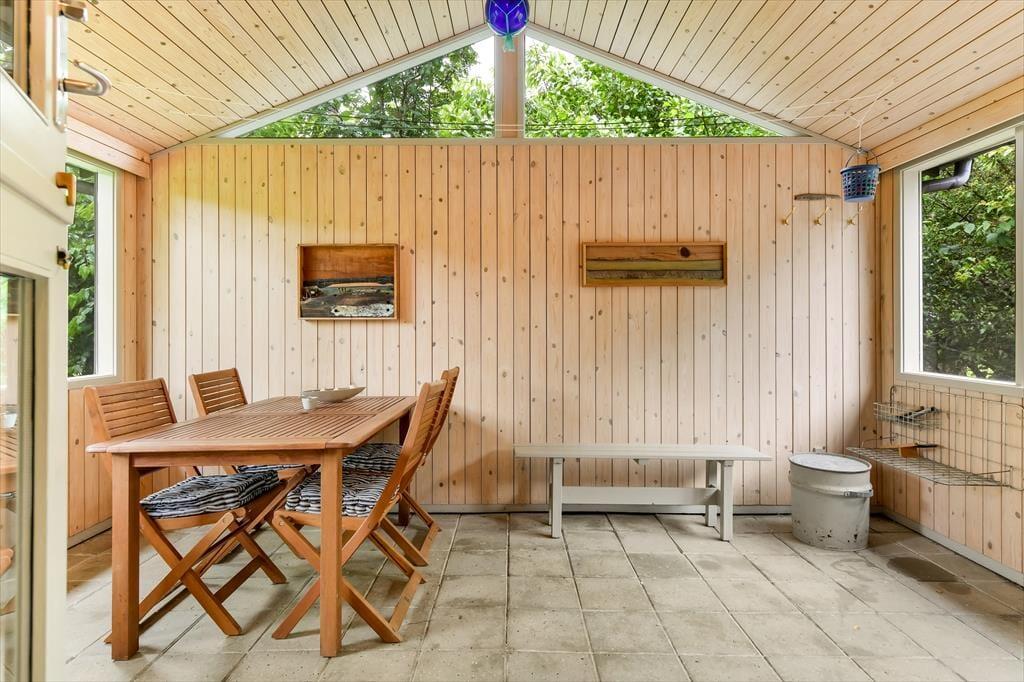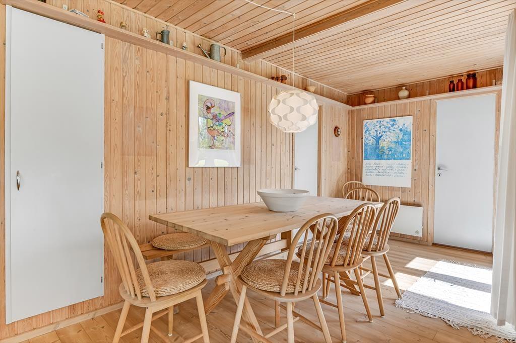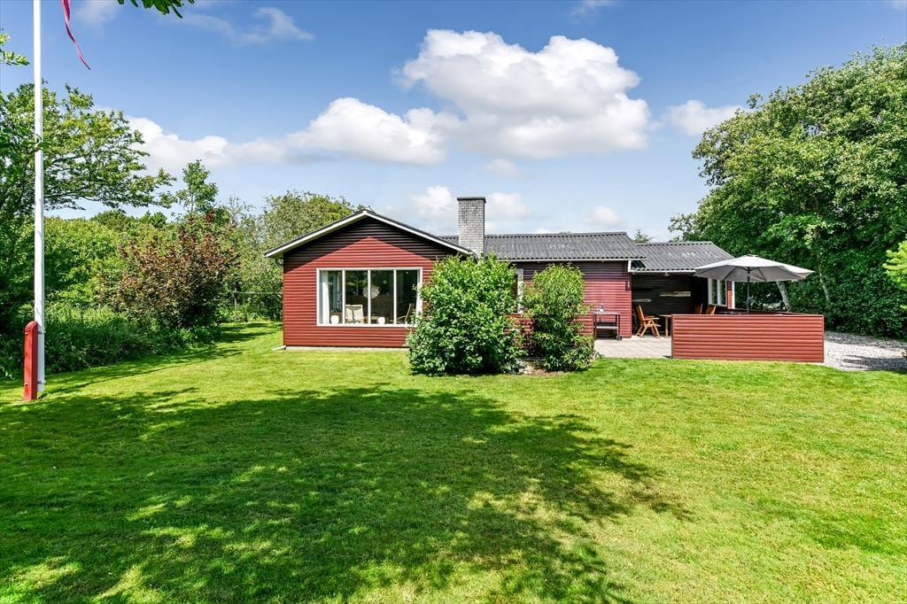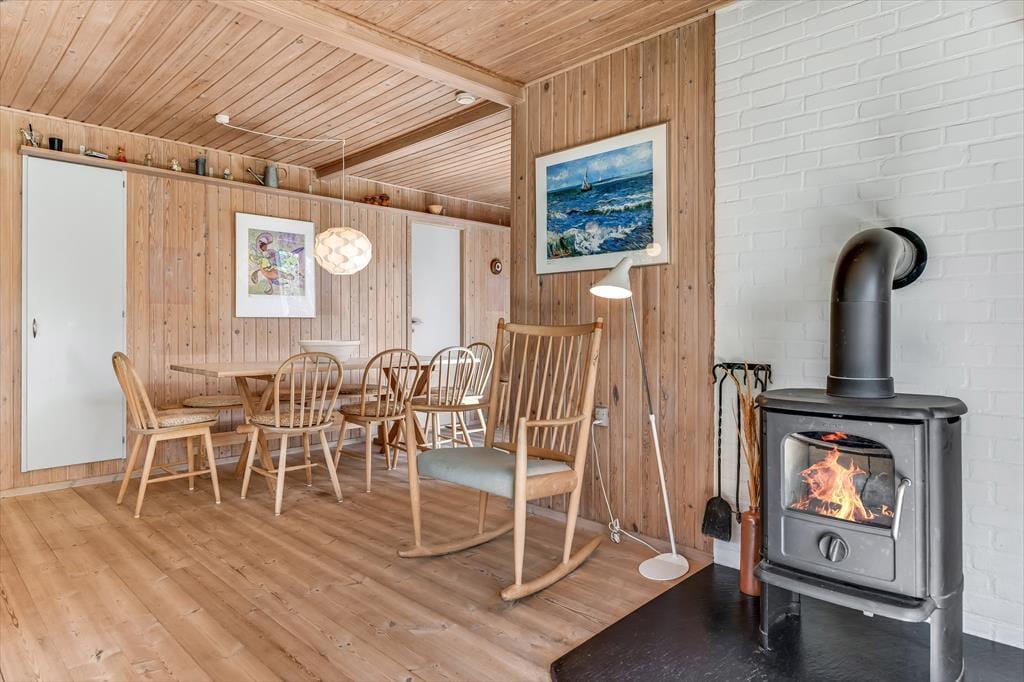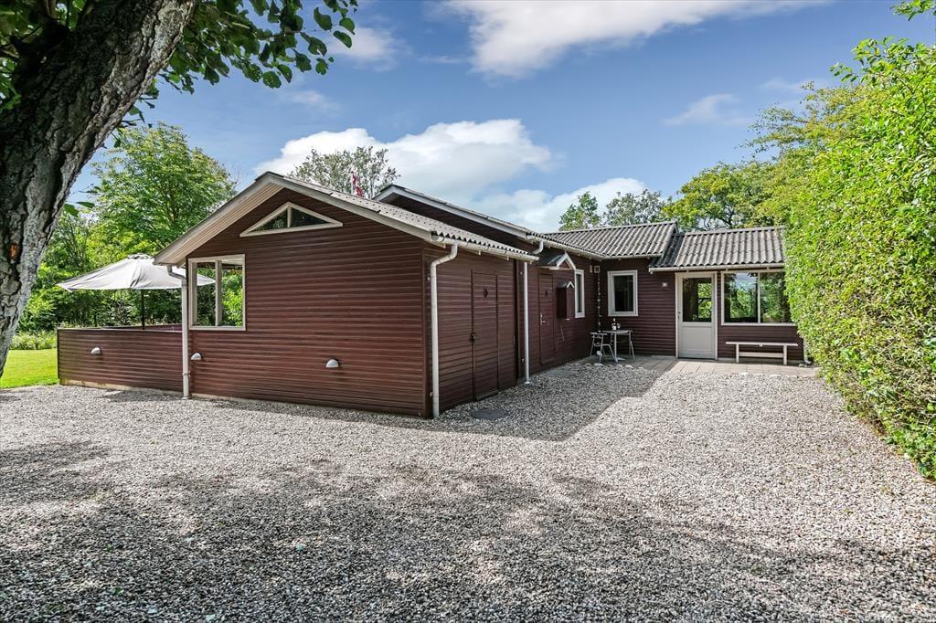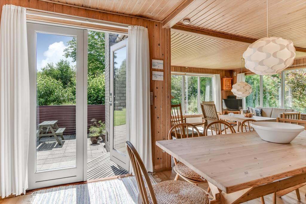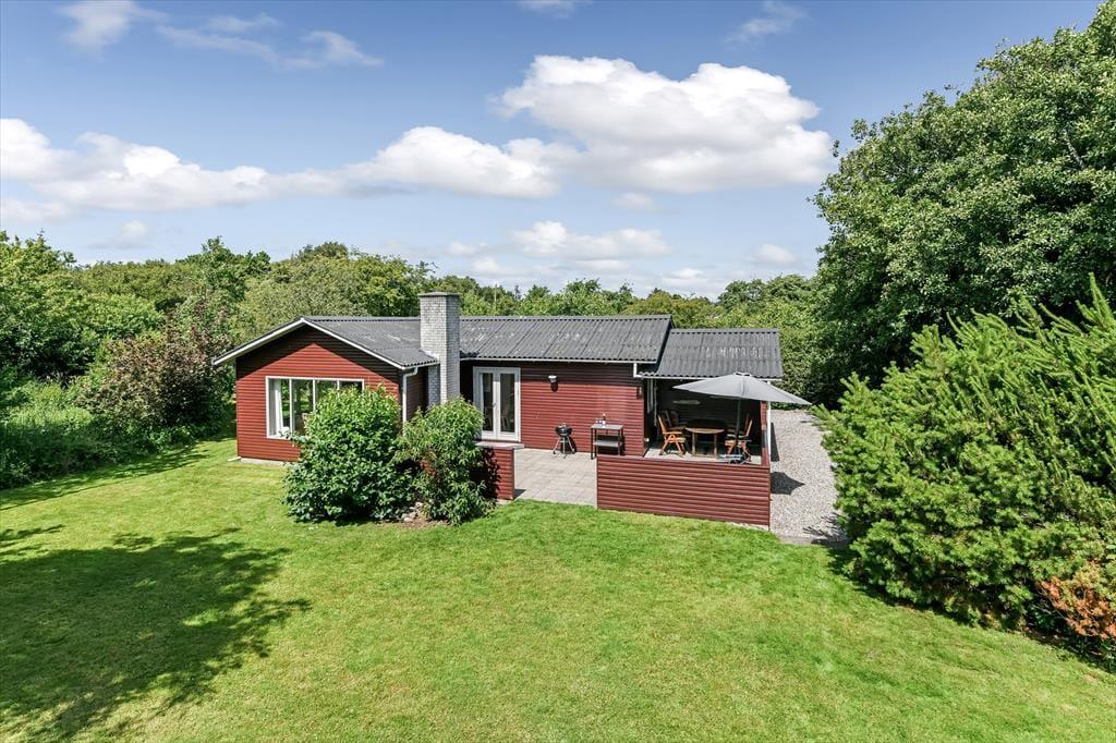 Dette feriehus er af den slags sommerhuse, som fra første øjeblik giver dig lyst til at sidde hyggeligt sammen i komfortabelt tøj i opholdsrummet, læse i fred og spille brætspil i glade omgivelser. Sofagruppen befinder sig lige ved brændeovnen. Ved den hyggelige spiseplads nyder I sammen dagens store og små måltider. Det veludstyrede køkken smelter sammen med opholdsrummet, og således kan du selv under madlavningen nyde nærheden til dine kære og deltage i alle samtaler. Der er tre soveværelser og et badeværelse med bruser, samt en udestue, der blandt andet inviterer til at nyde den første kaffe om morgenen med udsigt til de grønne træer.