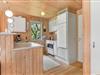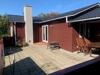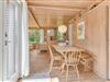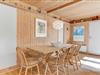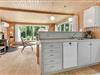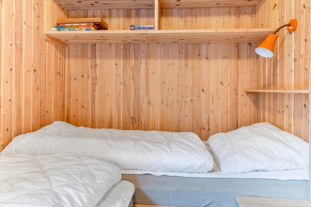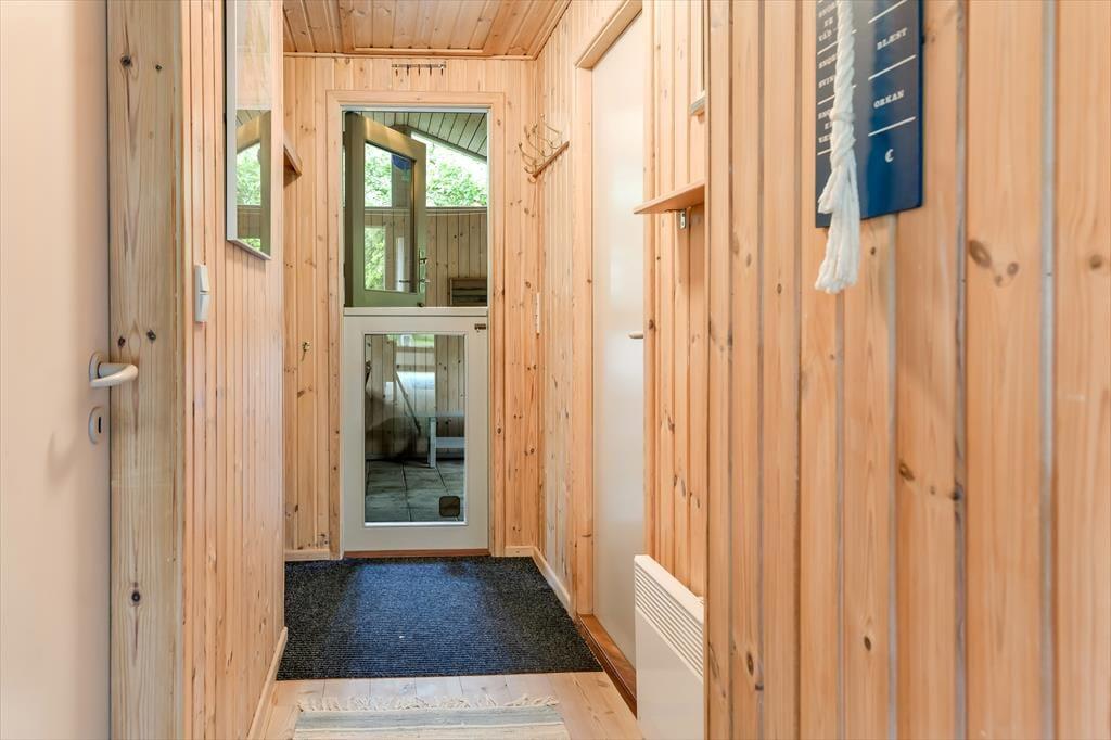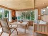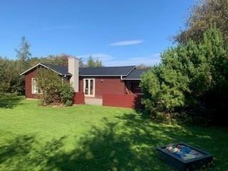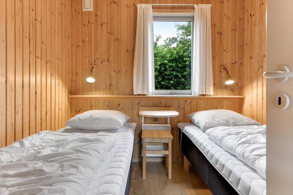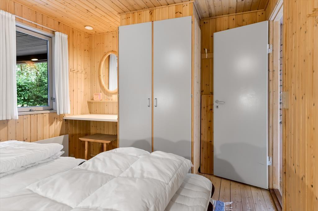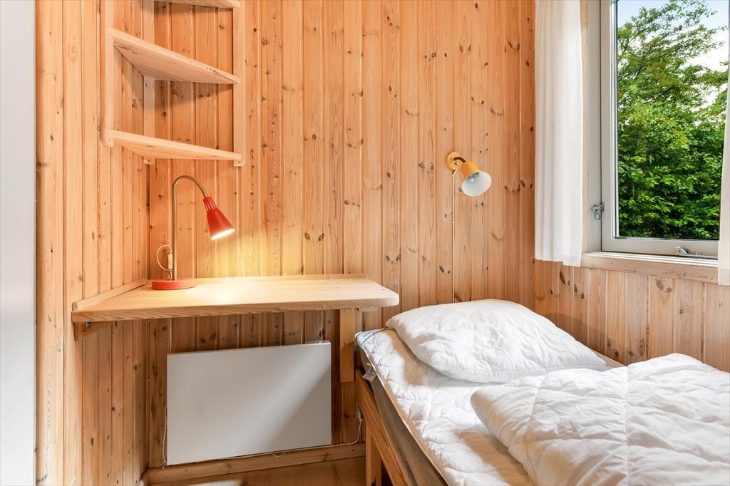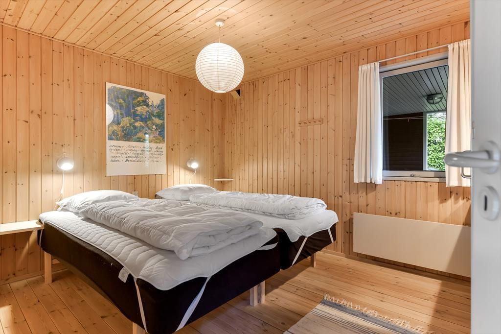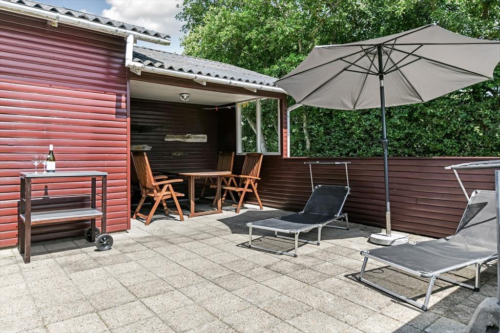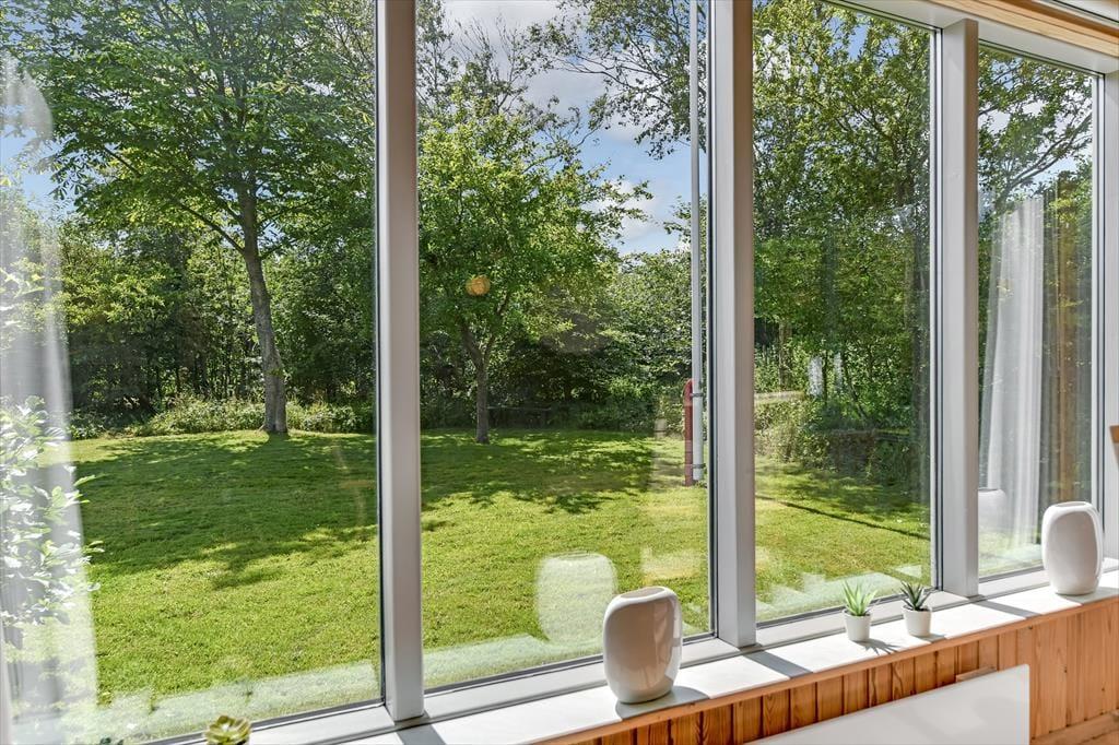 Dette feriehus er af den slags sommerhuse, som fra første øjeblik giver dig lyst til at sidde hyggeligt sammen i komfortabelt tøj i opholdsrummet, læse i fred og spille brætspil i glade omgivelser. Sofagruppen befinder sig lige ved brændeovnen. Ved den hyggelige spiseplads nyder I sammen dagens store og små måltider. Det veludstyrede køkken smelter sammen med opholdsrummet, og således kan du selv under madlavningen nyde nærheden til dine kære og deltage i alle samtaler. Der er tre soveværelser og et badeværelse med bruser, samt en udestue, der blandt andet inviterer til at nyde den første kaffe om morgenen med udsigt til de grønne træer.