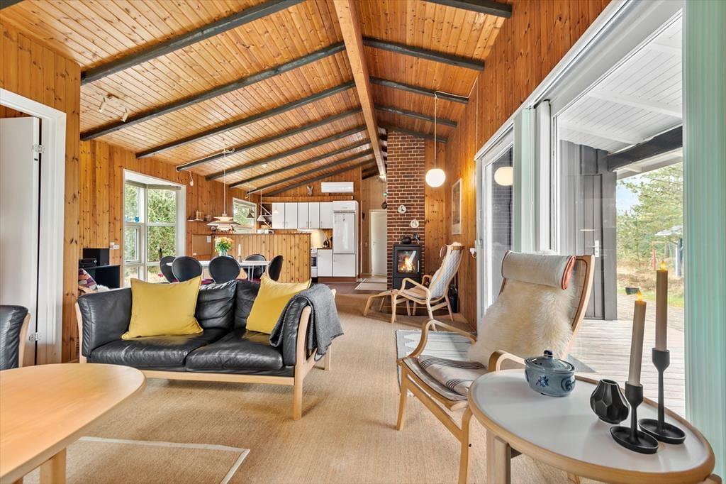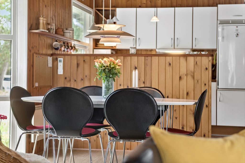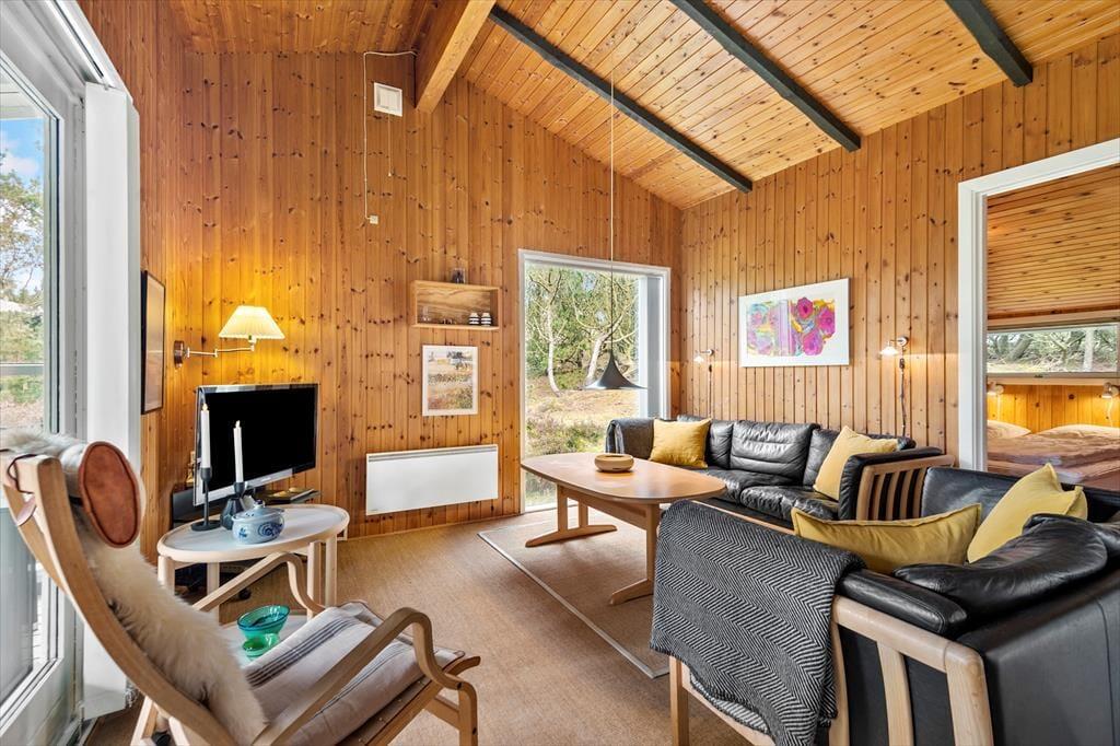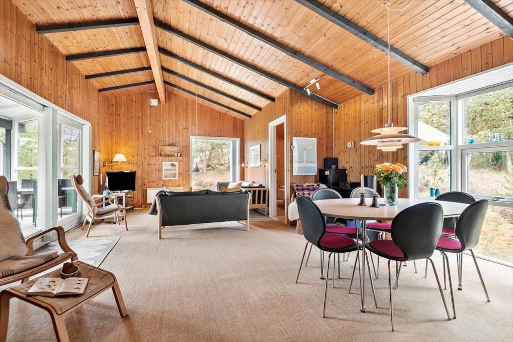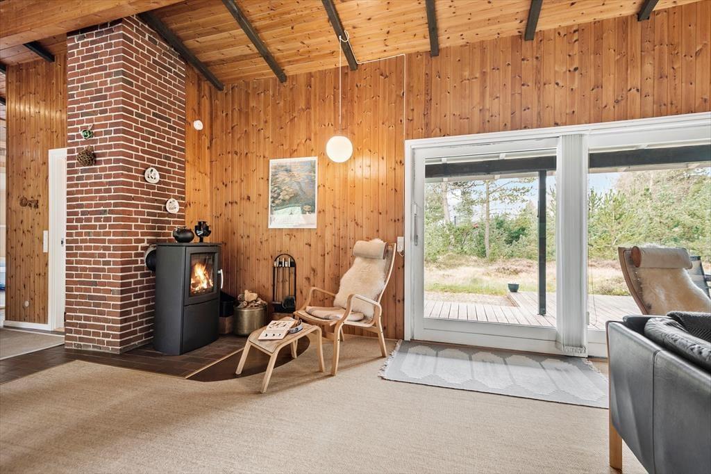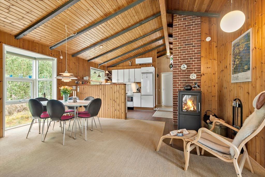 Det er ikke kun husets kønne træfacade, der passer glimrende til de idylliske omgivelser: Inden døre er der umalede trælister på væggene og loft til kip, og også stuens brændeovn er med til at få rummet til at emme af klassisk sommerhuscharme. Der er flere bløde siddepladser at vælge imellem, hvis du har lyst til at tage det helt med ro – og både fra sofaarrangementet og spisebordet har du godt udsyn til naturgrunden, så du kan følge med, hvis et egern eller en fasan pusler rundt udenfor. Såvel badeværelset som de tre soveværelser har en fornuftig størrelse, og som en rar detalje er der en hems i huset, hvor børnene kan folde sig ud med leg og læsning.